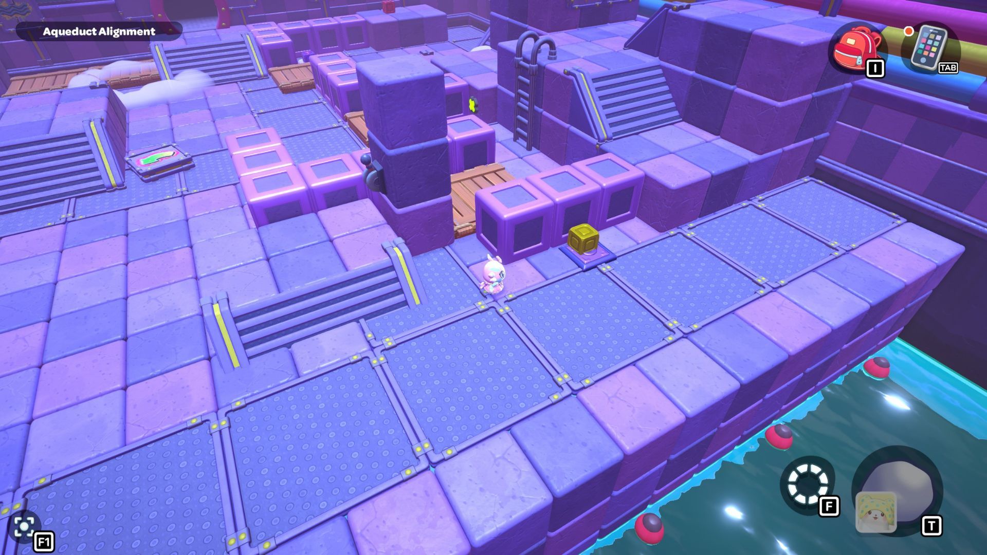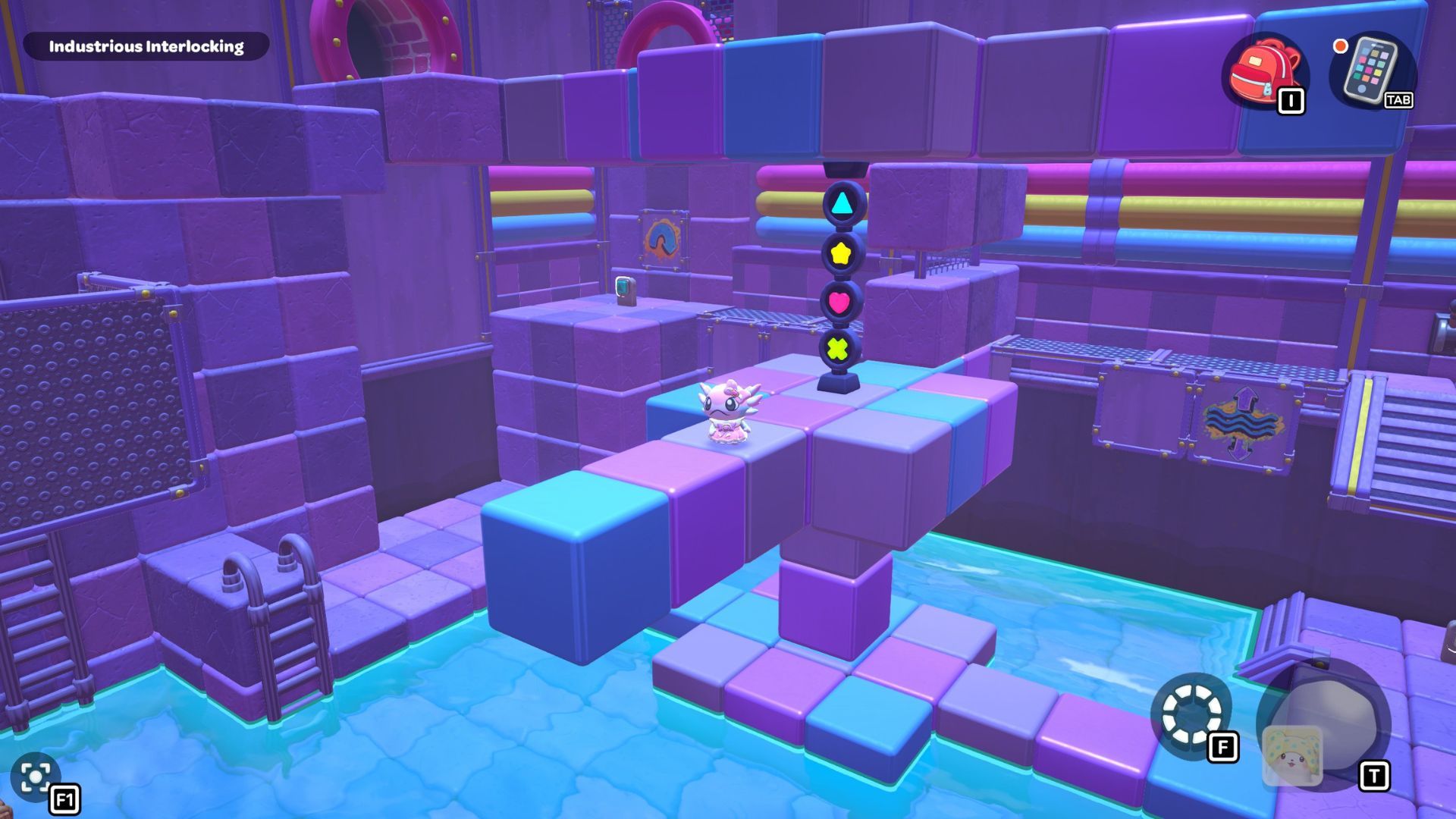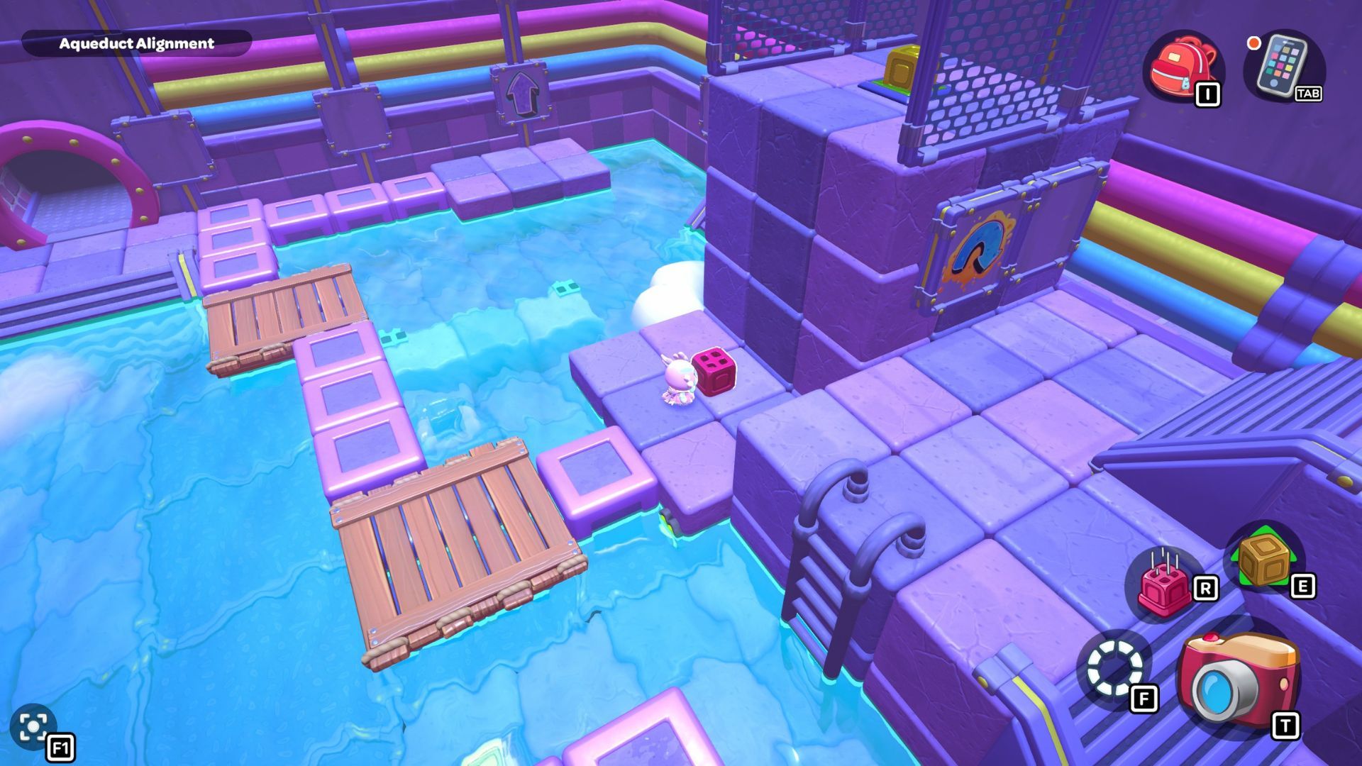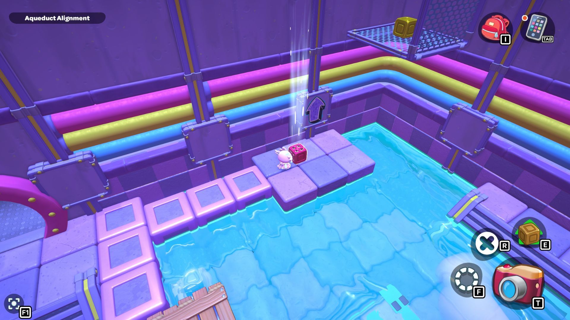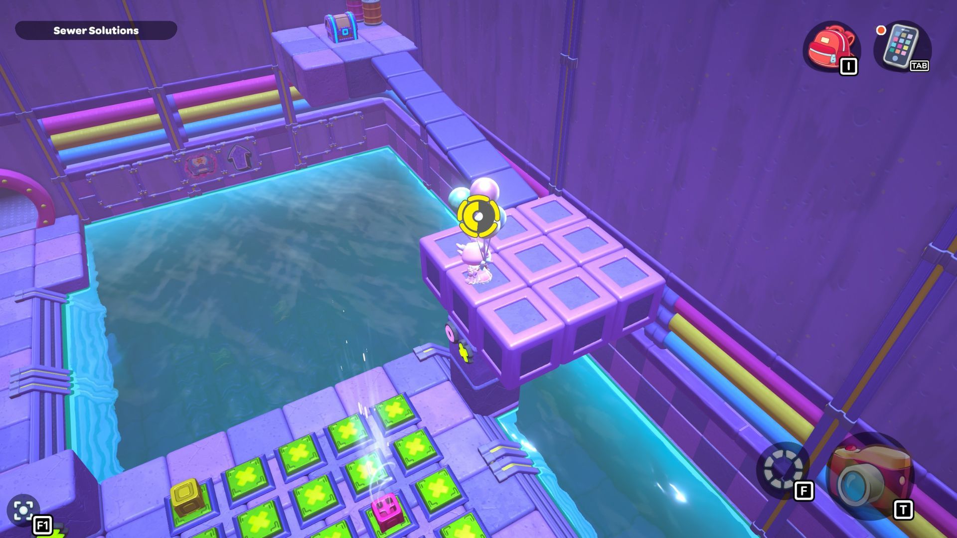 Go back to one of the levers and bring the water level down. Pick up the purple cube from the far left side and place it on the platform in the middle of the room where the lever is. Turn the cube so the cloud symbol is over the opening you made. Use the cube to build platforms for the cloud, then raise the water level once more.
