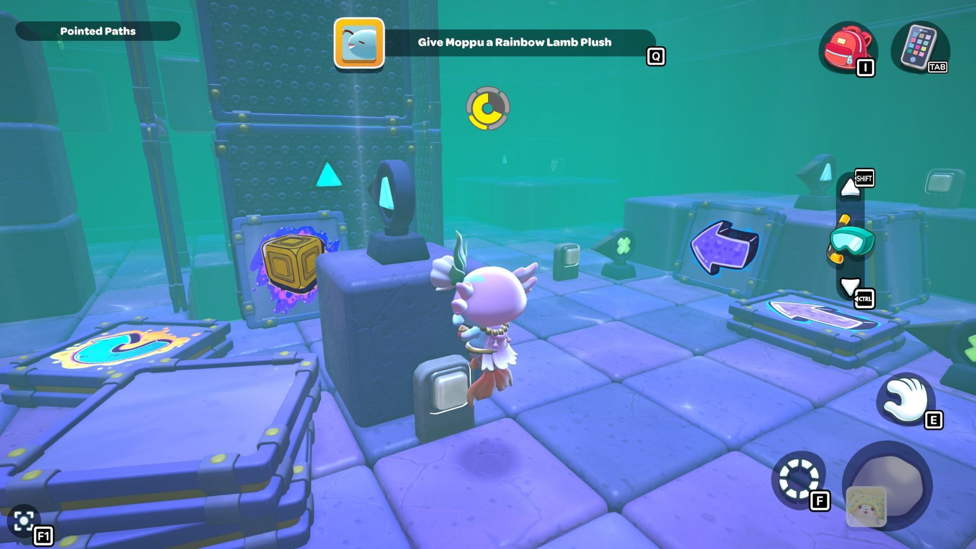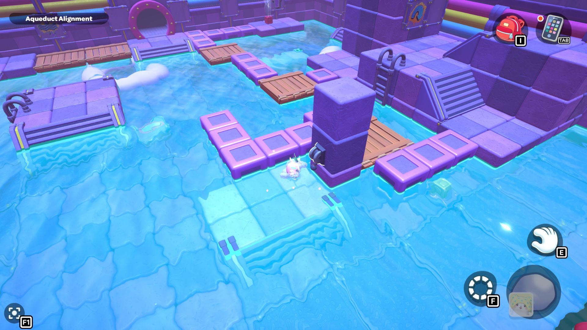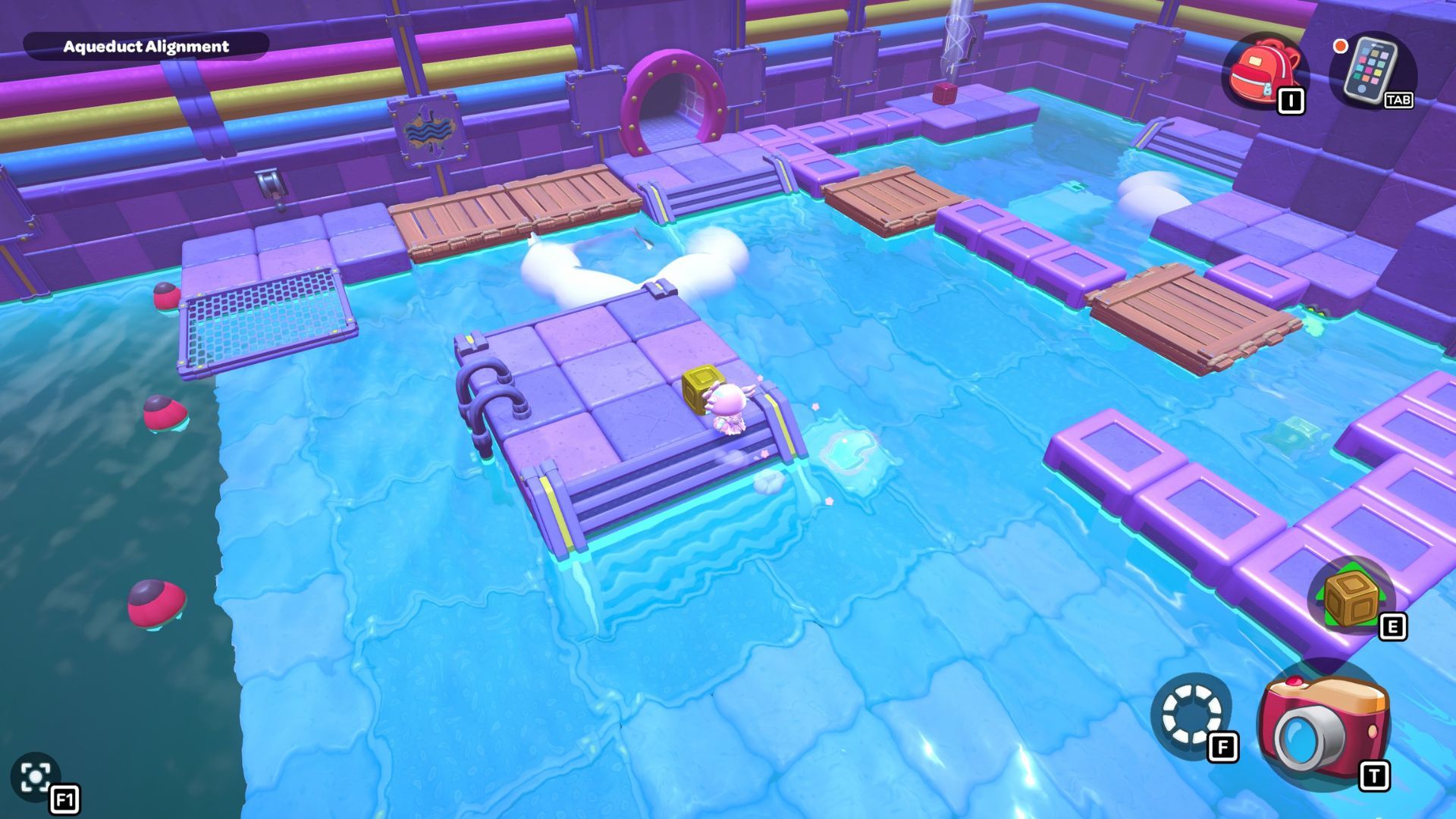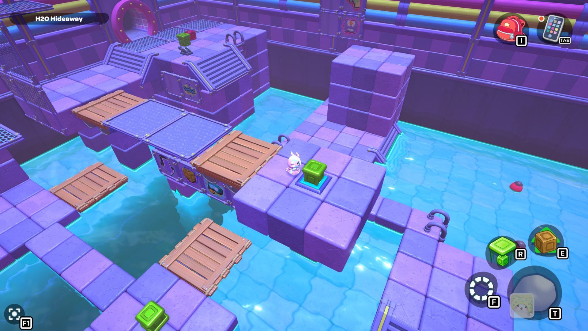 Go back to one of the levers and bring the water level down. Pick up the purple cube from the far left side and place it on the platform in the middle of the room where the lever is. Turn the cube so the cloud symbol is over the opening you made. Use the cube to build platforms for the cloud, then raise the water level once more.