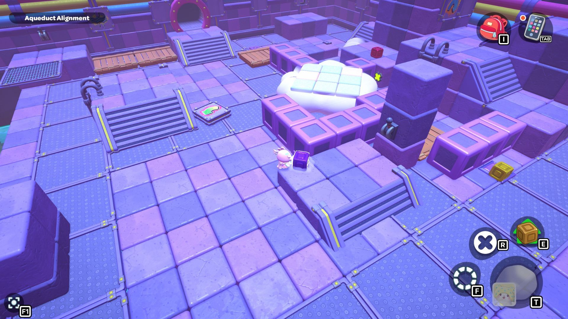 If you move the cube, the cloud by the entrance will move with it. Carry the cube to the left side of the room until you get to the furthest left purple switch. Putting the cube on the switch will make a bridge appear, leading to another purple cube. Go across the bridge and pick up that second cube.