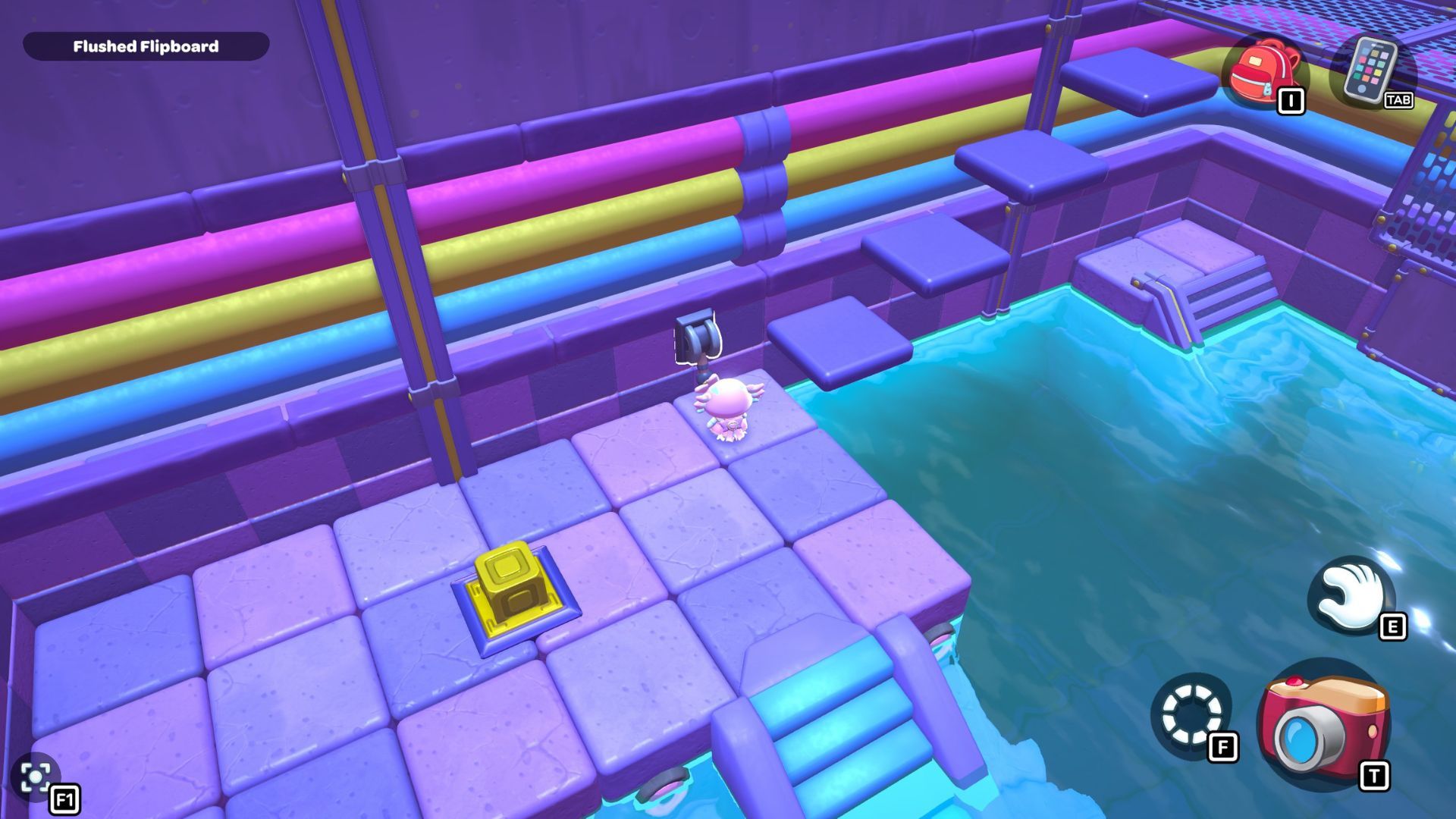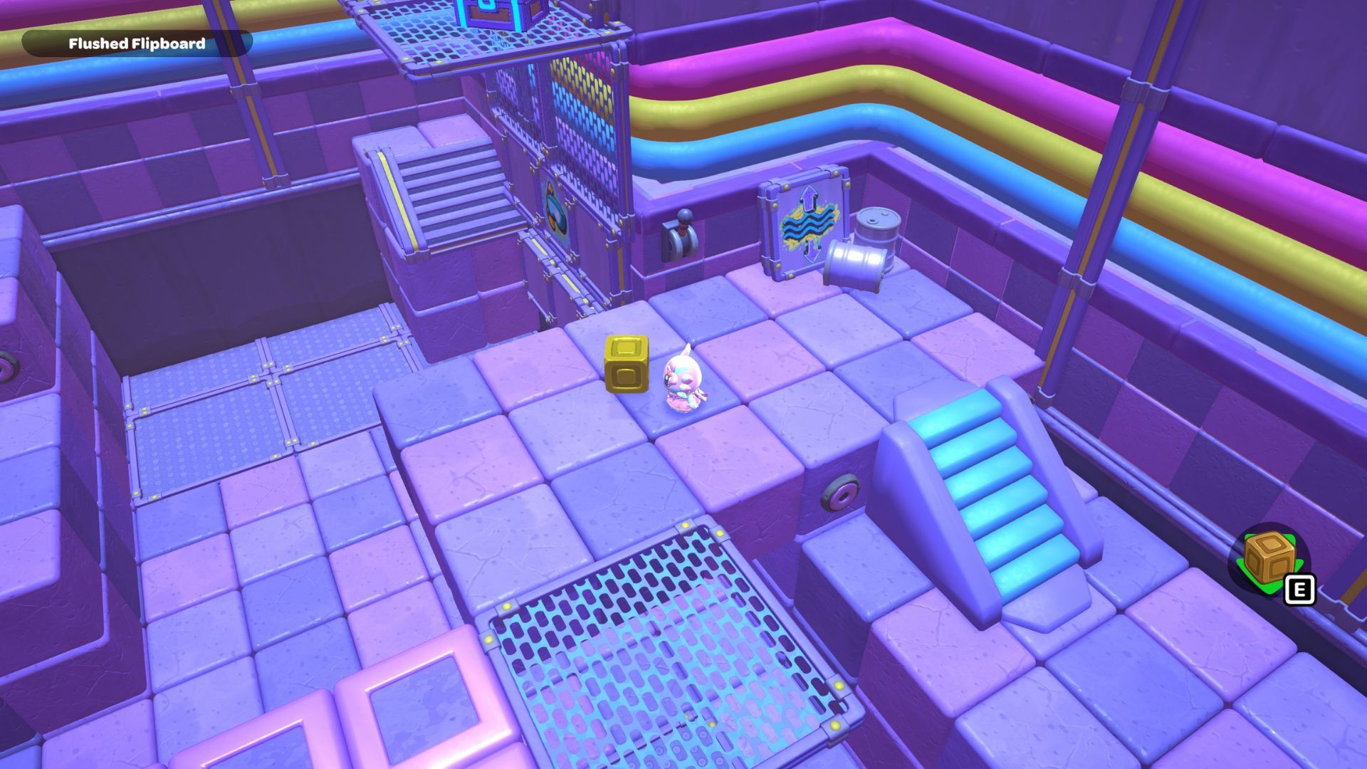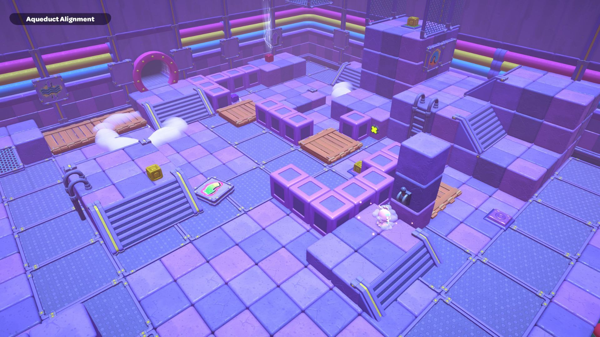 Place the box directly on the golden switch to make a staircase. Use the staircase to climb up to the platform where you’ll find the chest for this area. Open the chest to get a Pipe Sofa Table.