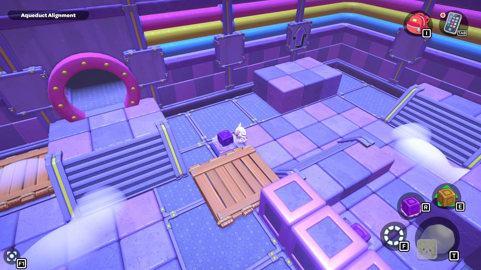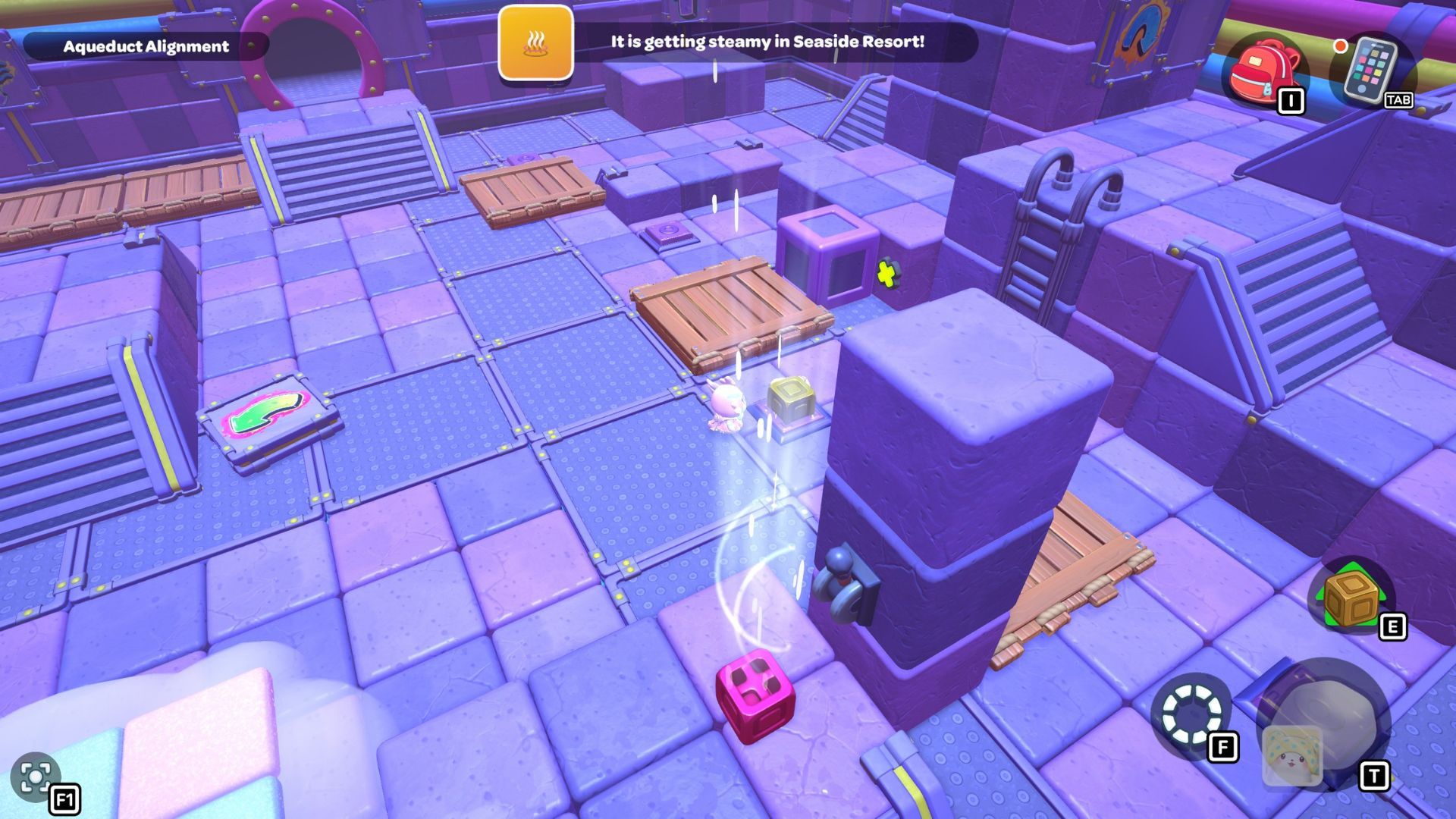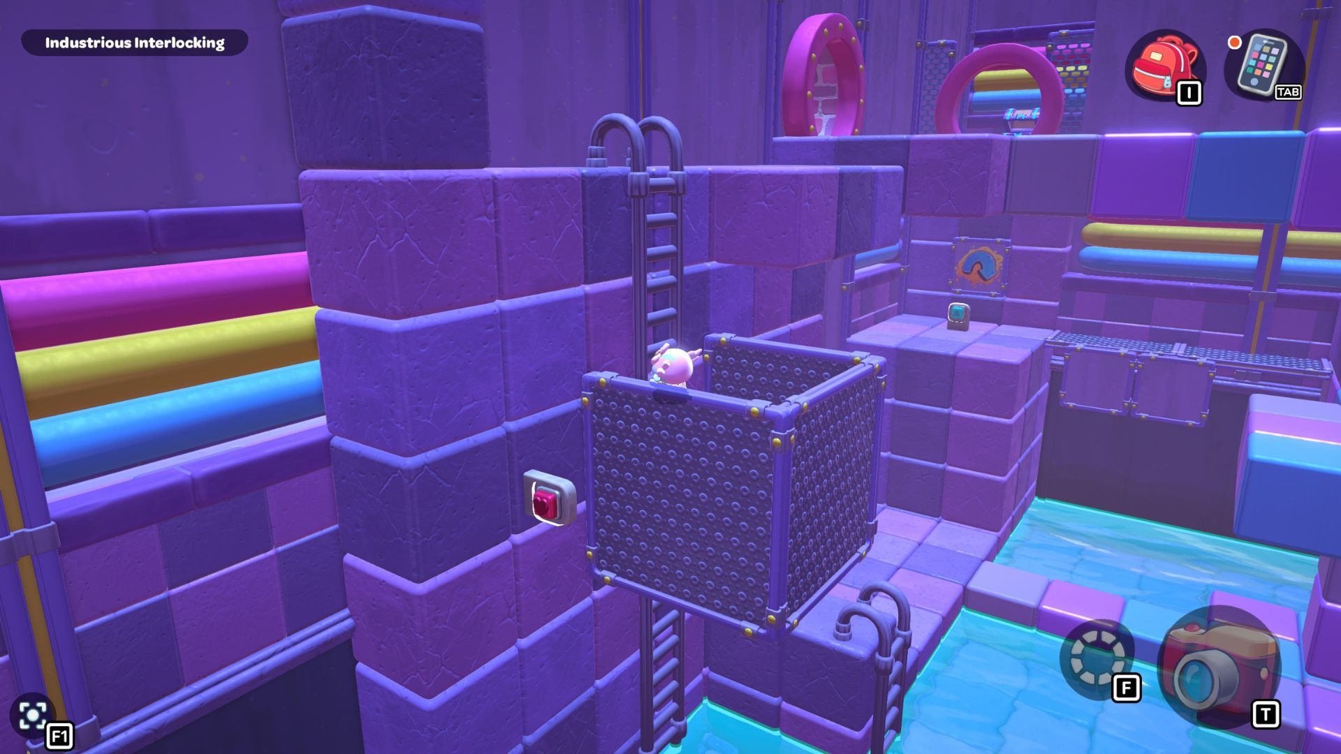 Place the box directly on the golden switch to make a staircase. Use the staircase to climb up to the platform where you’ll find the chest for this area. Open the chest to get a Pipe Sofa Table.