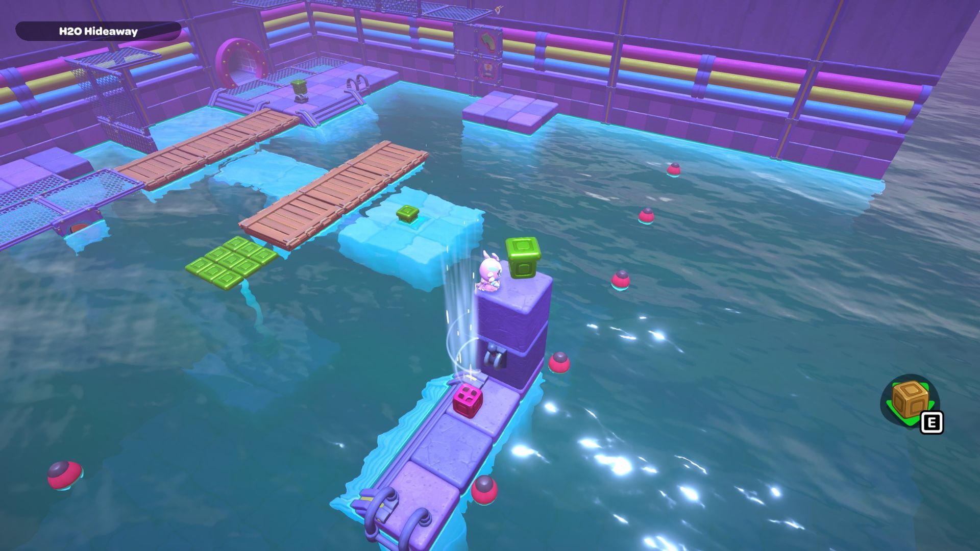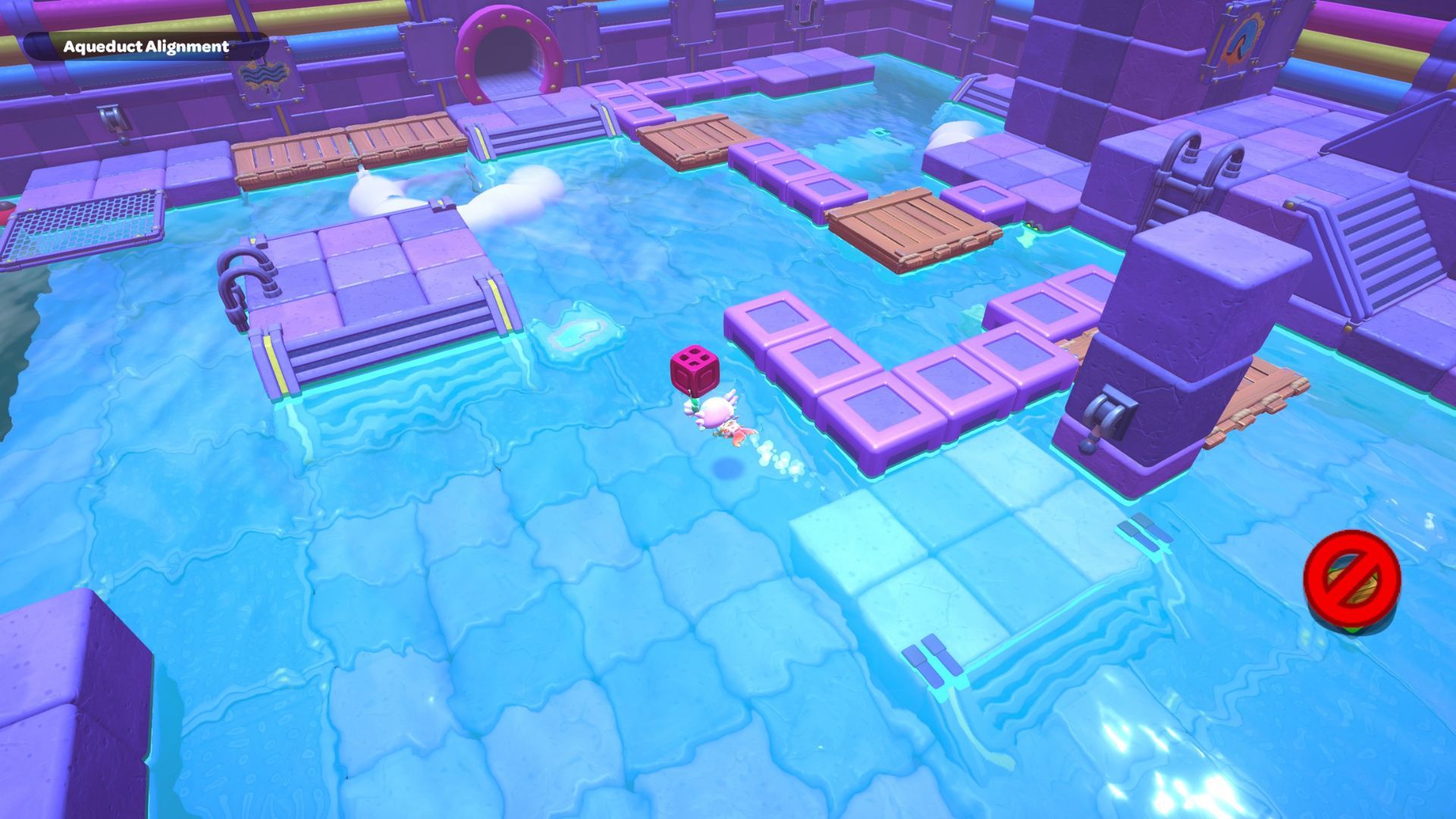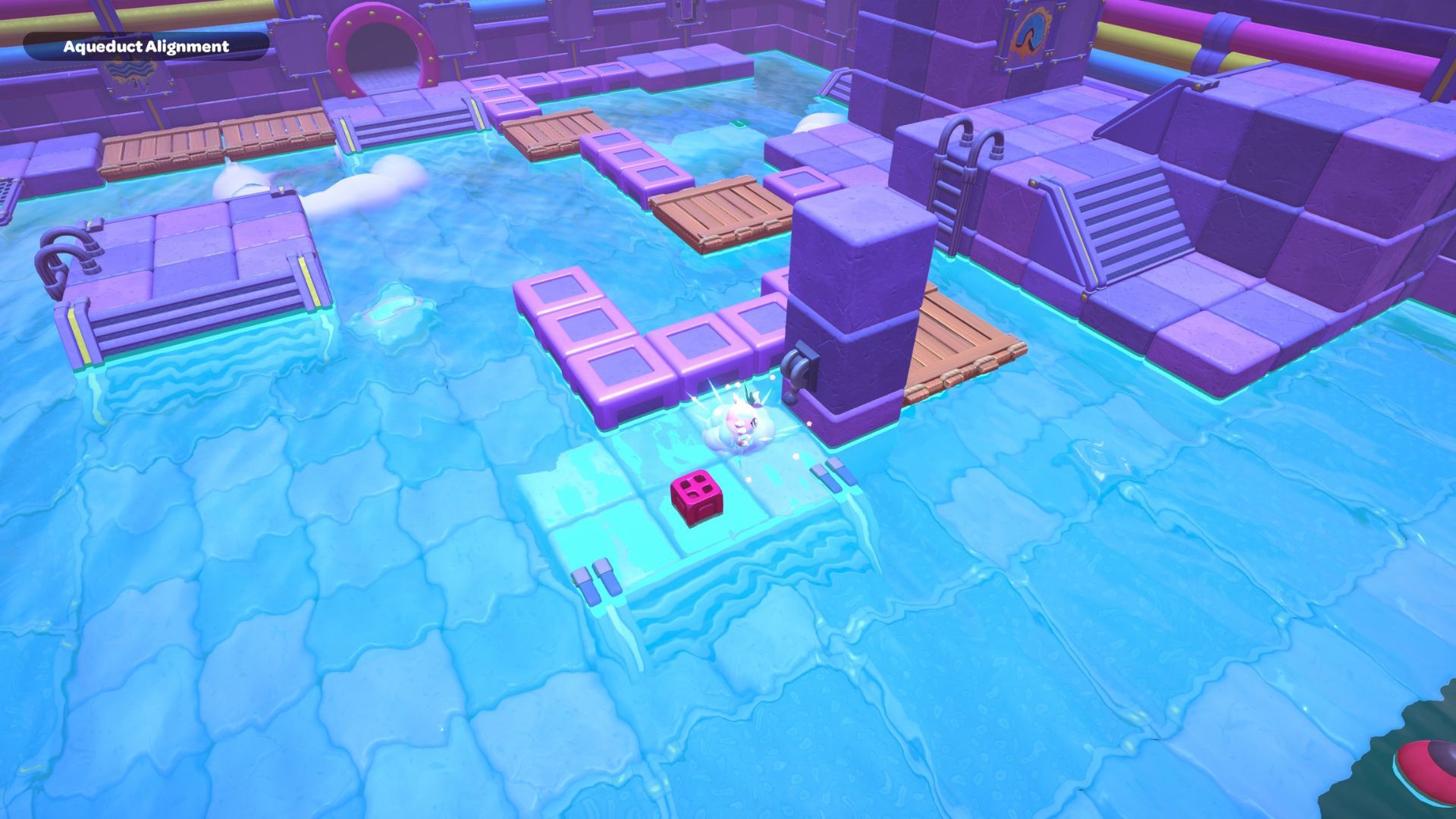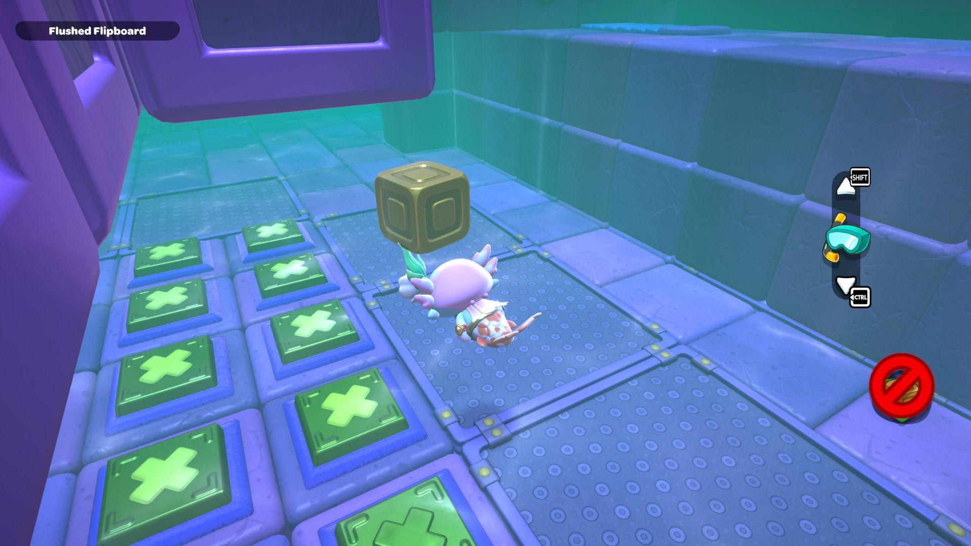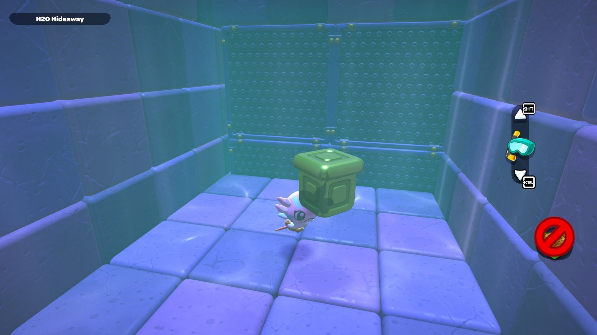 Okay, so in this part of the room, I need to start by standing on the platform on the right and hitting that X switch. Then, I gotta jump across those rocks to get to the other X switch in the corner. After that’s done, I swim over to the northwest corner and activate that red cube.