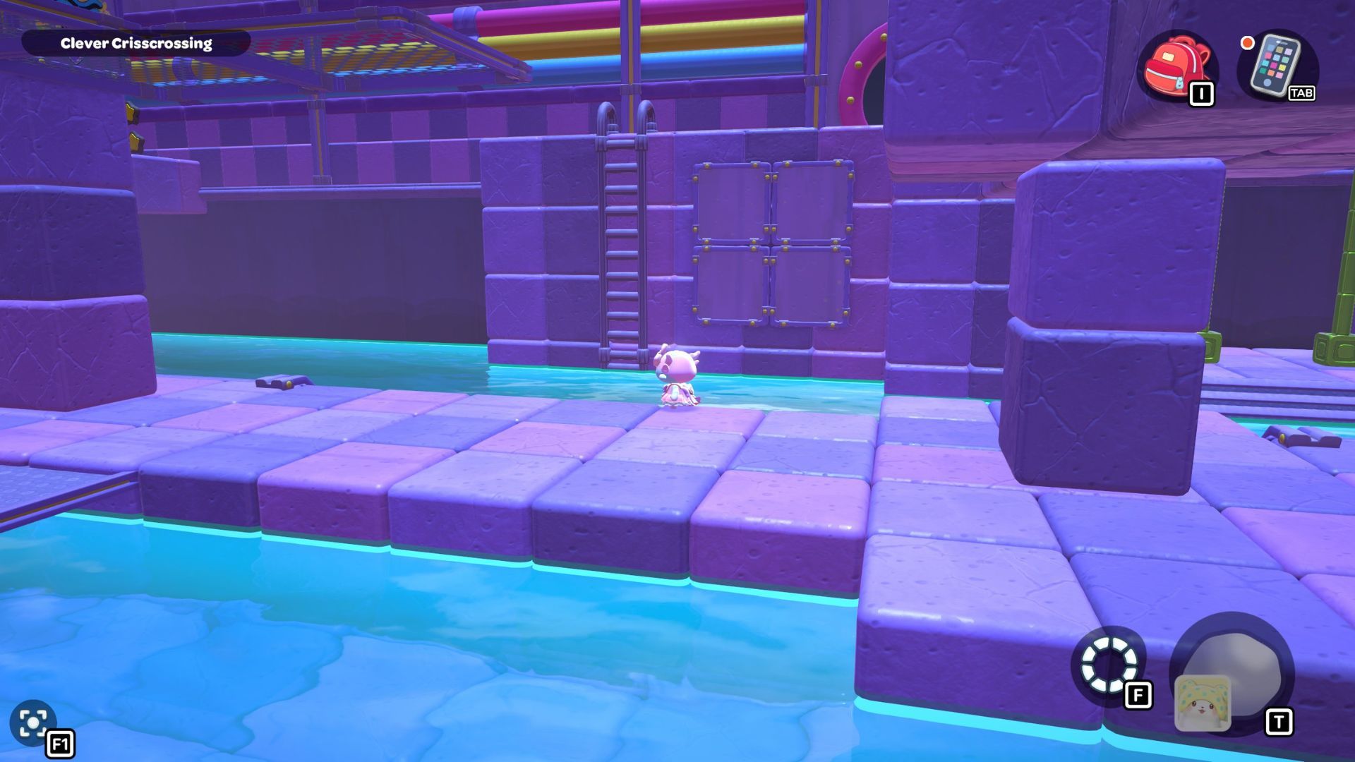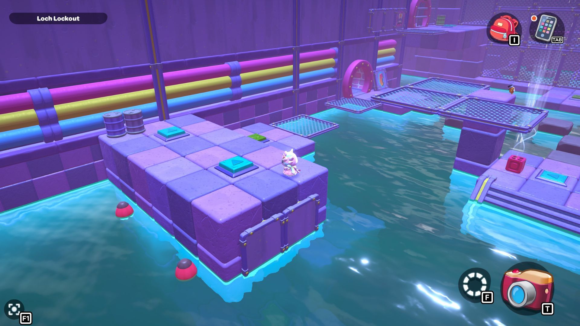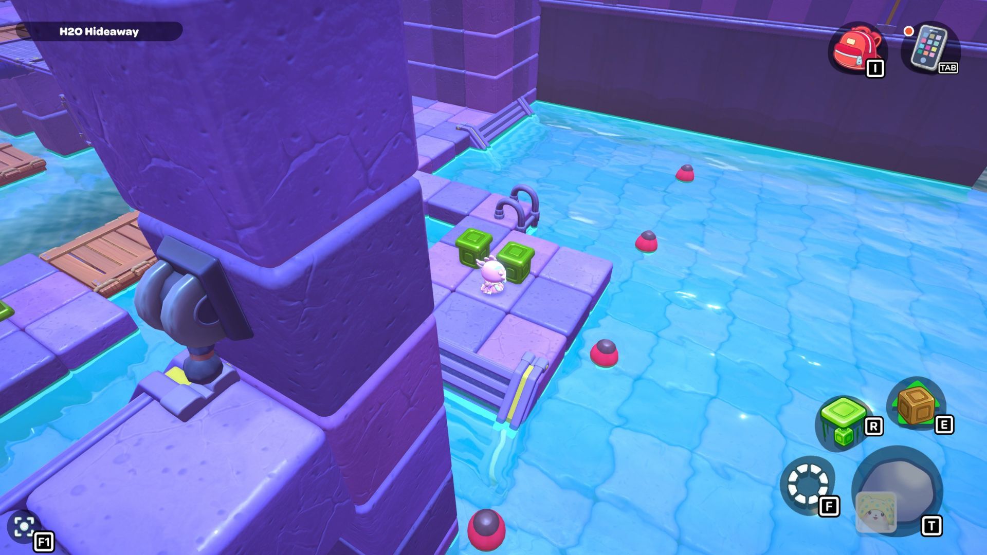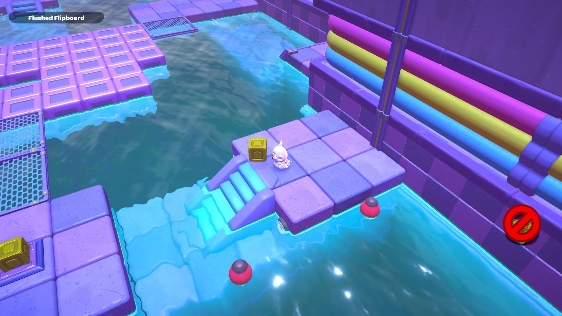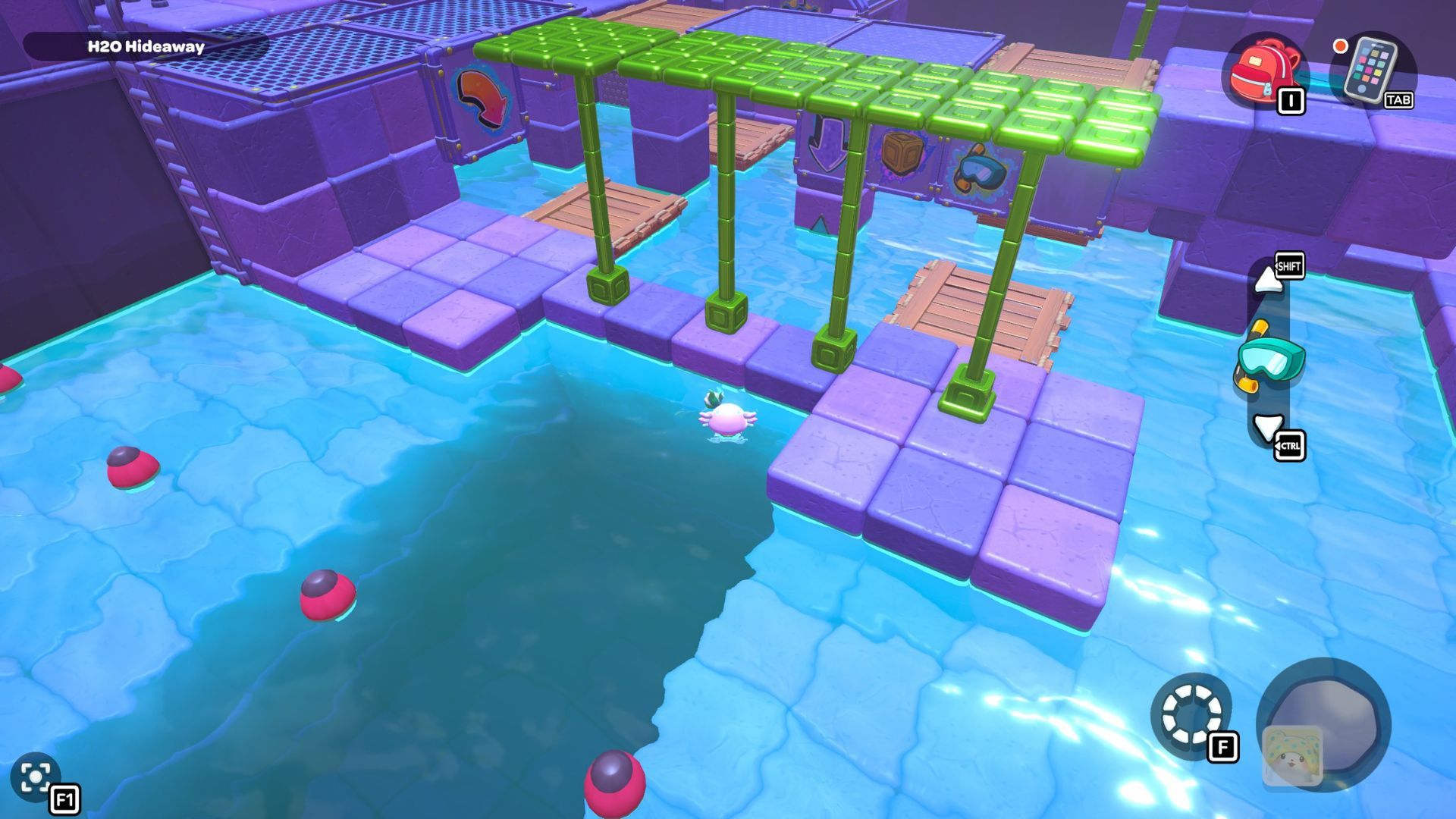 Okay, so in this part of the room, I need to start by standing on the platform on the right and hitting that X switch. Then, I gotta jump across those rocks to get to the other X switch in the corner. After that’s done, I swim over to the northwest corner and activate that red cube.