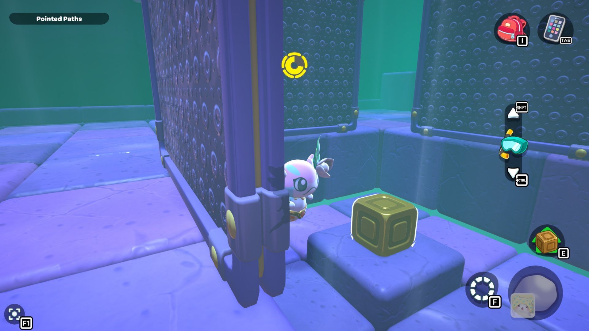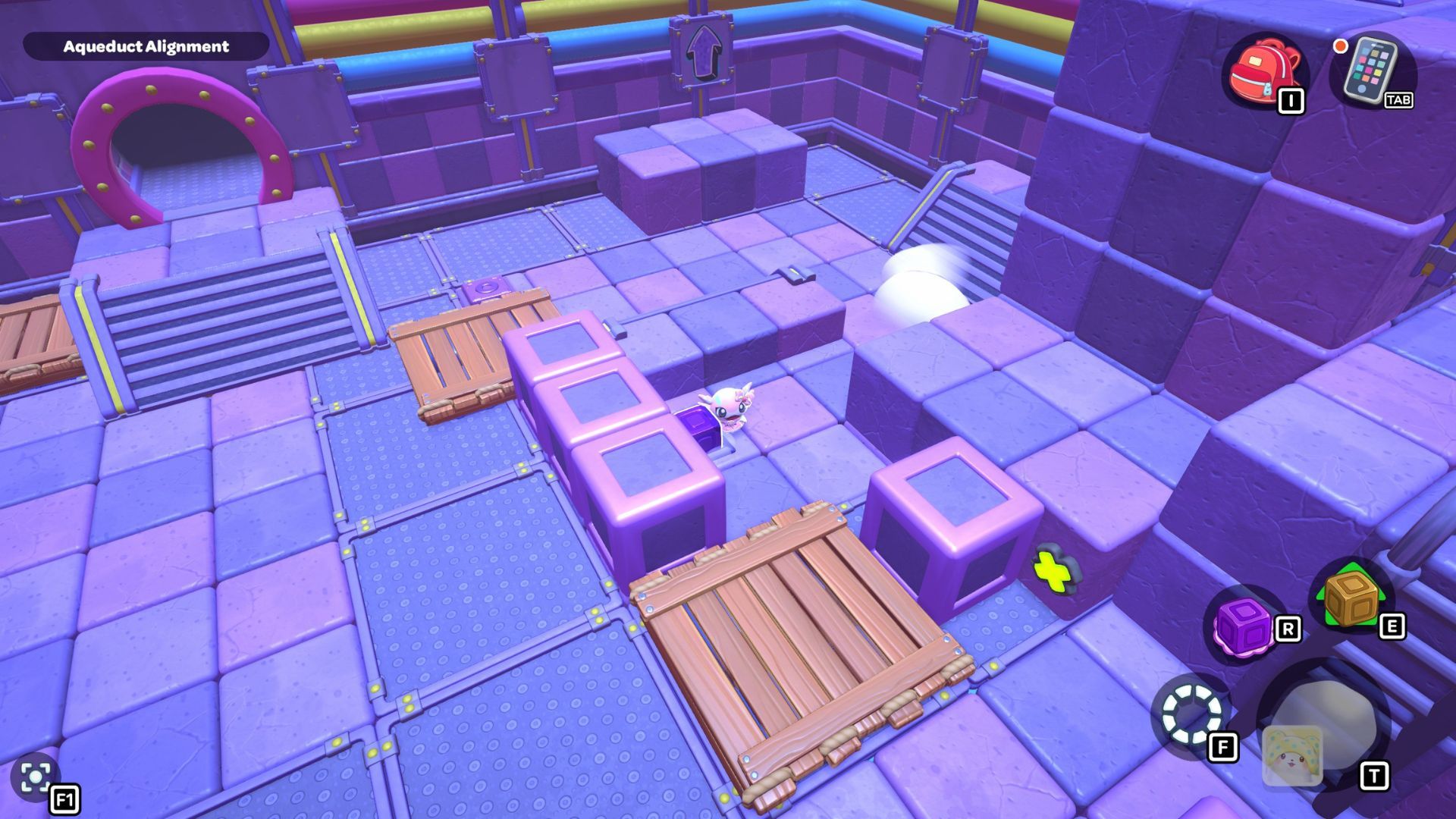 Pick up the metal cube by its handle, and then move it onto the path you created. Walk over to the platform on the west side of the room and set the cube down on the purple switch.