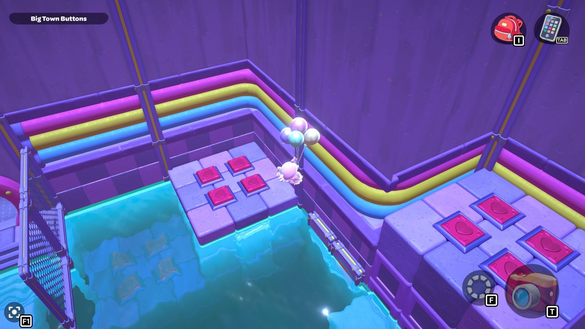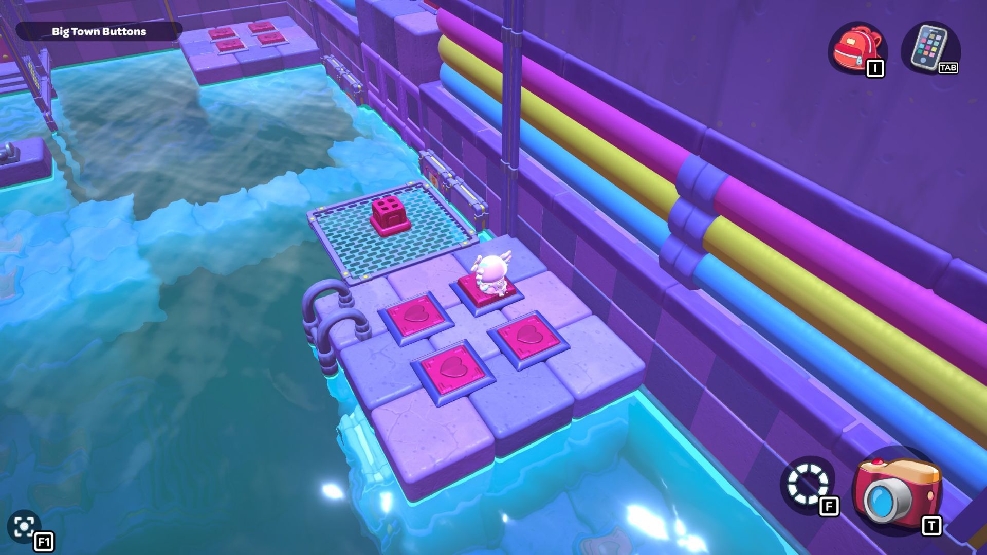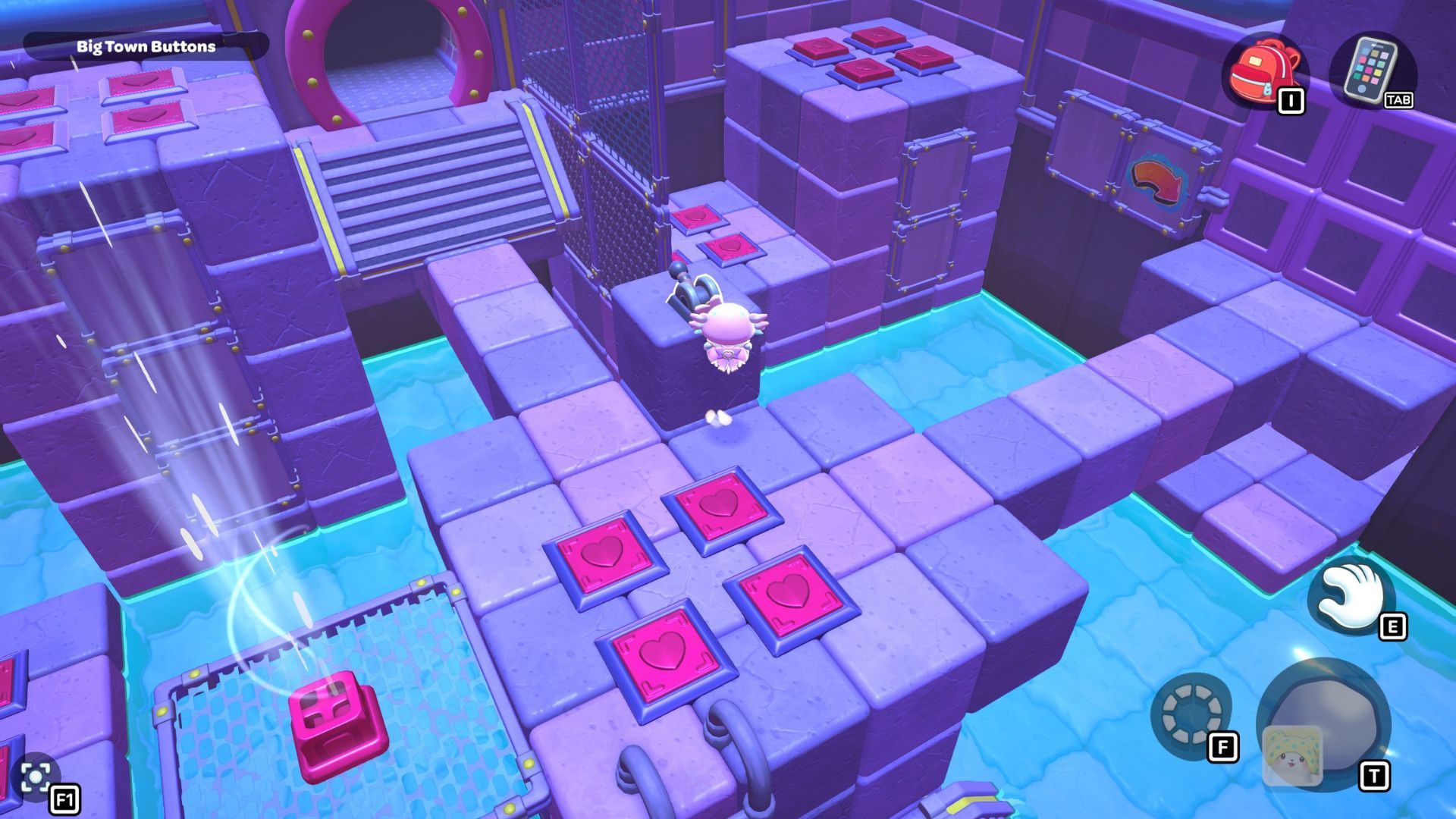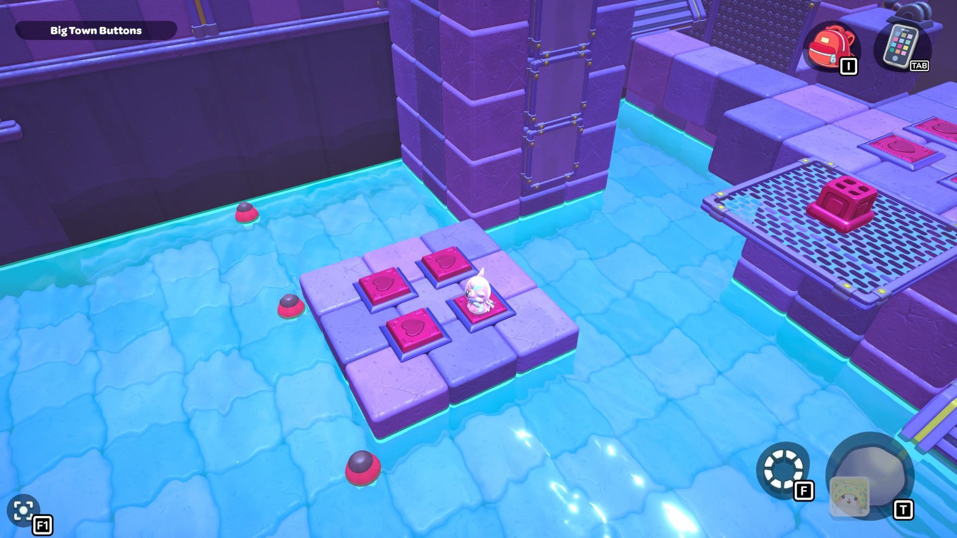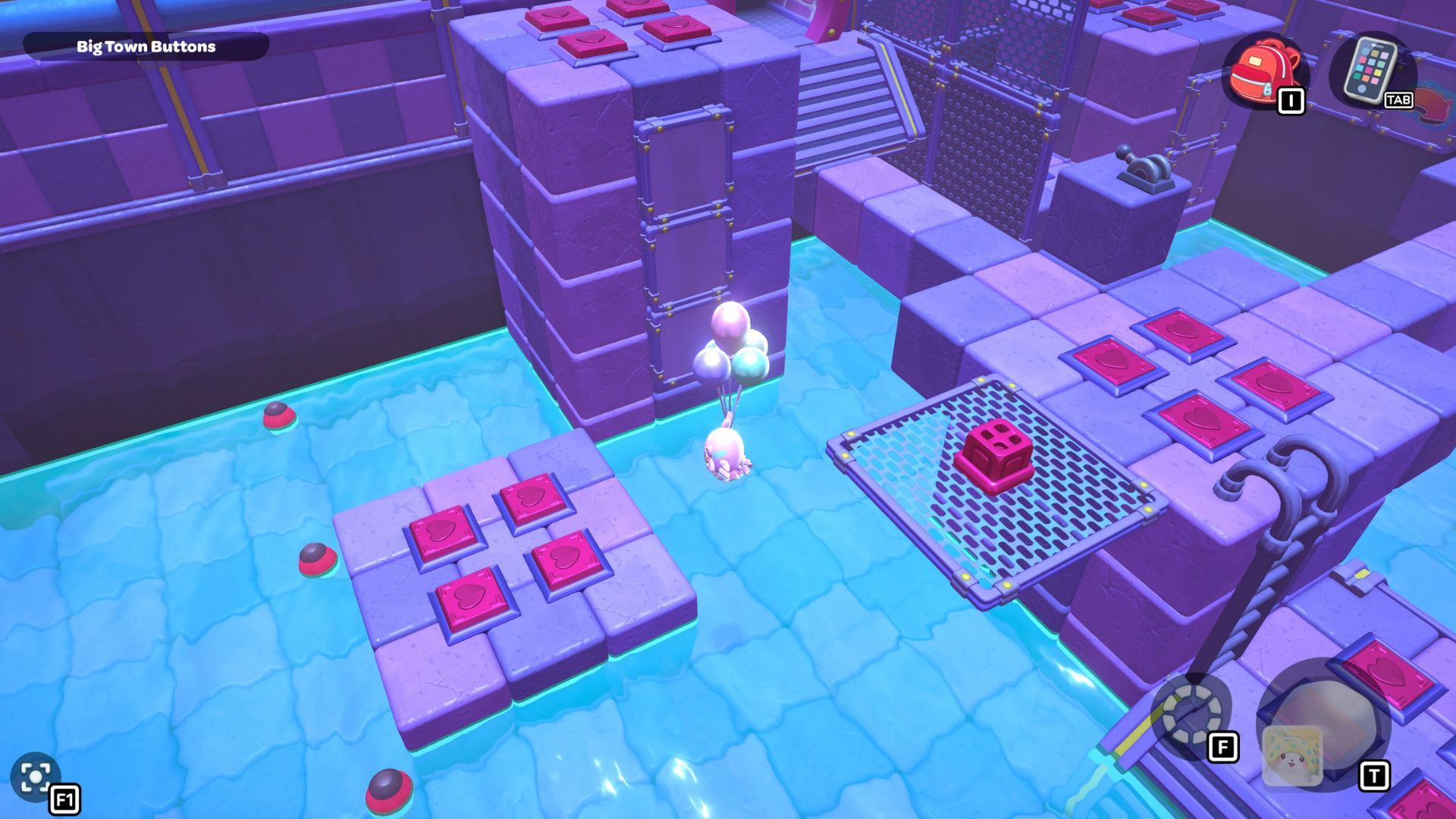 Okay, so I found this puzzle called “Big Town Buttons” deep down in the City Town Sewers – it’s way up in the northwest corner. It’s pretty simple, actually. You just have to step on every single red heart button until they’re all fully pressed down. That’s it!