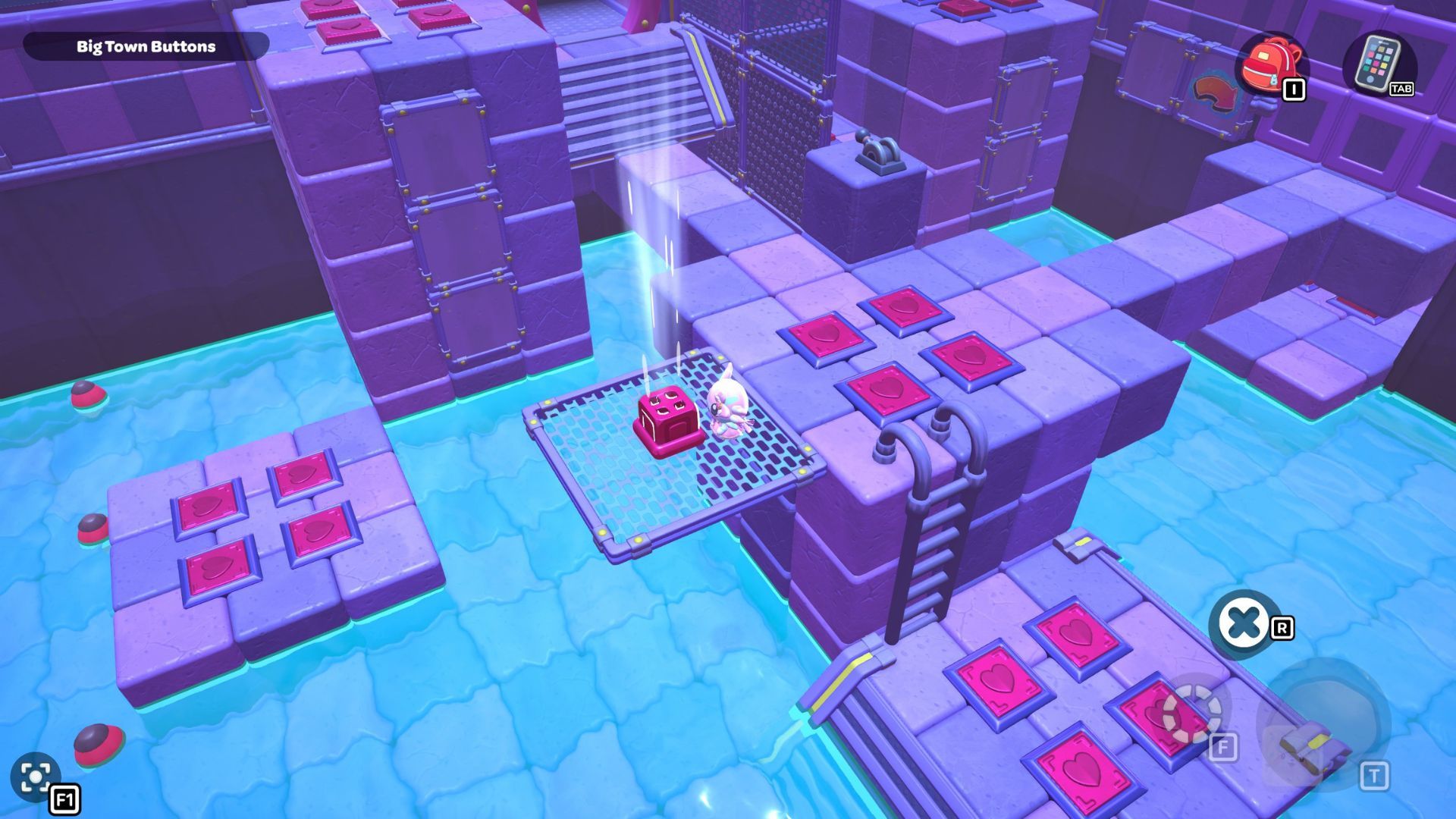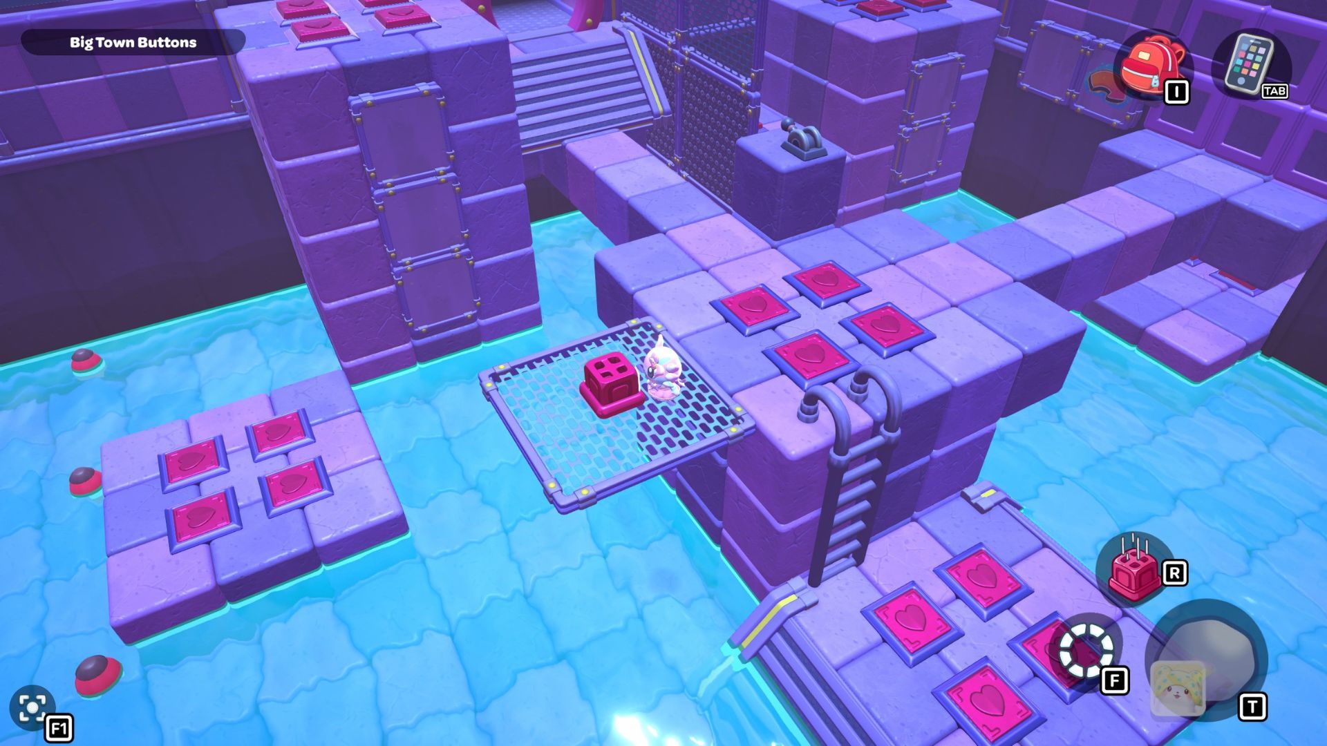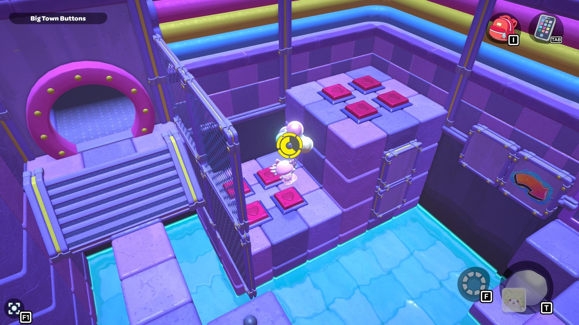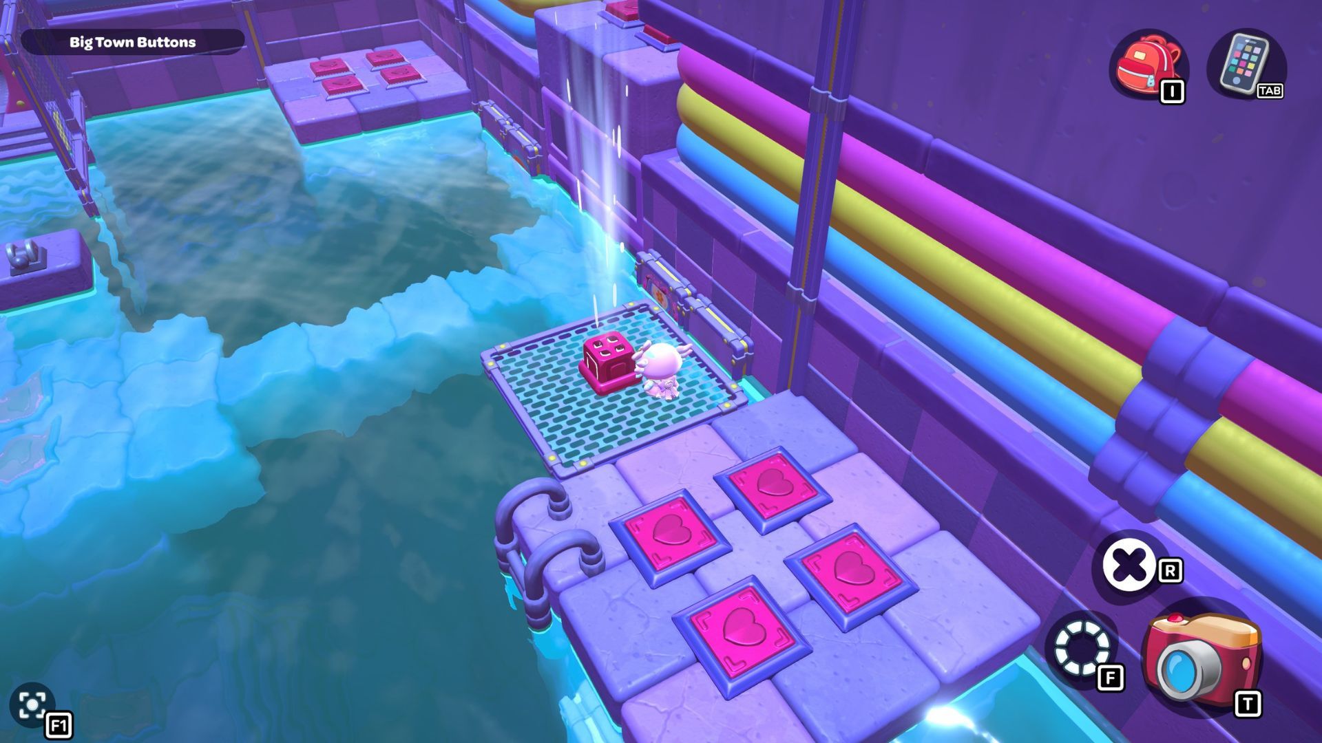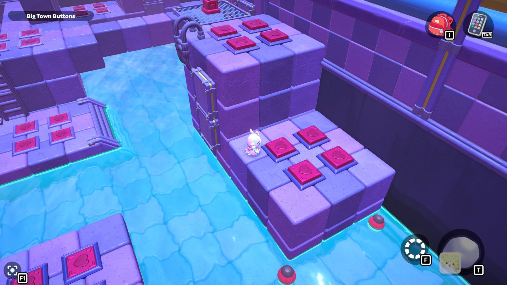 Okay, so I found this puzzle called “Big Town Buttons” deep down in the City Town Sewers – it’s way up in the northwest corner. It’s pretty simple, actually. You just have to step on every single red heart button until they’re all fully pressed down. That’s it!