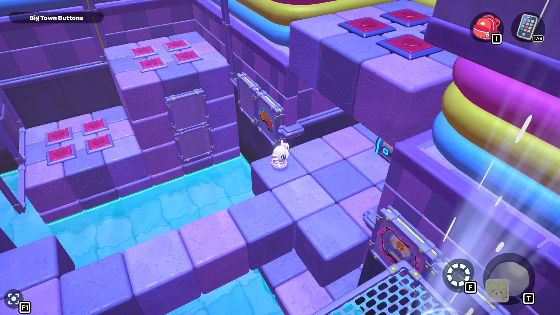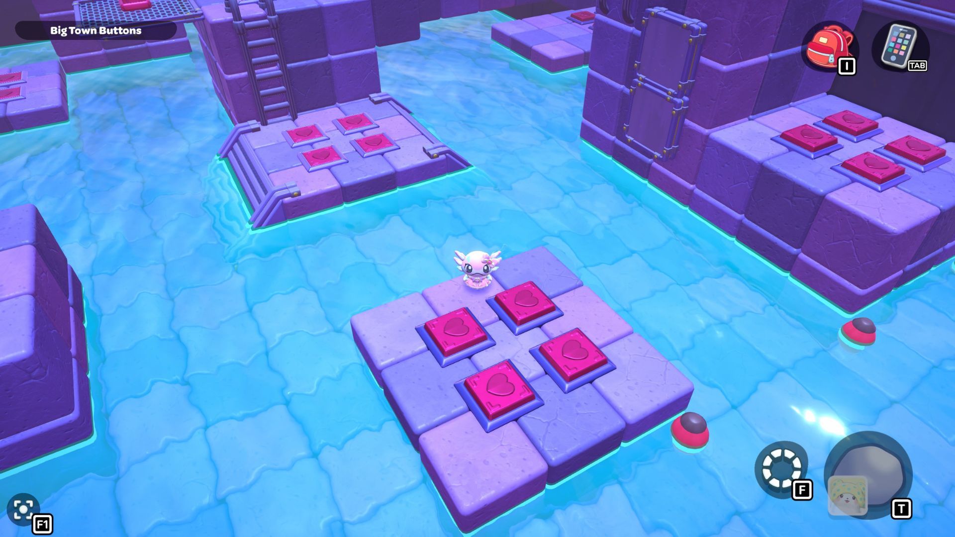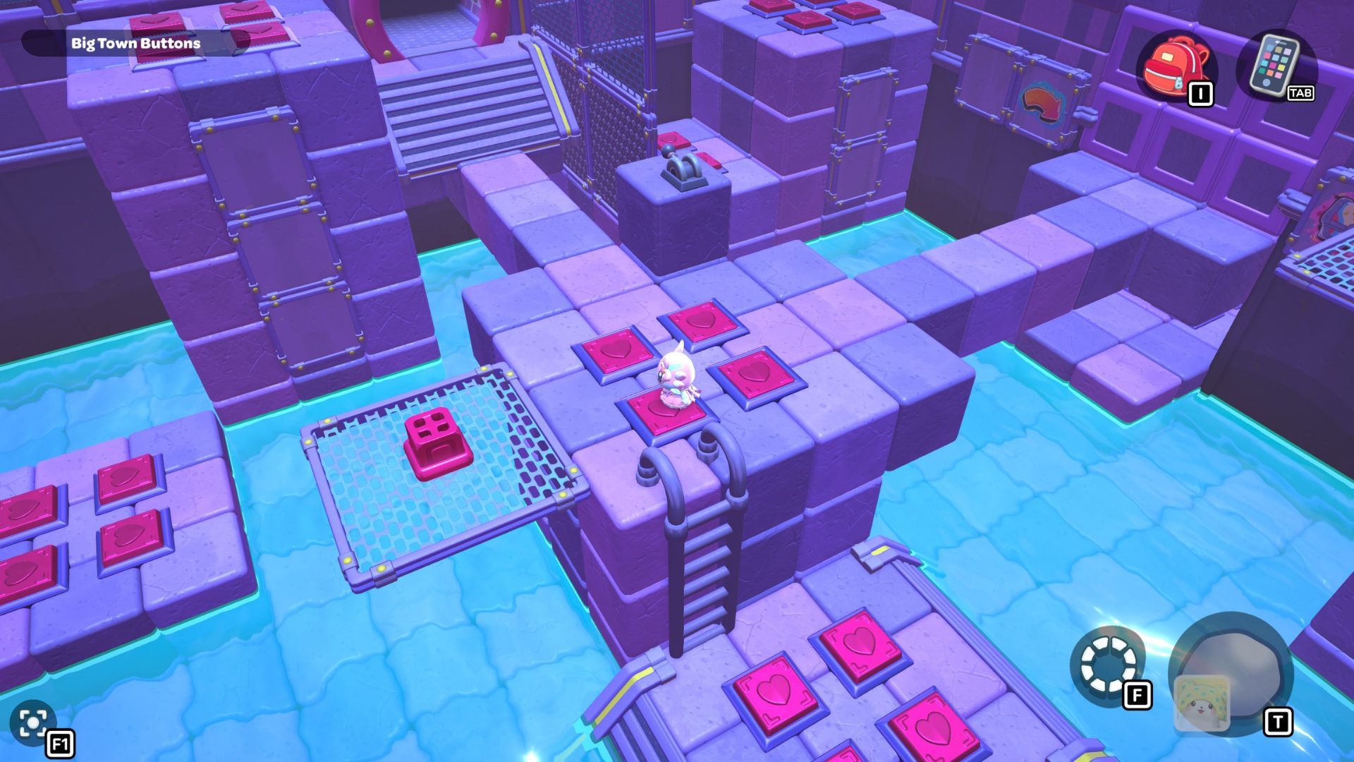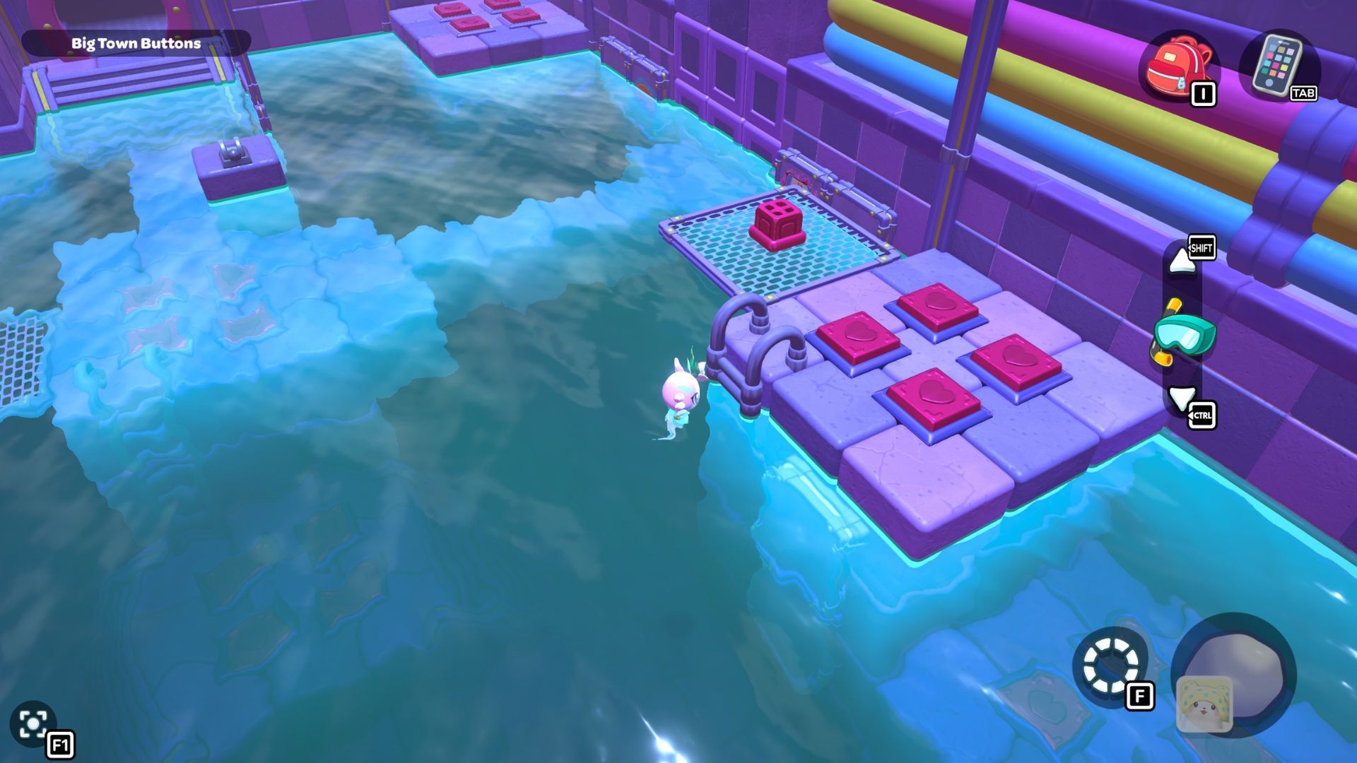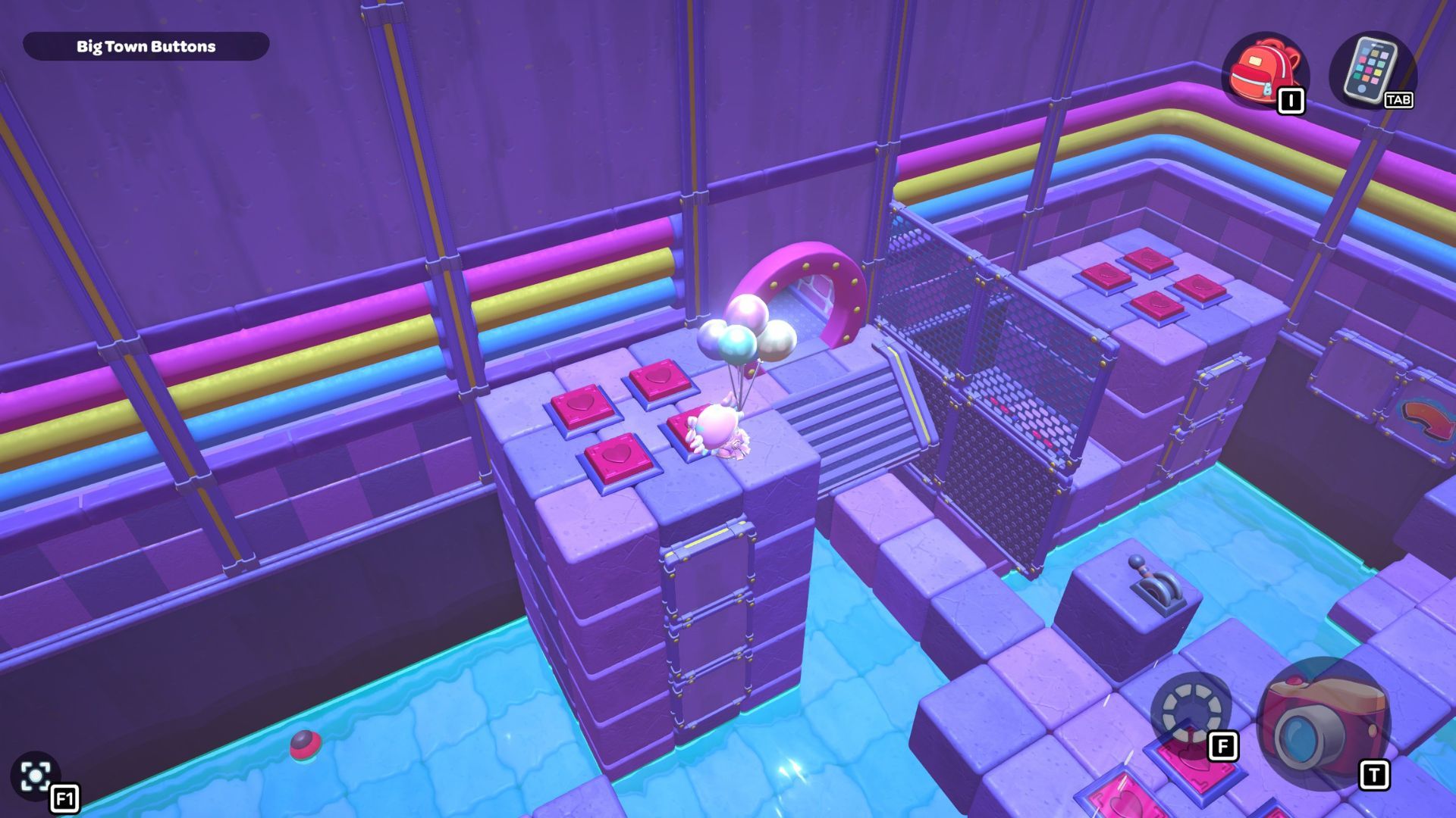 Okay, so I found this puzzle called “Big Town Buttons” deep down in the City Town Sewers – it’s way up in the northwest corner. It’s pretty simple, actually. You just have to step on every single red heart button until they’re all fully pressed down. That’s it!