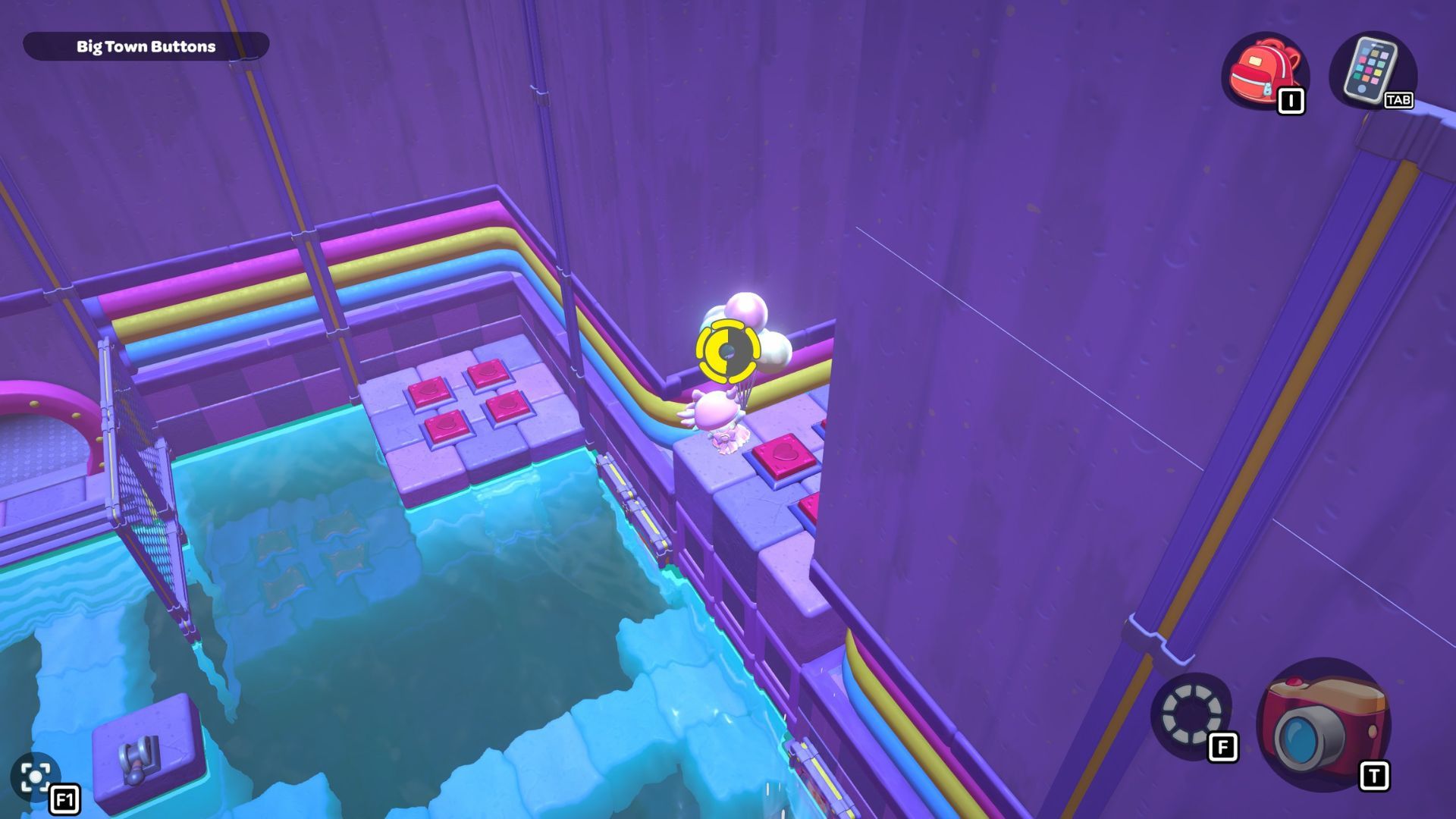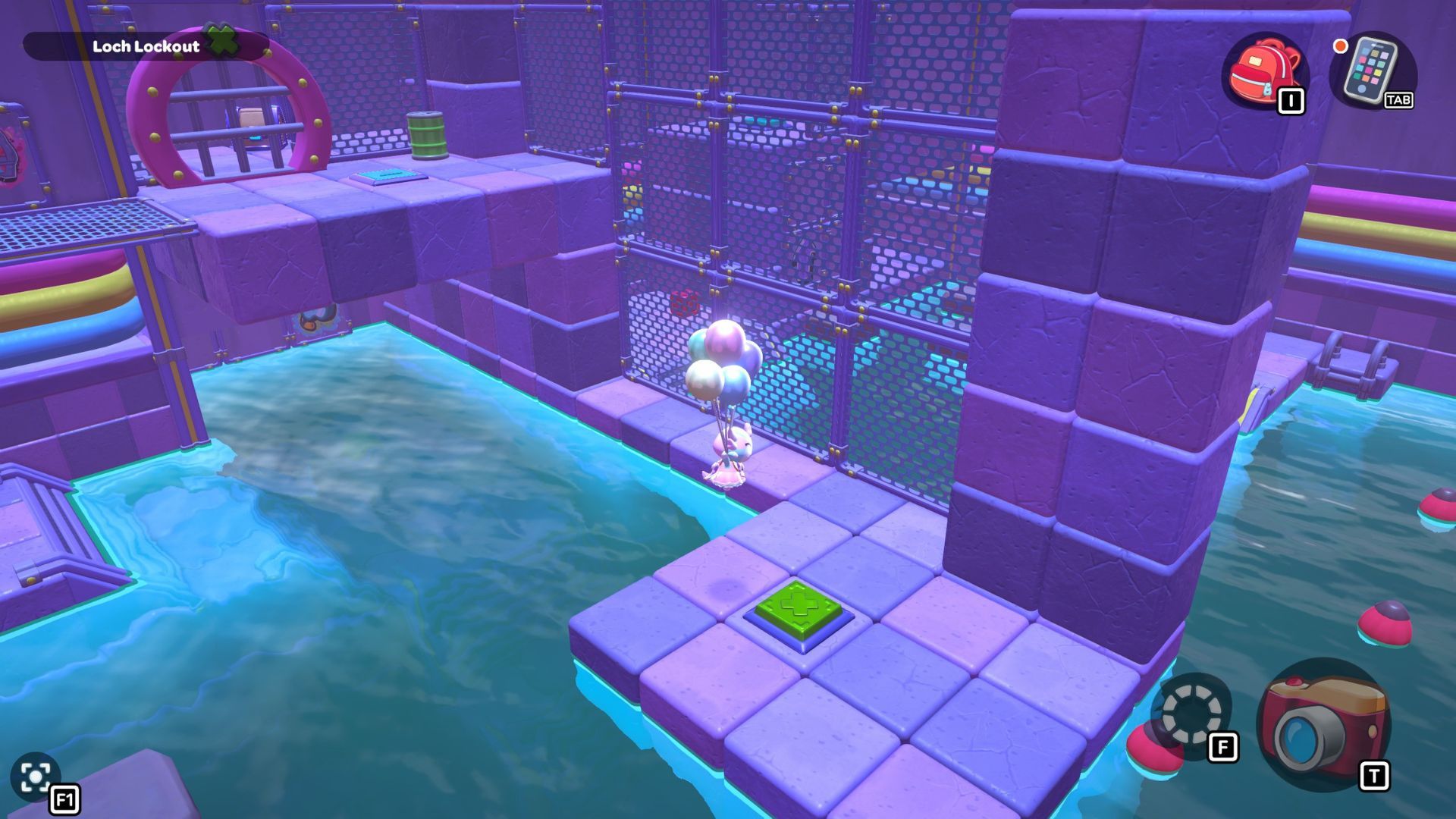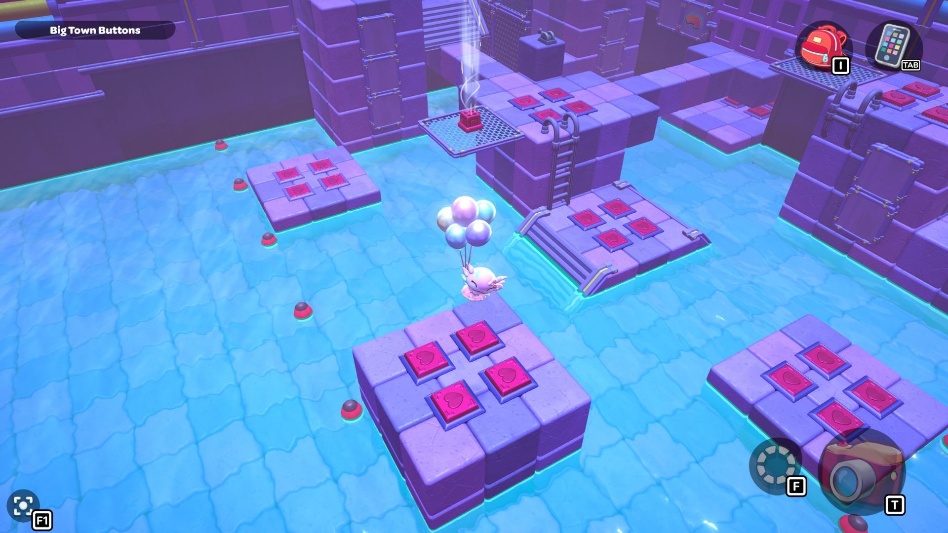 Now, use your balloons to float over to the short platform on the left. Press the buttons there, and then swim back to the ladder you used to reach the first platform and climb up.