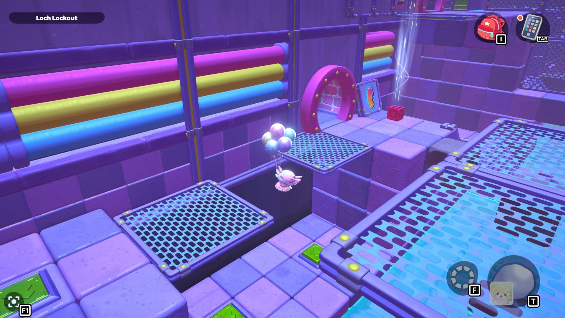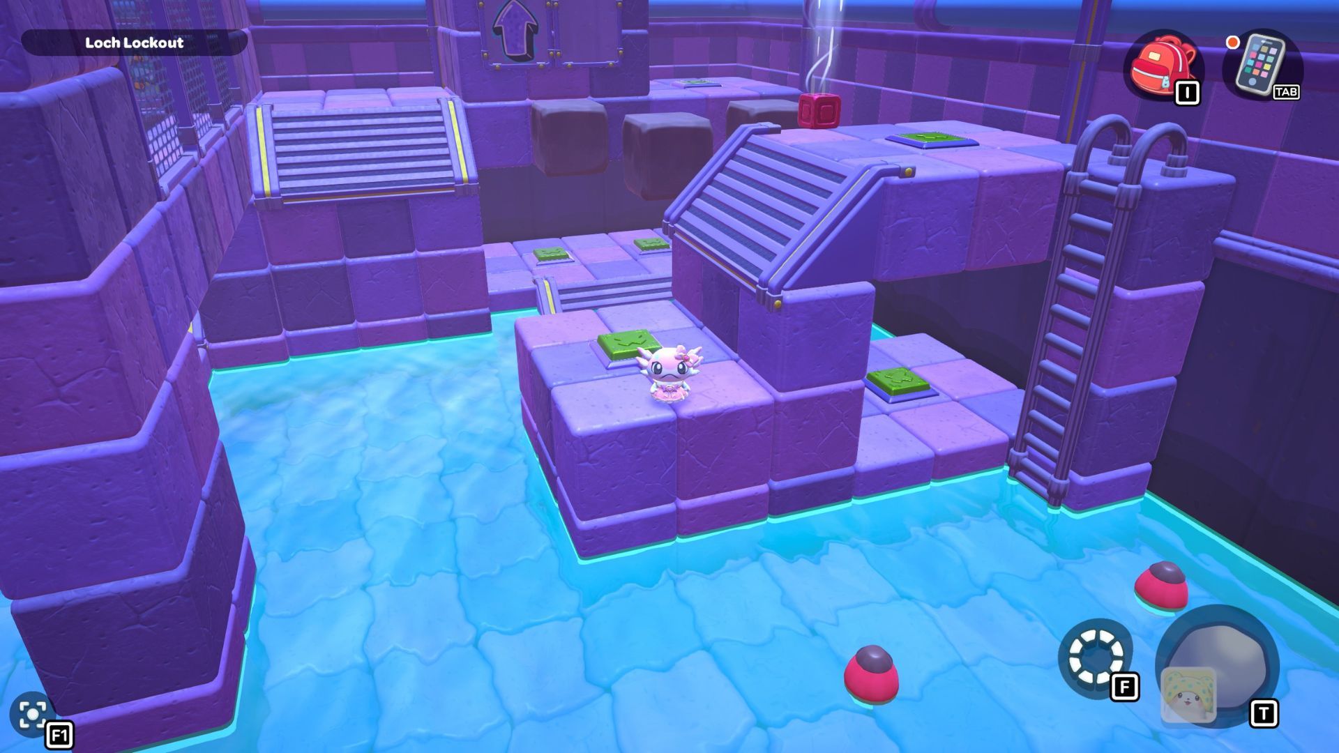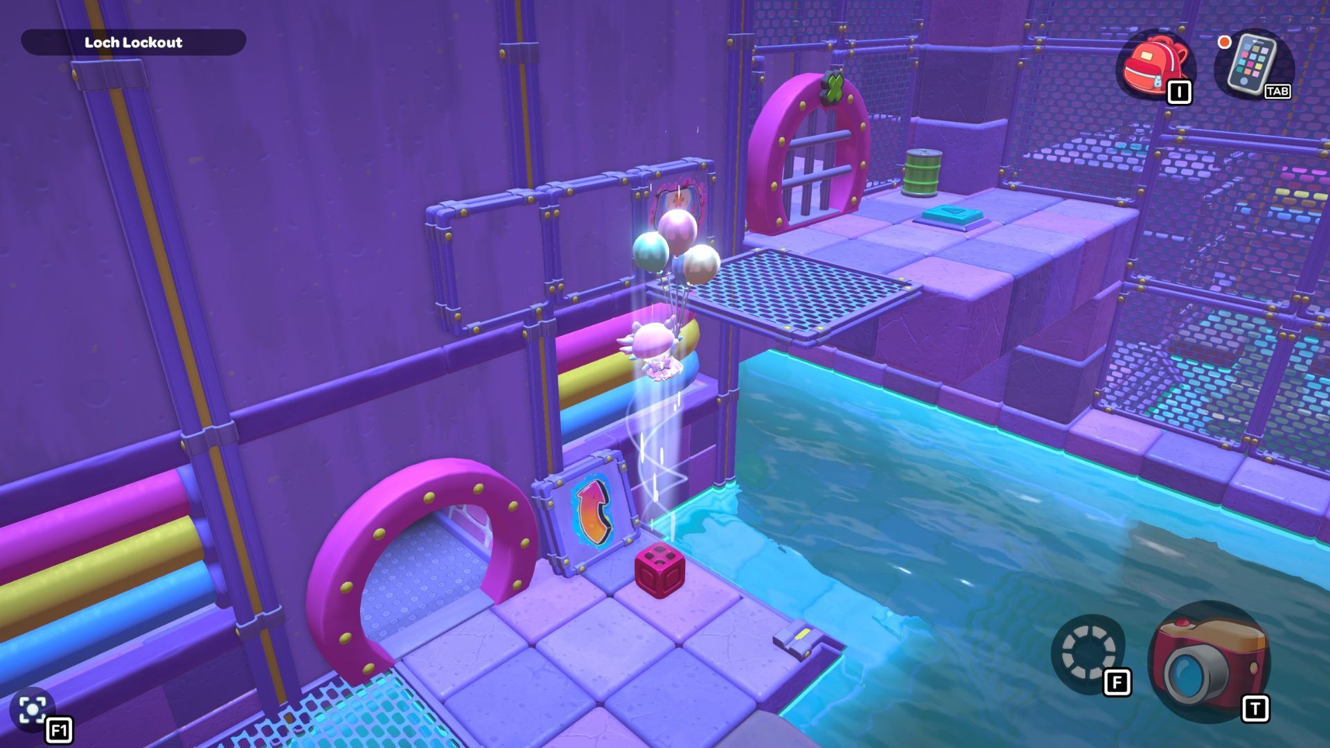 Now, use your balloons to float over to the short platform on the left. Press the buttons there, and then swim back to the ladder you used to reach the first platform and climb up.