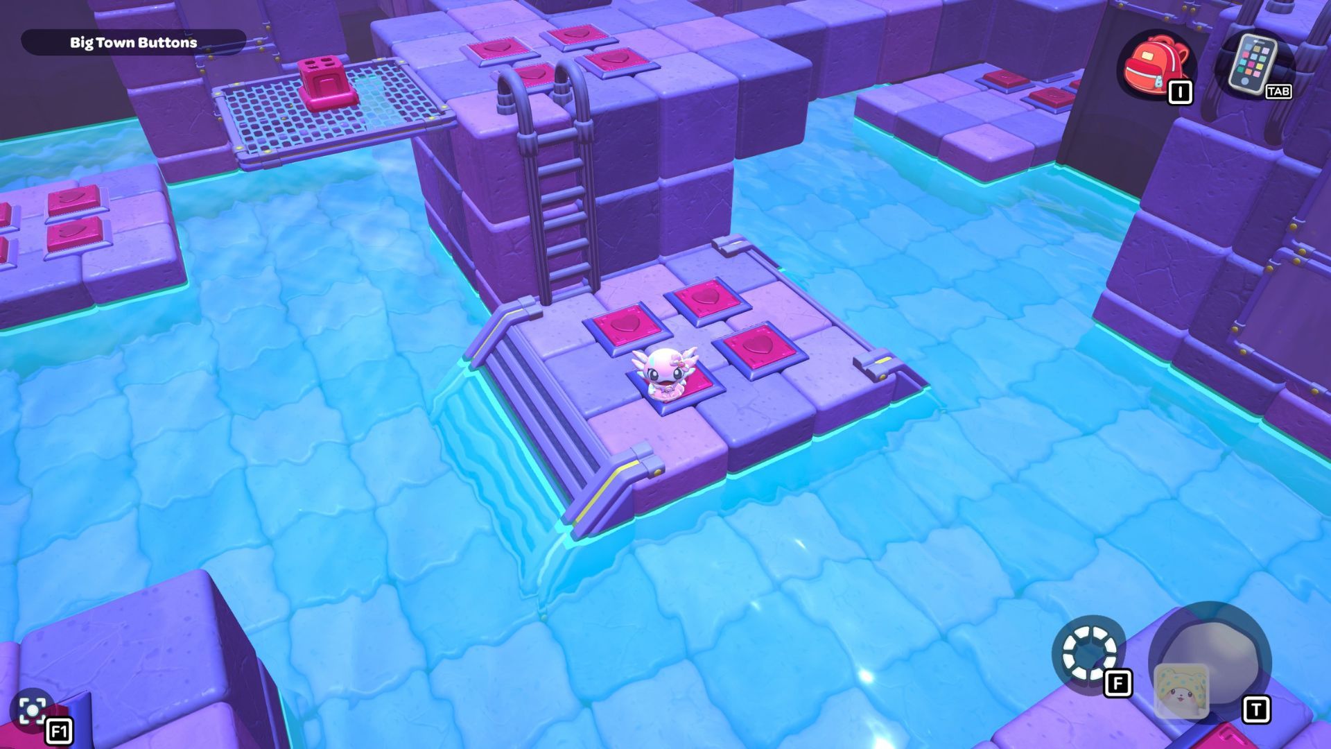 Swim over to the platform on the west side and use the ladder to climb up. Make sure to step on every button on the platform before you continue.