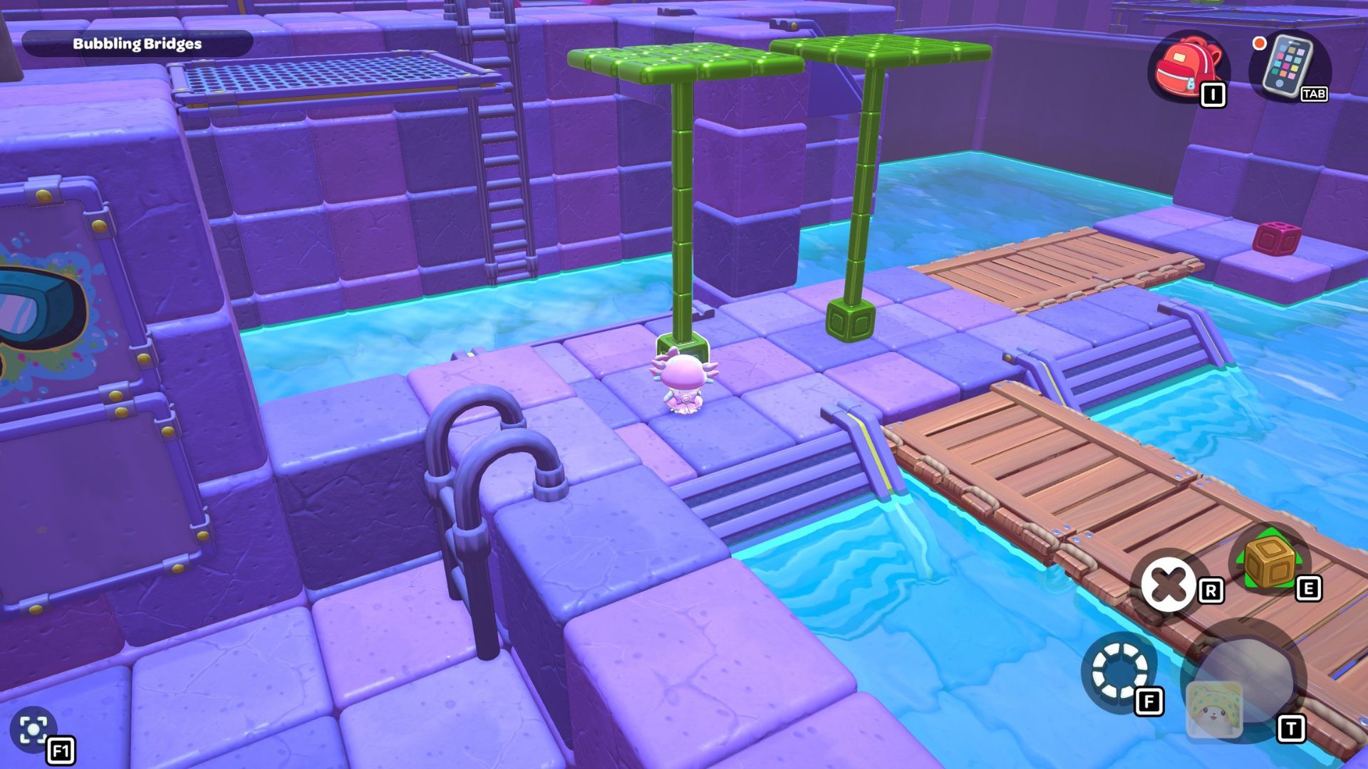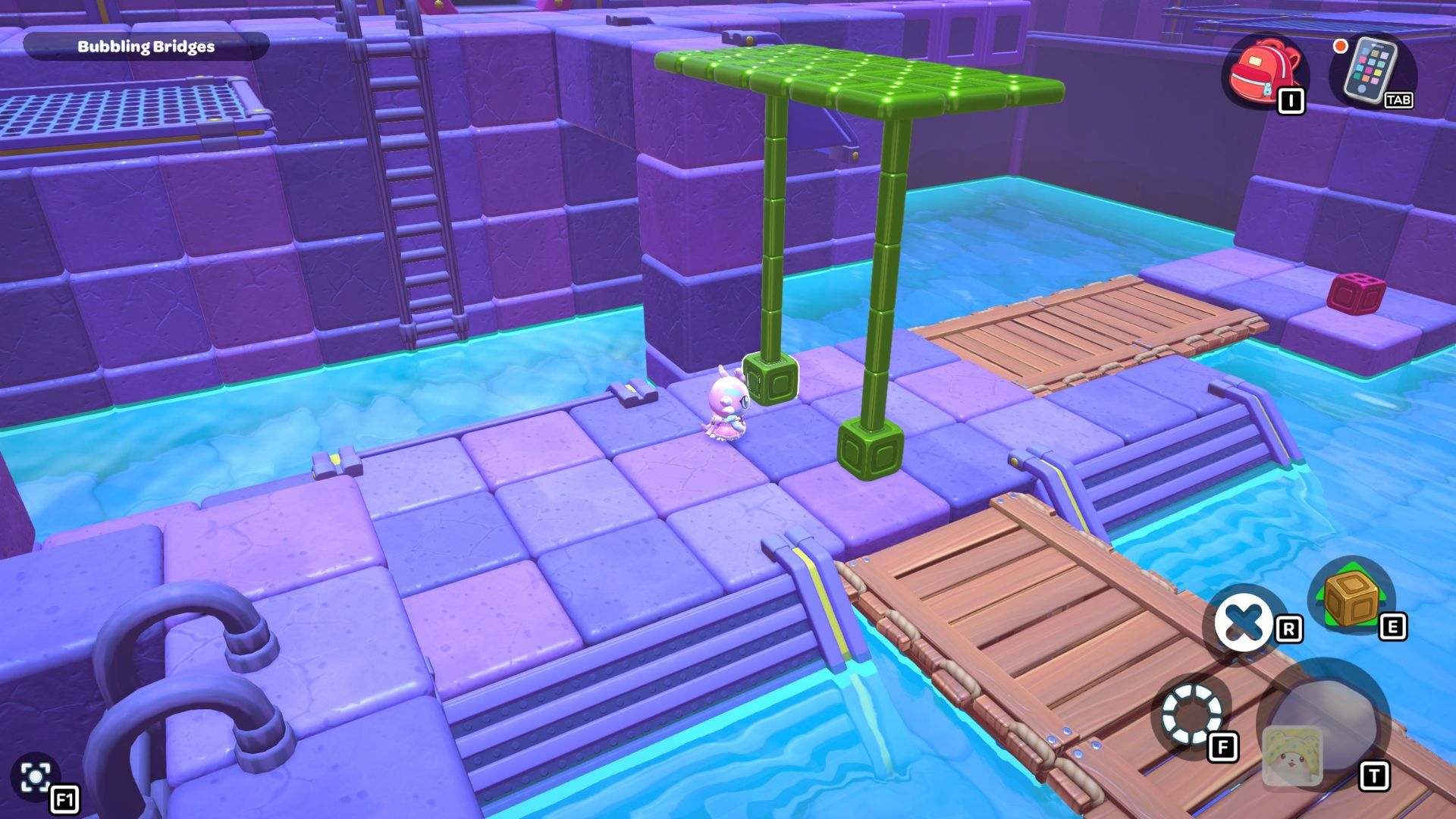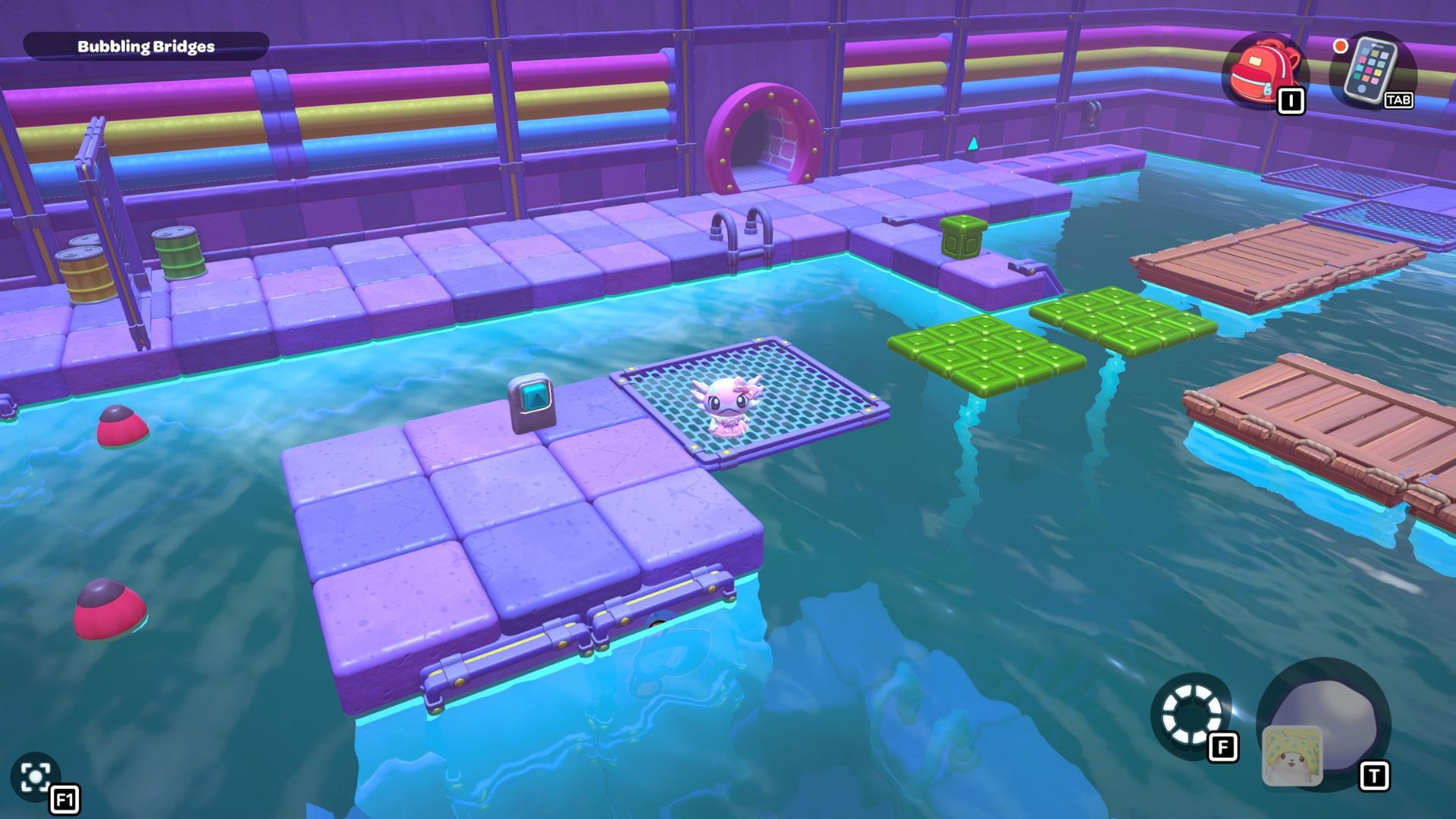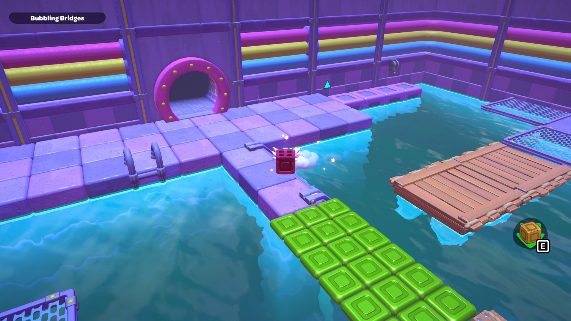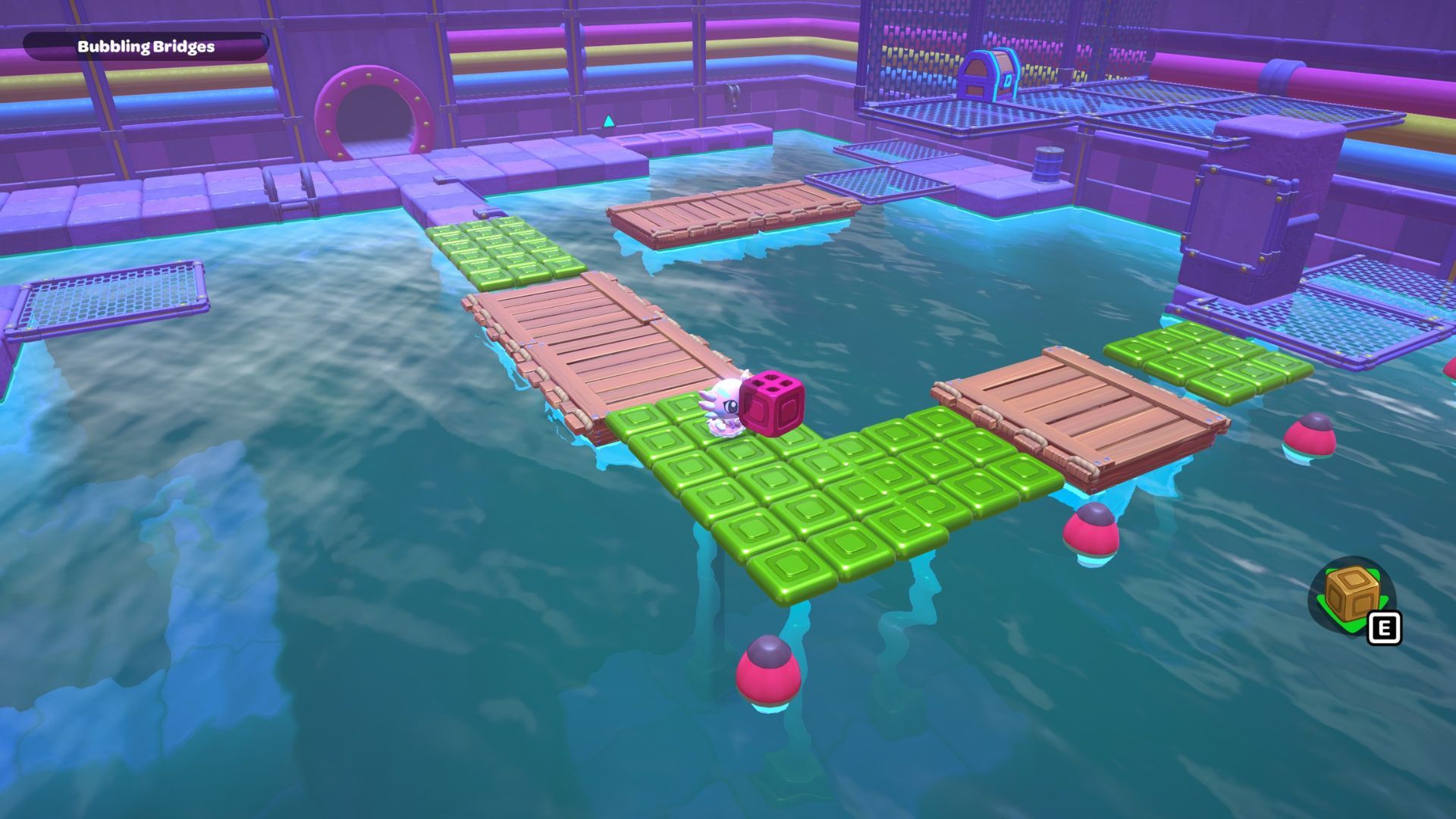 Swim to the left side of the room and pick up the red cube. Carry it across the first section of the bridge, and then place it on the platform directly in front of the tall structure that has a gold cube and a green switch.