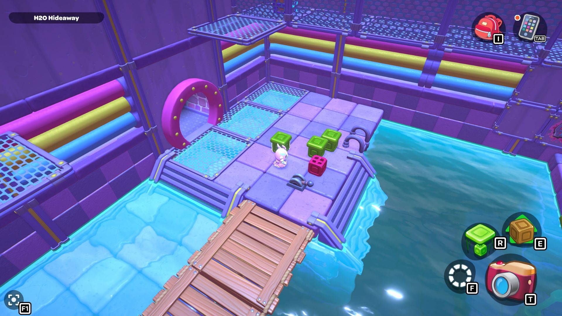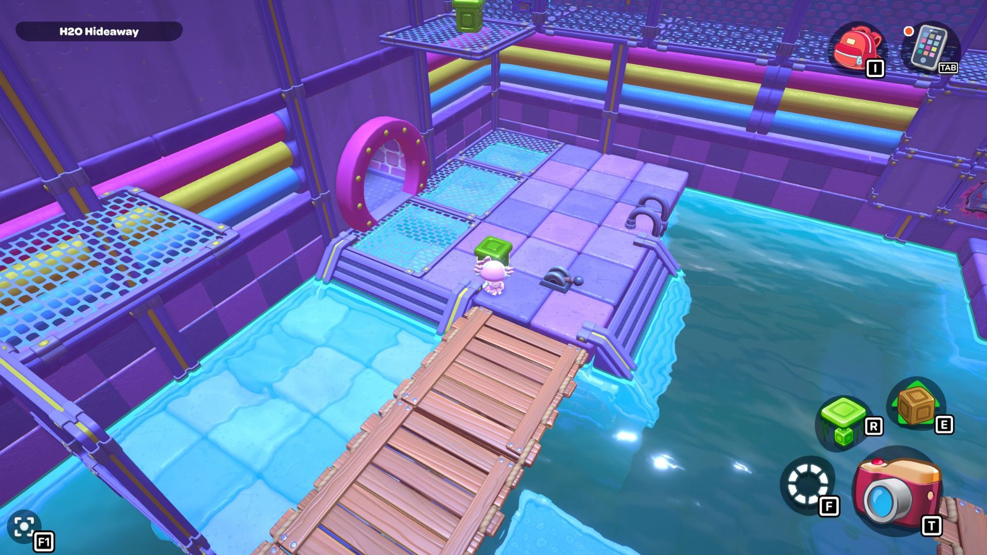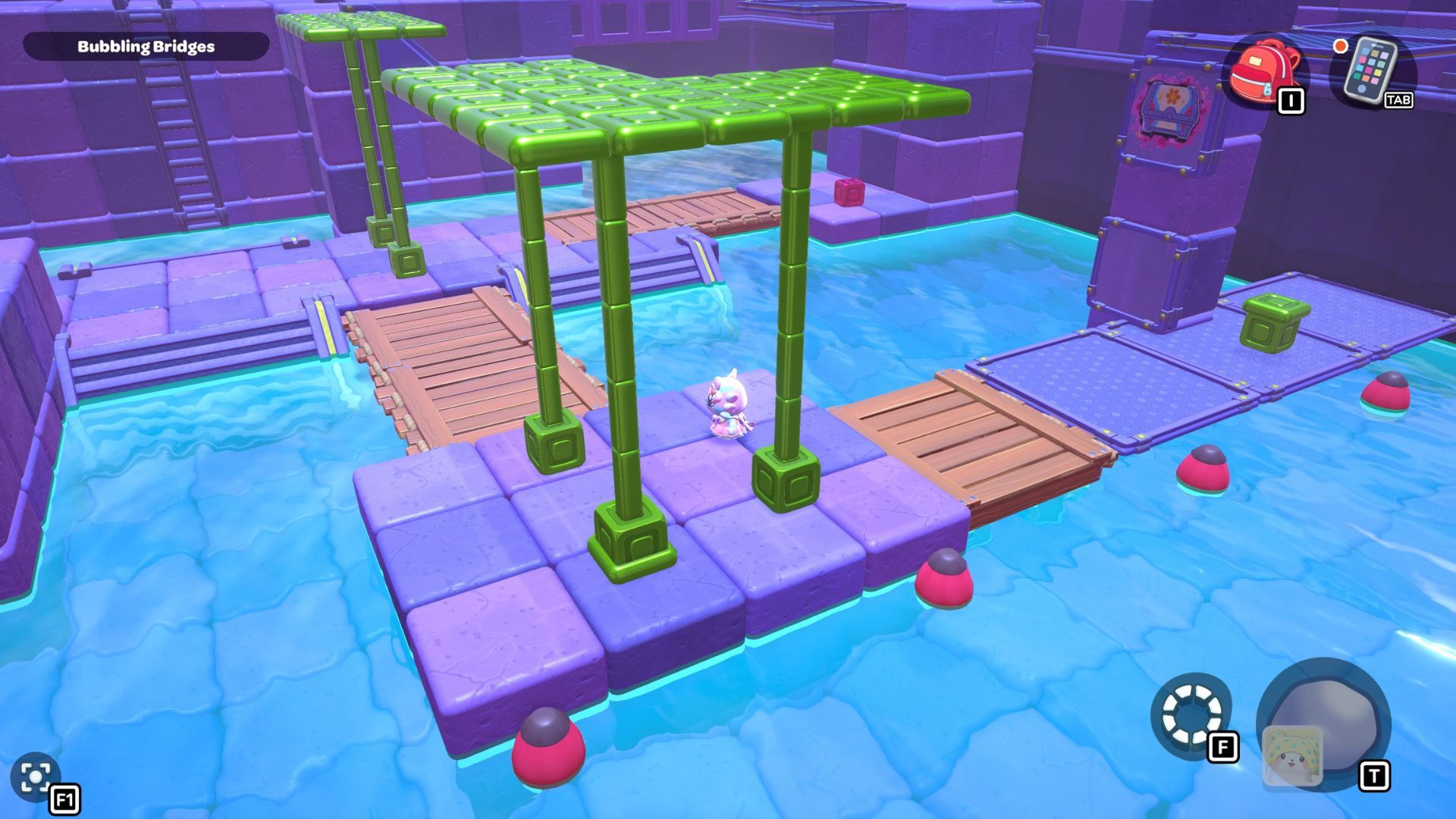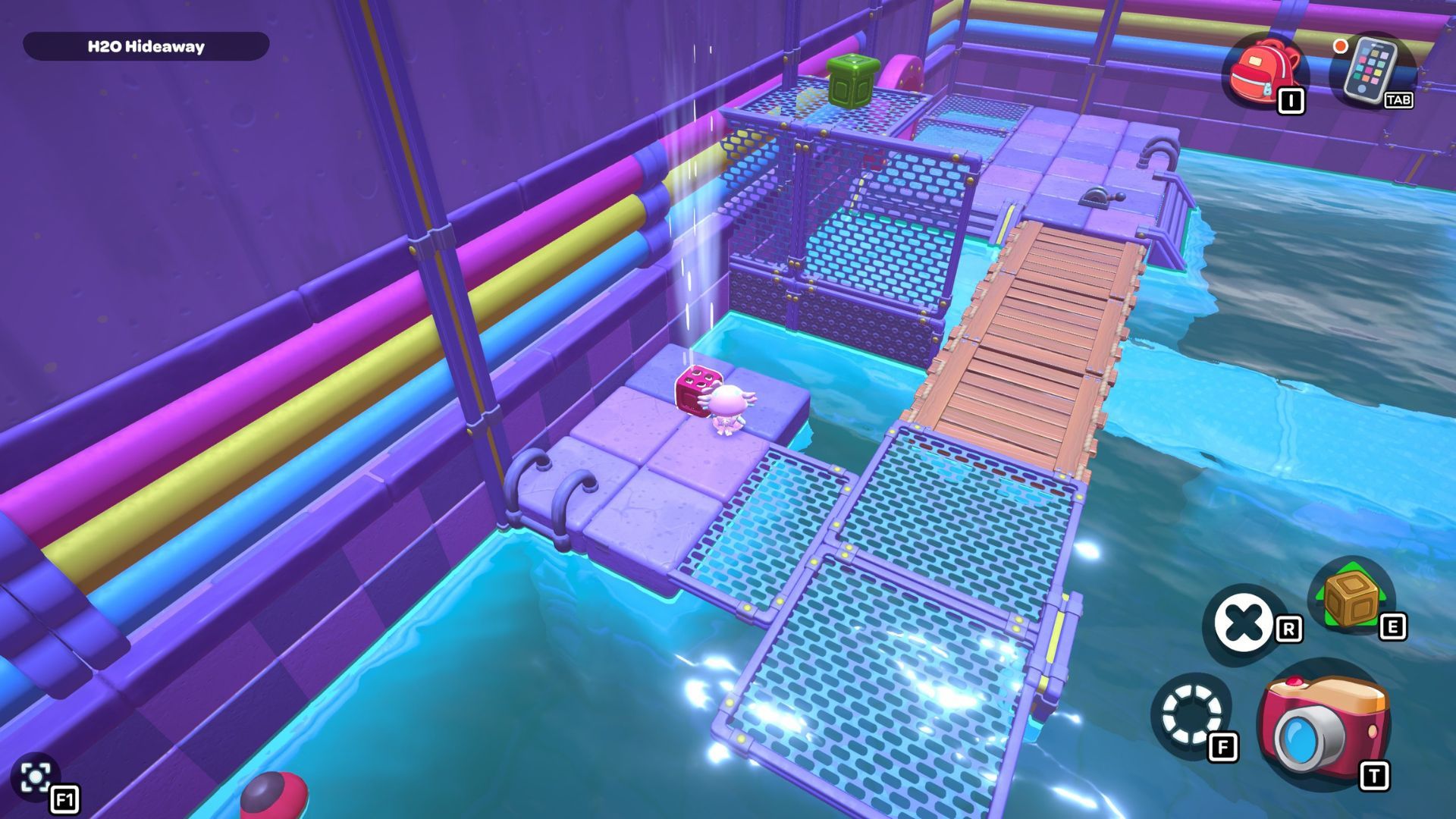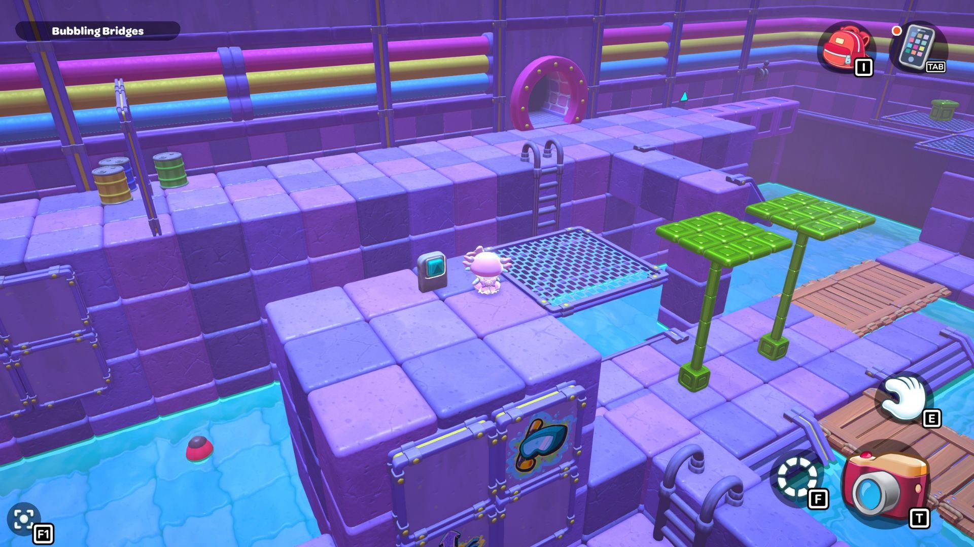 Swim to the left side of the room and pick up the red cube. Carry it across the first section of the bridge, and then place it on the platform directly in front of the tall structure that has a gold cube and a green switch.