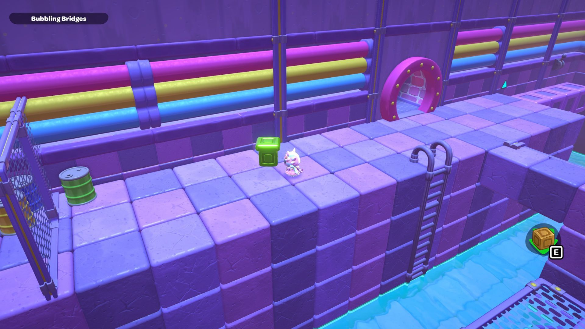 Now, focus on the three cubes at the beginning. Step onto the first wooden plank of the bridge, then jump down to the platform on the left. You’ll notice one green cube that you can’t push or move.