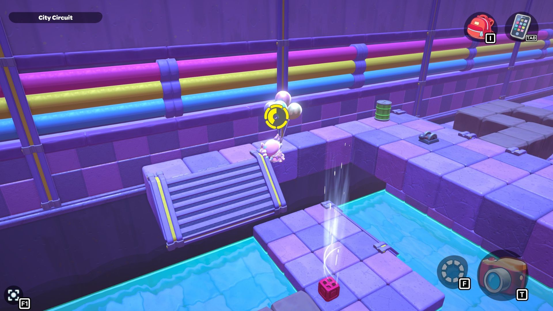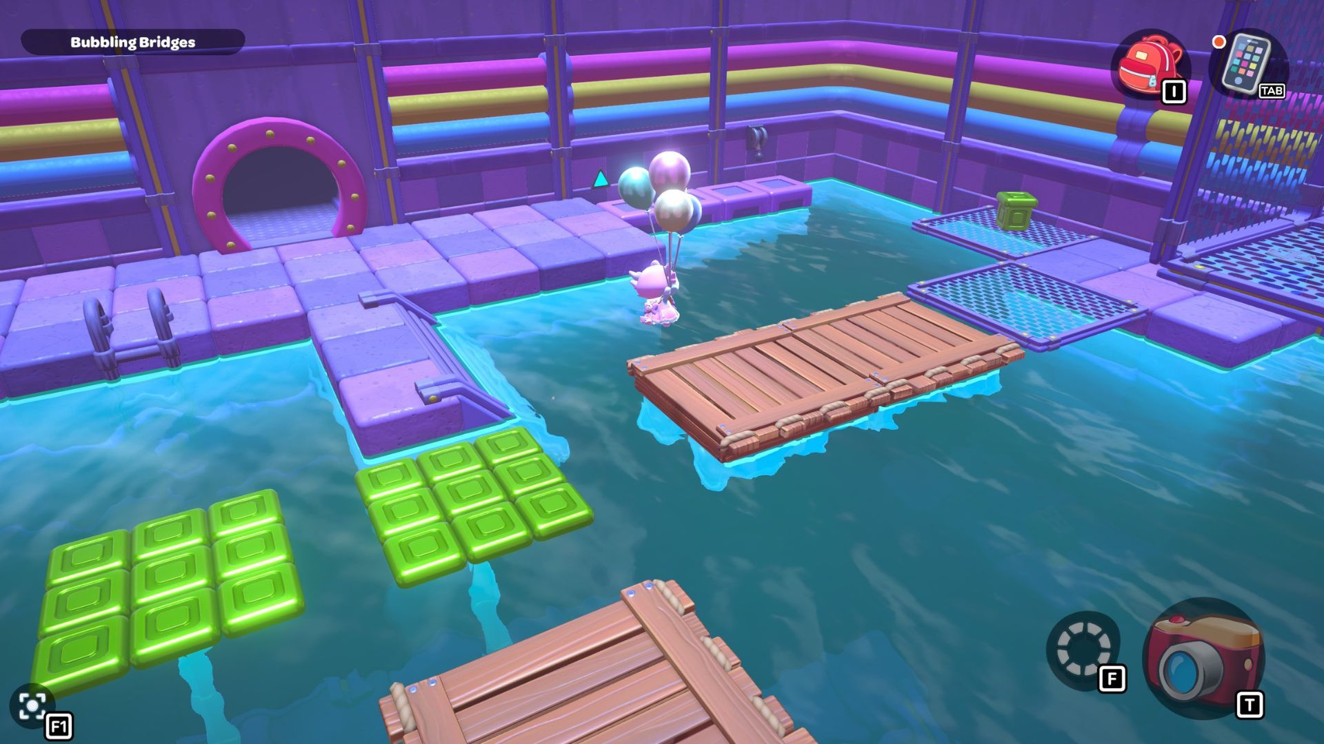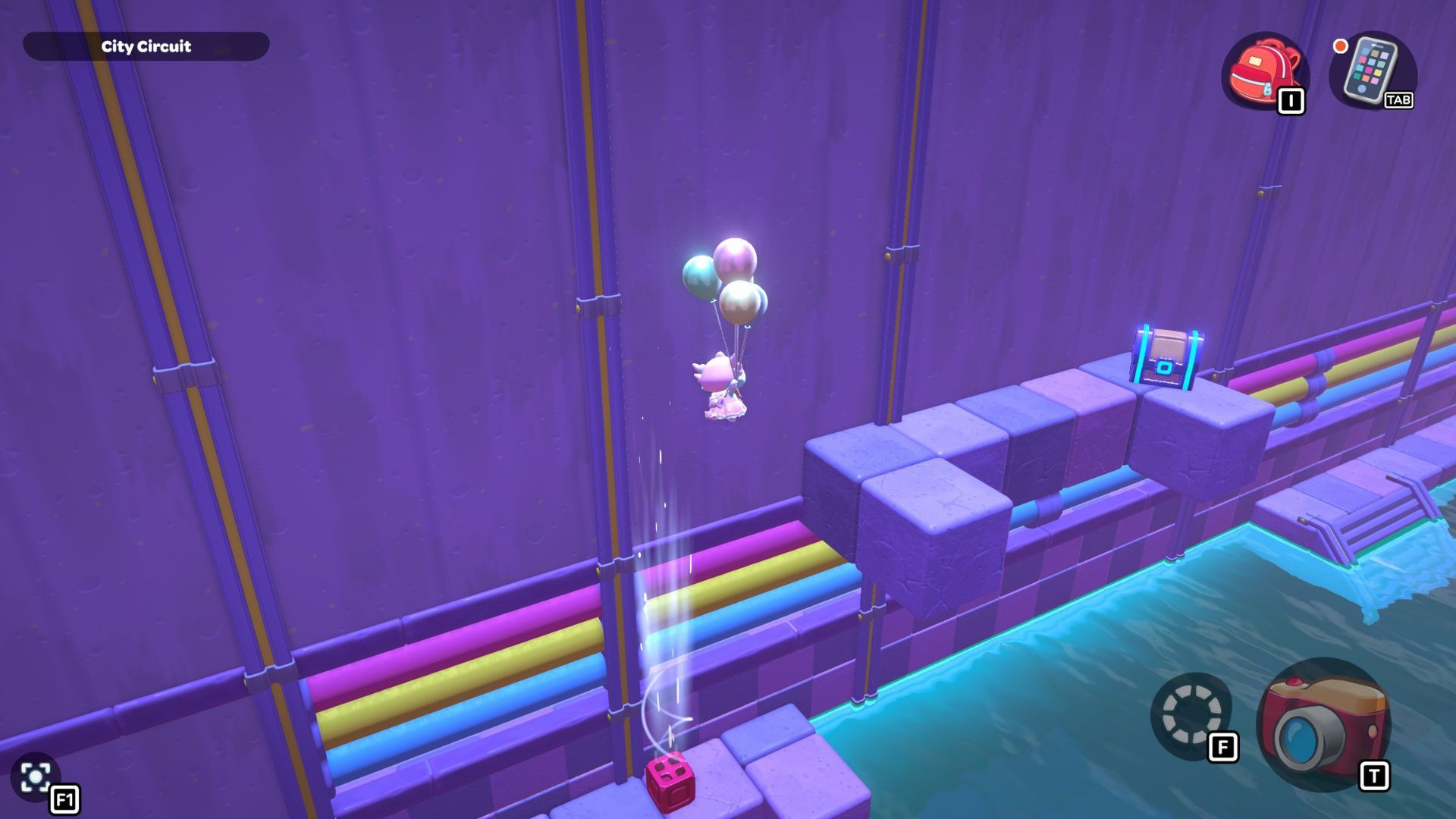 First, cross the narrow bridge to the wall on the right. Below the bridge, you’ll find a small platform. Use your balloons to gently float down onto it.
