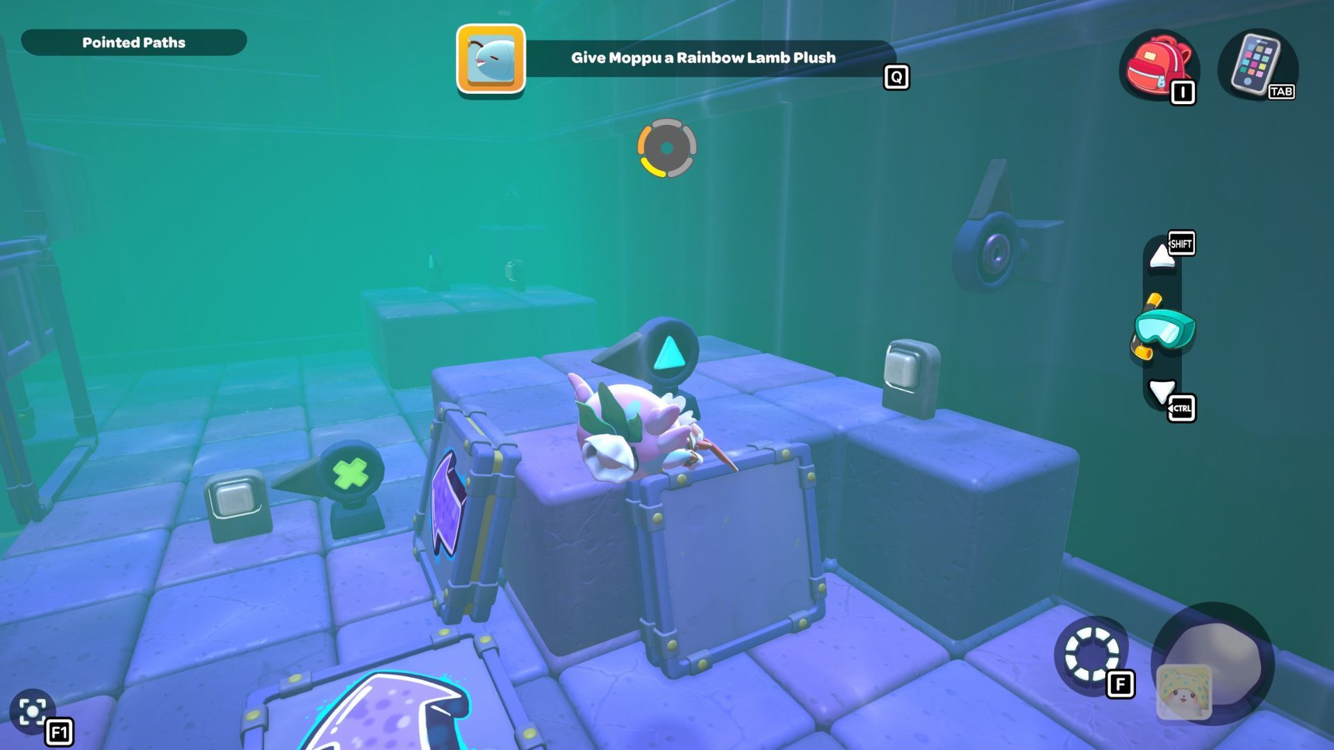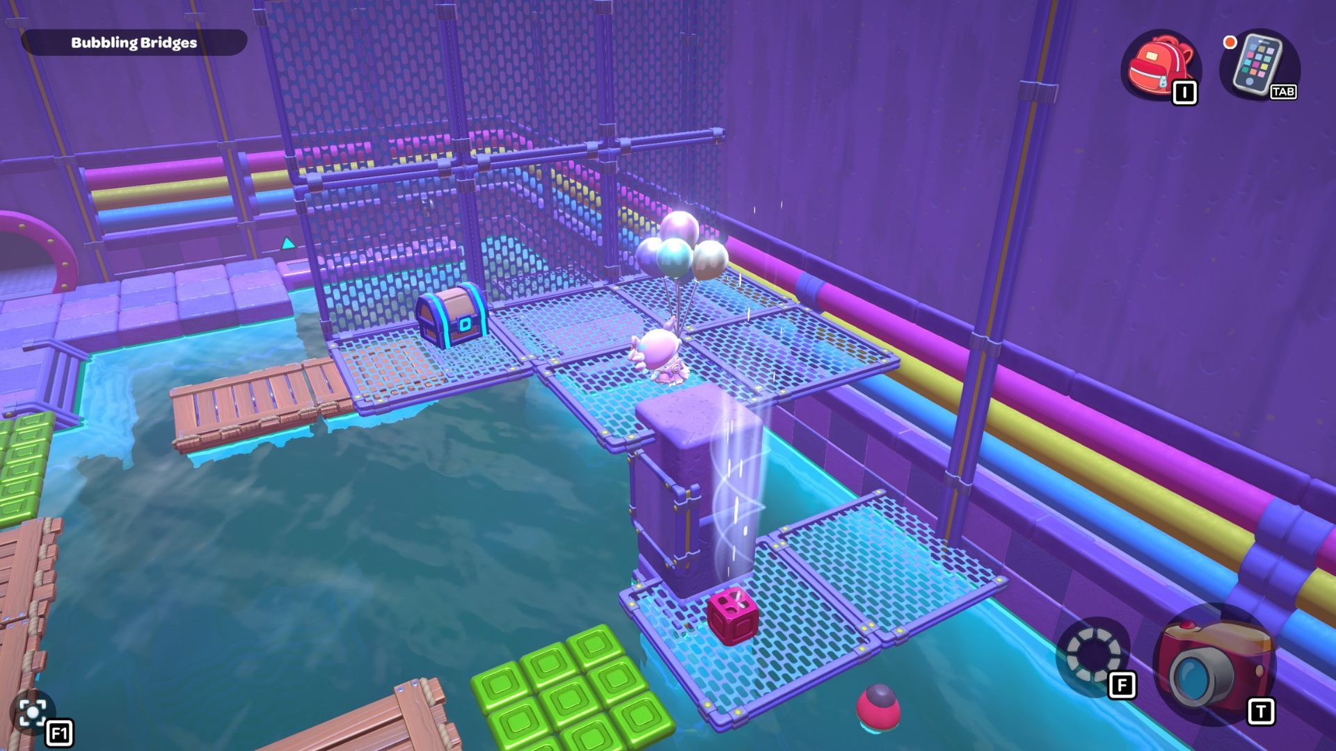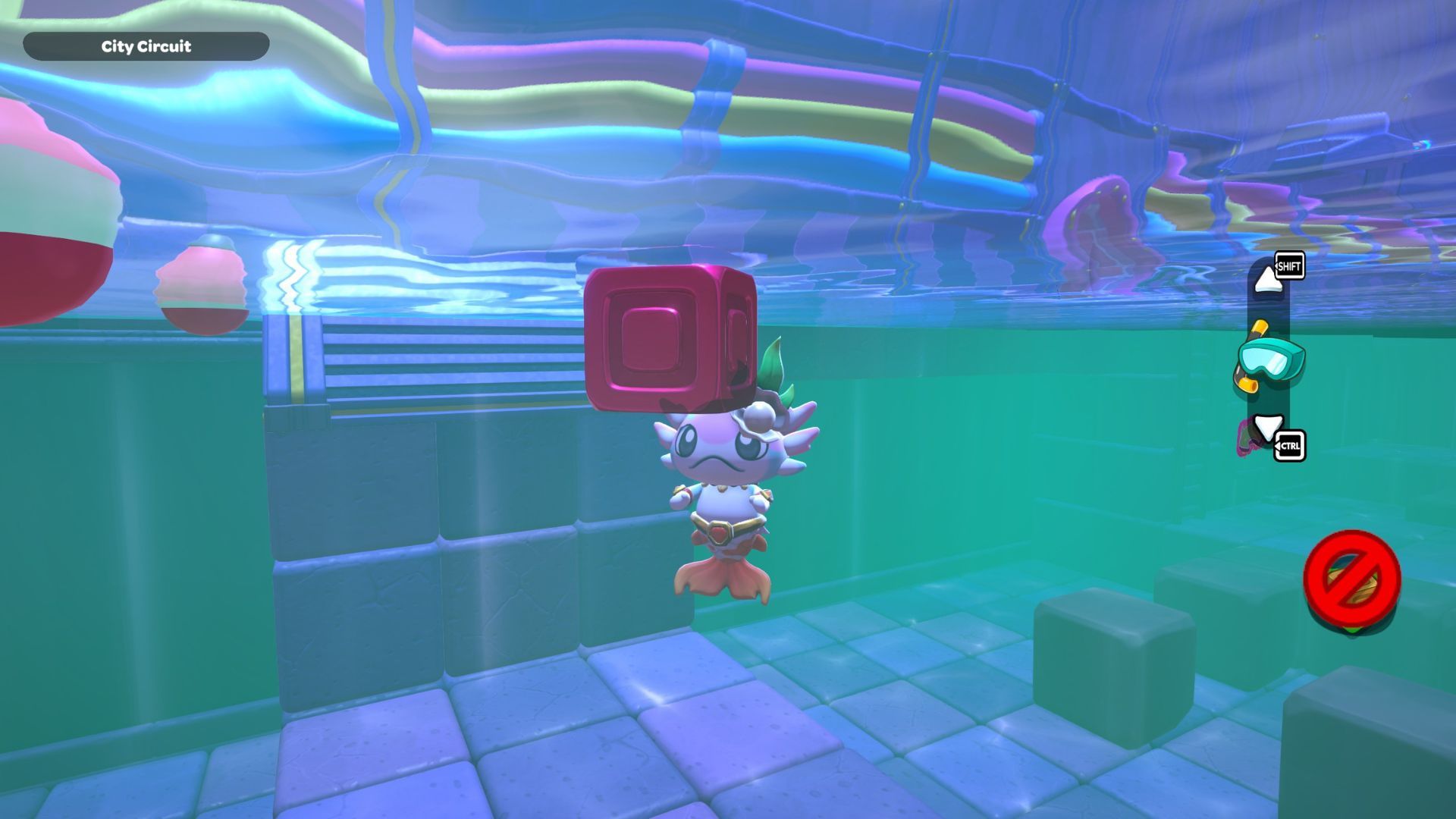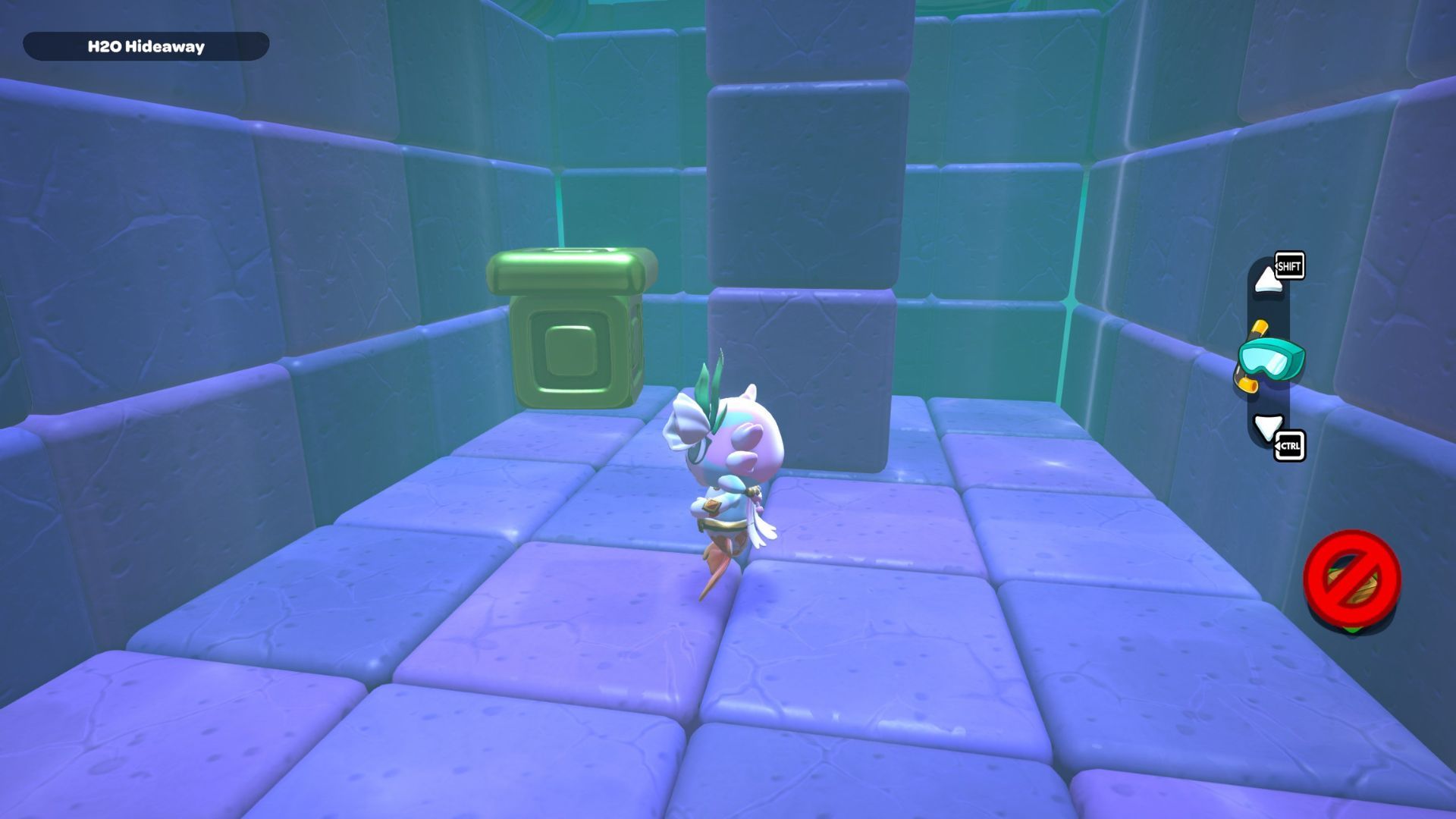 Follow the path with the red cube until you’re under the platform where the chest is located. Place the cube down, turn it on, and then fly up to the higher platform. Opening the chest up there will reward you with a Seaweed Hat.
