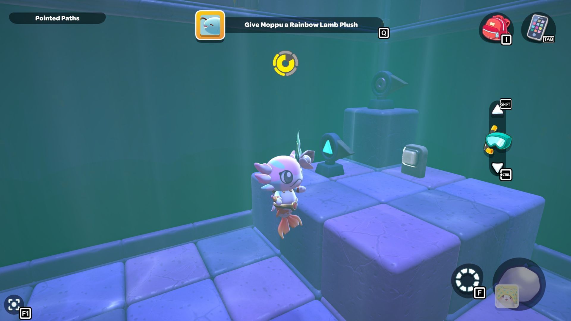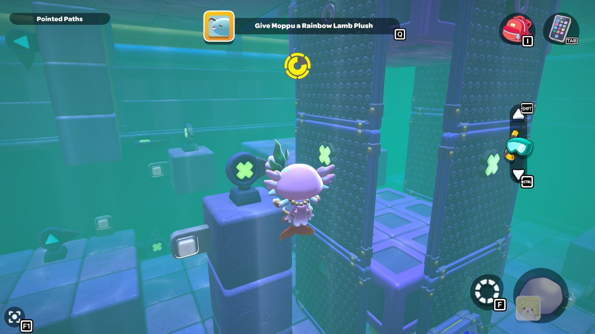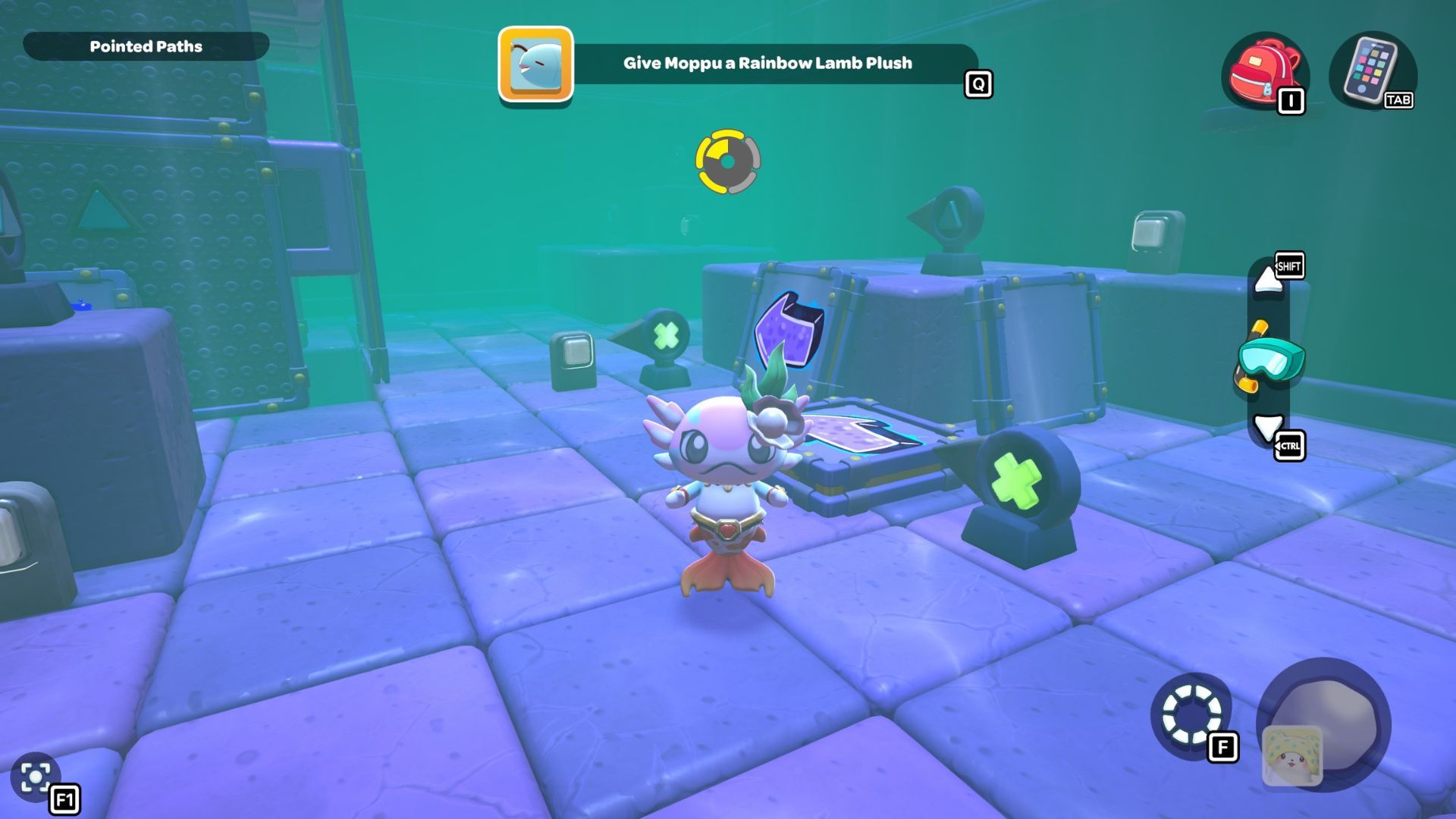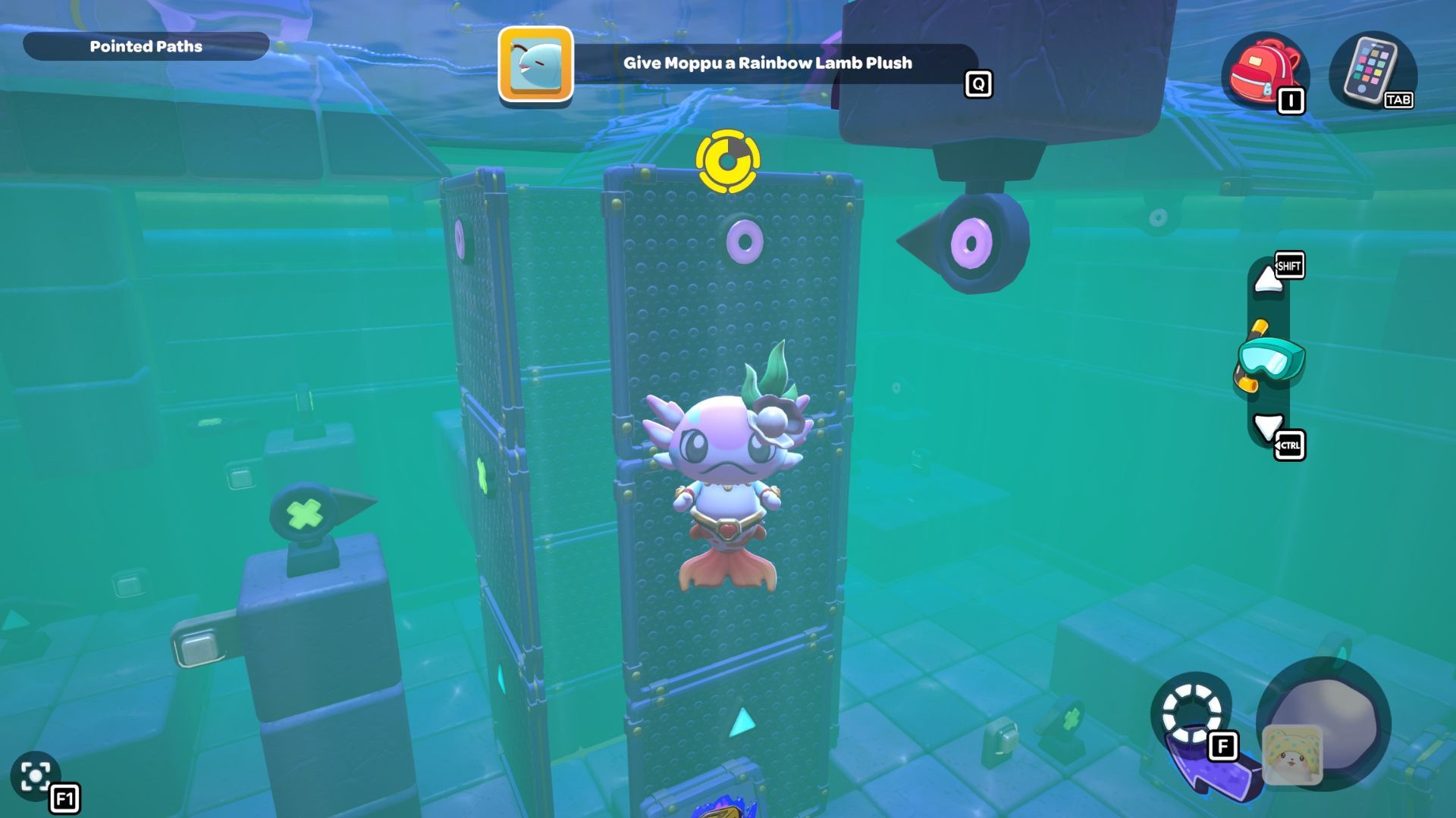 Follow the path with the red cube until you’re under the platform where the chest is located. Place the cube down, turn it on, and then fly up to the higher platform. Opening the chest up there will reward you with a Seaweed Hat.