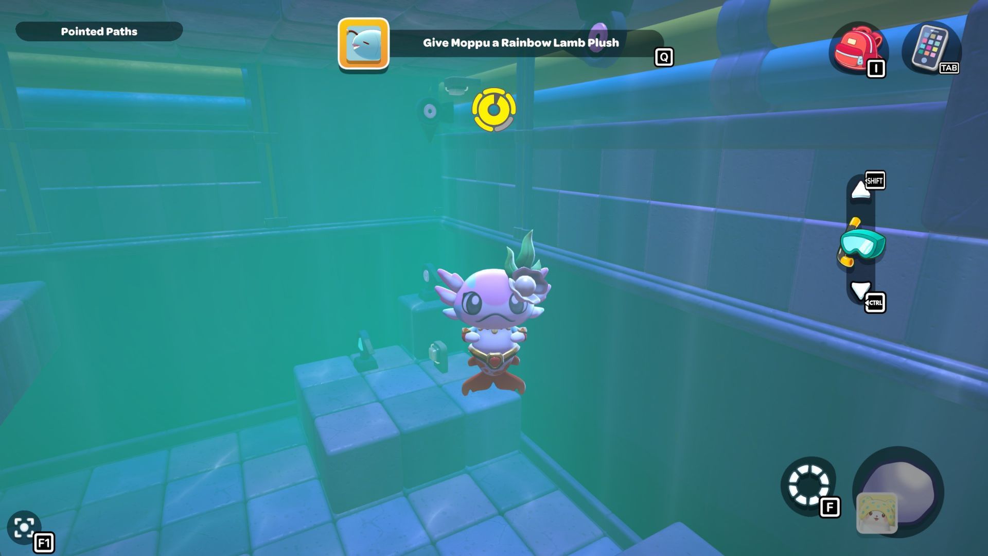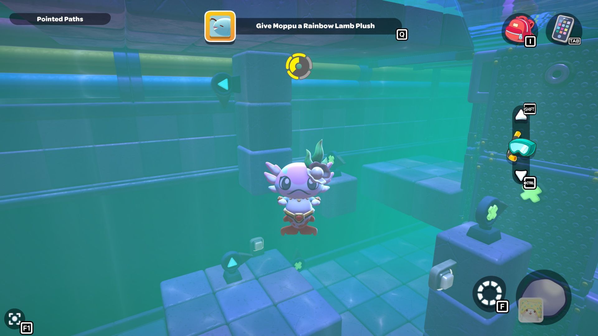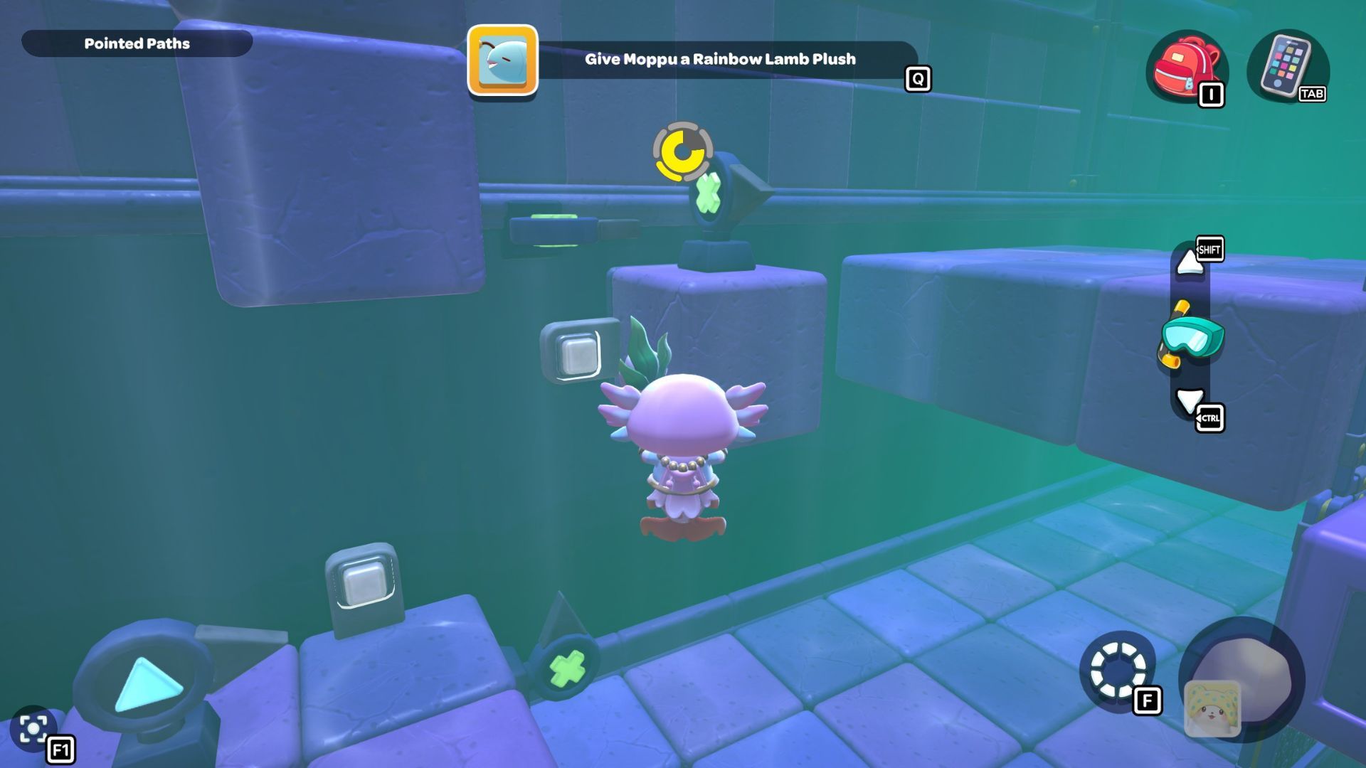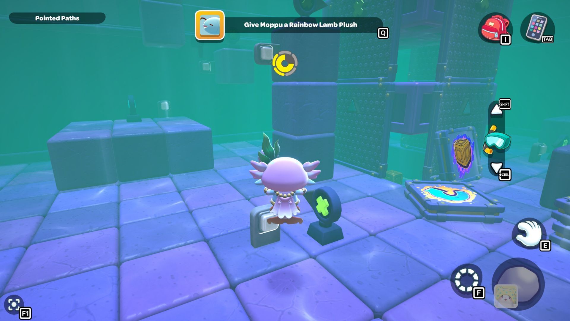 Follow the path with the red cube until you’re under the platform where the chest is located. Place the cube down, turn it on, and then fly up to the higher platform. Opening the chest up there will reward you with a Seaweed Hat.