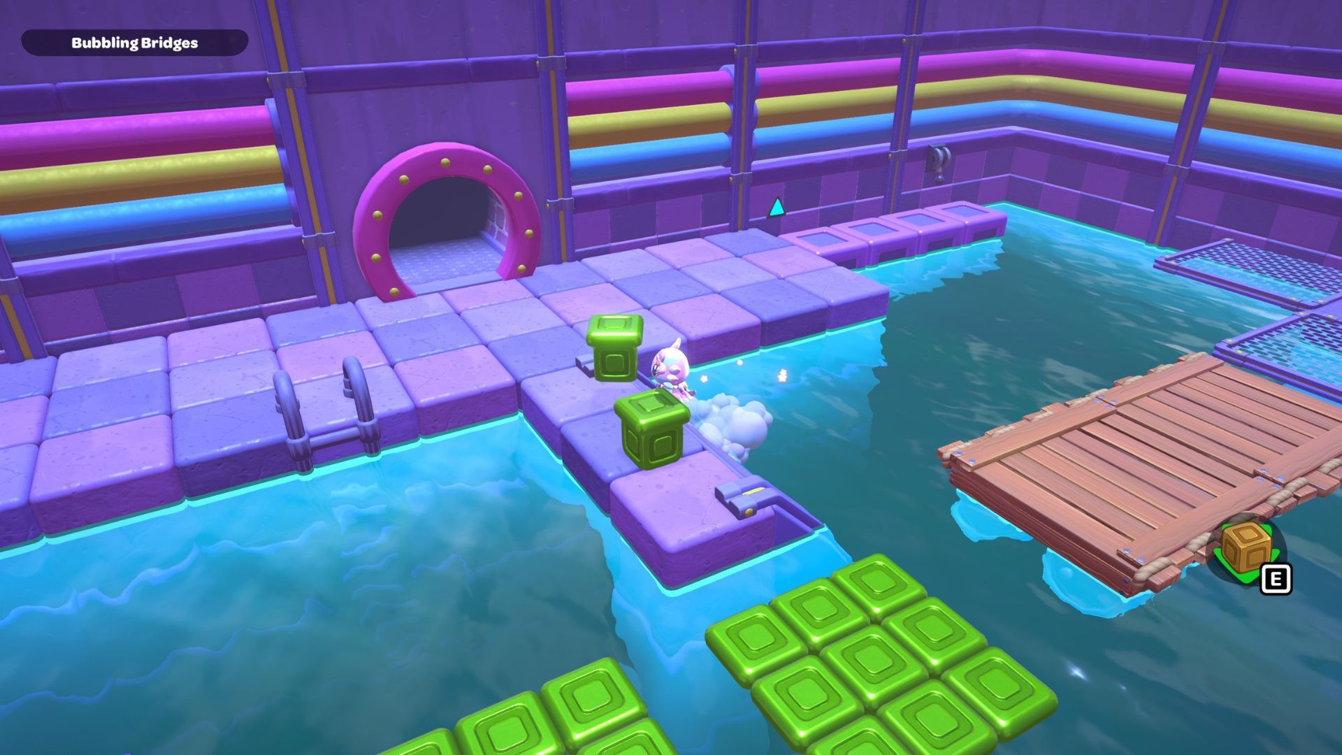 Finally, attach the wooden raft to the platform under the chest. You’ll see a green block nearby – move it into the gap between the bridge and the platform, then activate it to finish building the path.