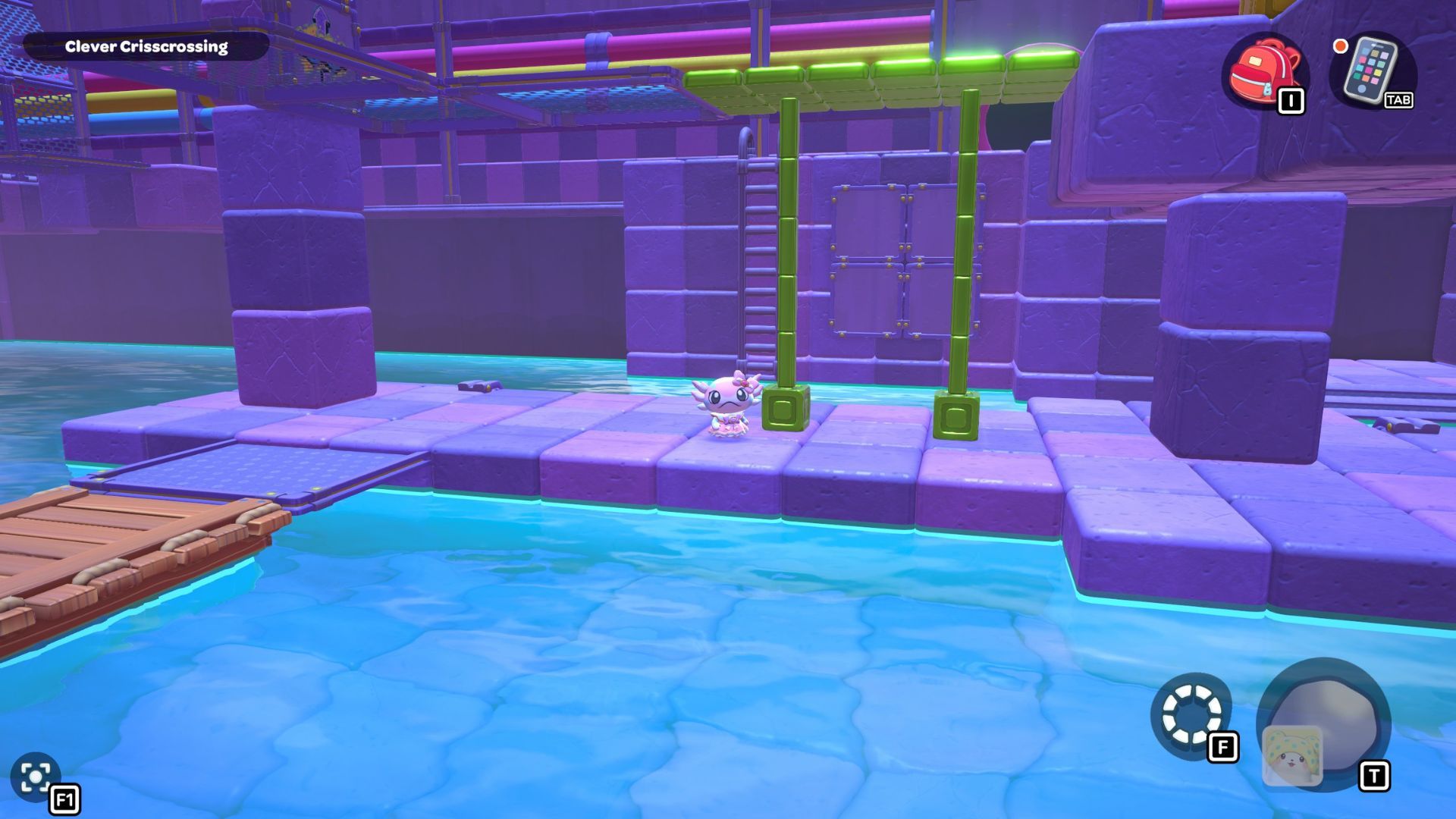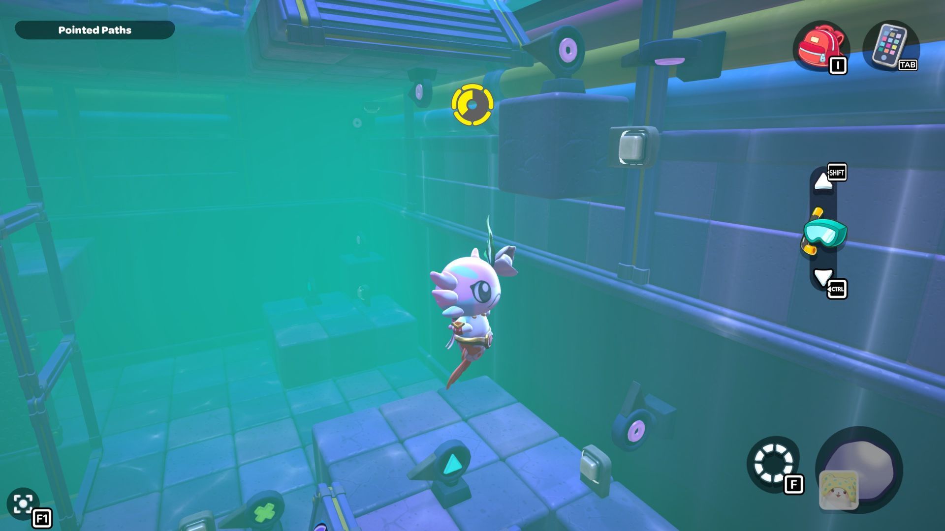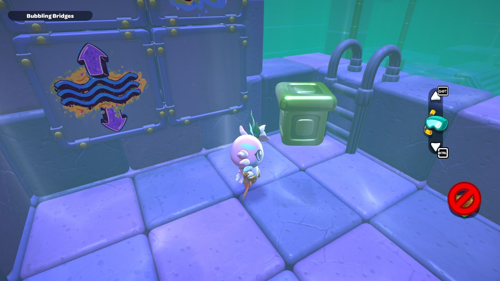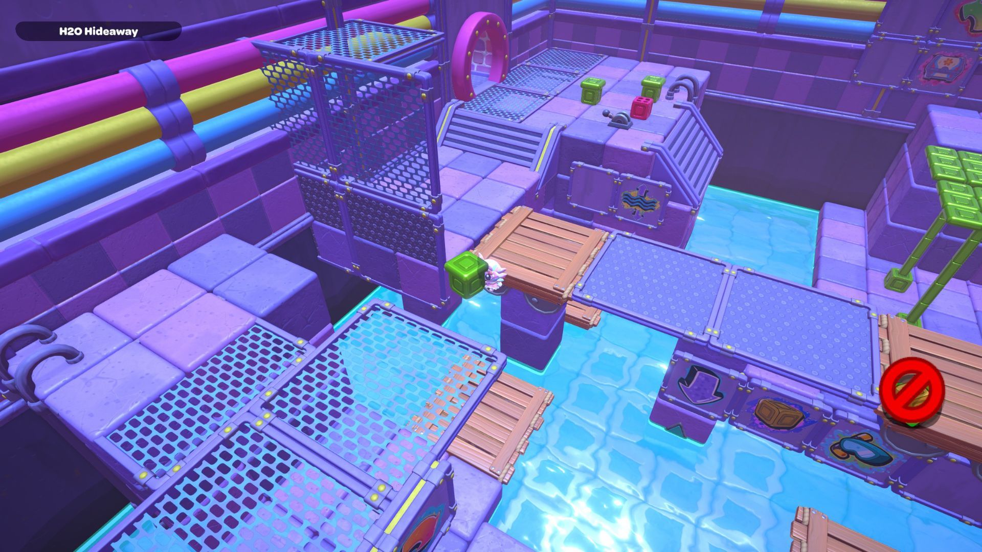 Jump from here and glide over to the platform with the X-shaped switch in the corner, then press it. After that, jump into the water and swim under the wall on the right to reach the next area.