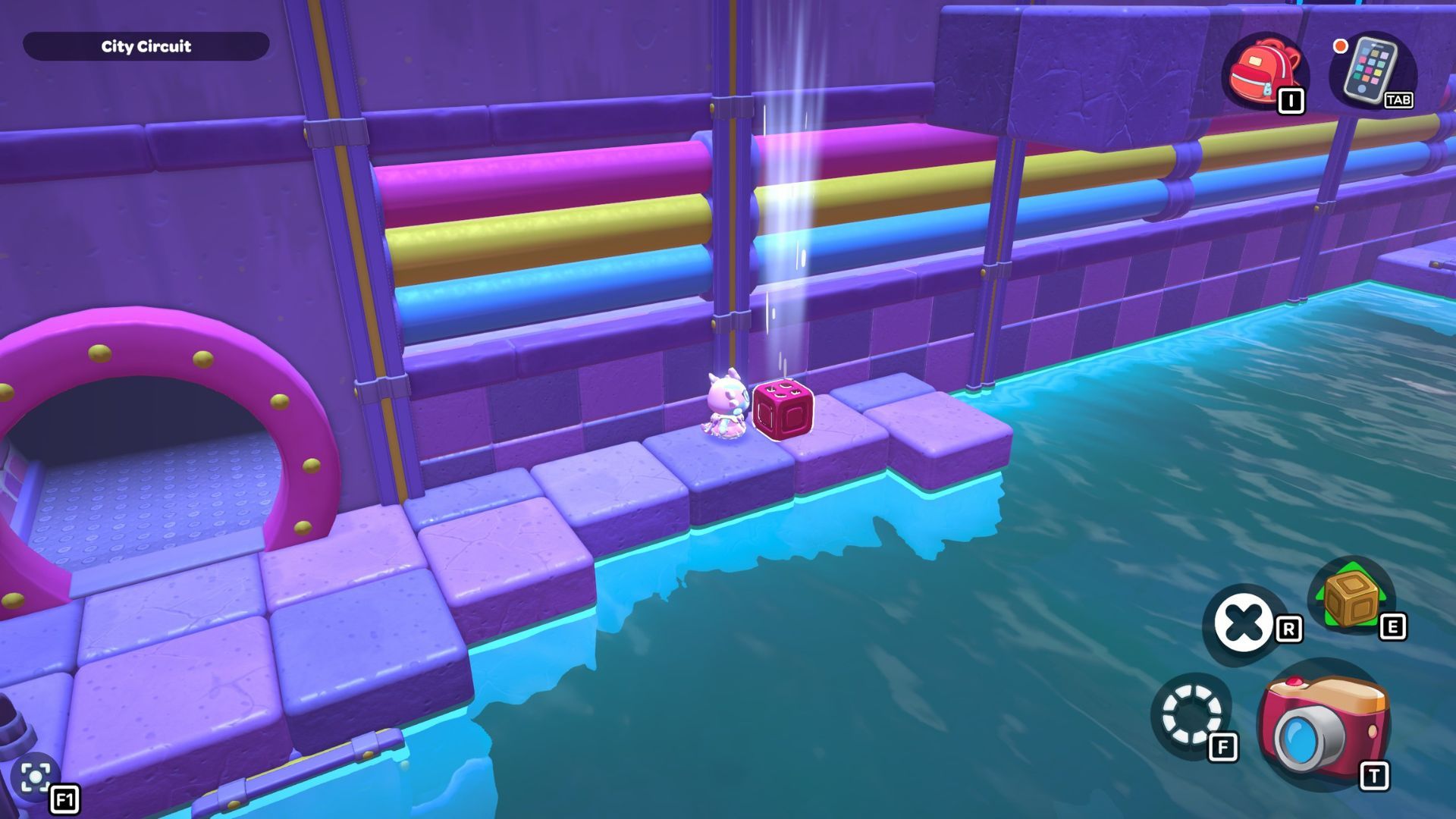Begin by jumping across the rocks in the water. Once you reach the next platform, step on the blue triangle switch. Then, pick up the red cube and place it by the pillar at the edge of the platform to activate it. Jump up high above the cube and fly towards the platform on the west side of the room.