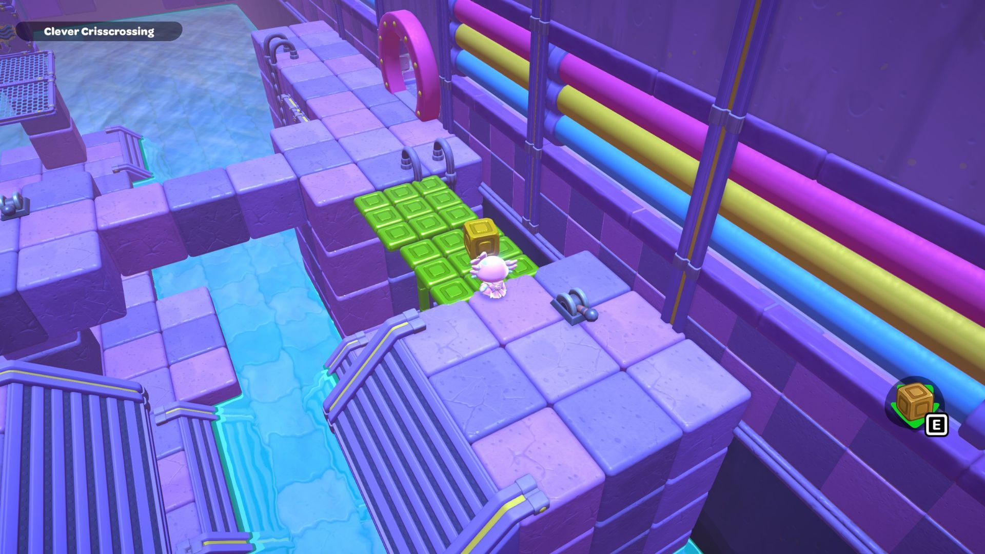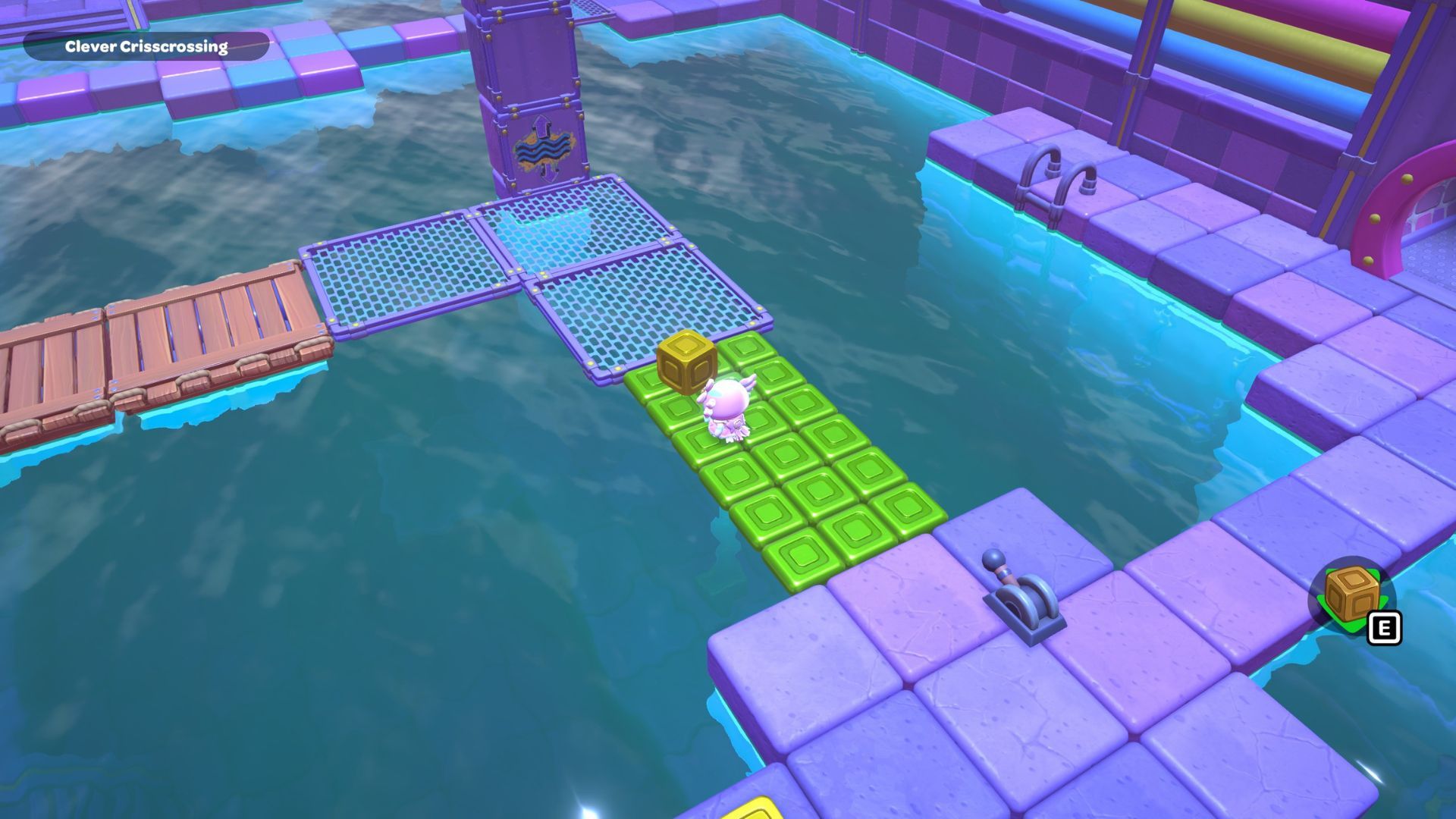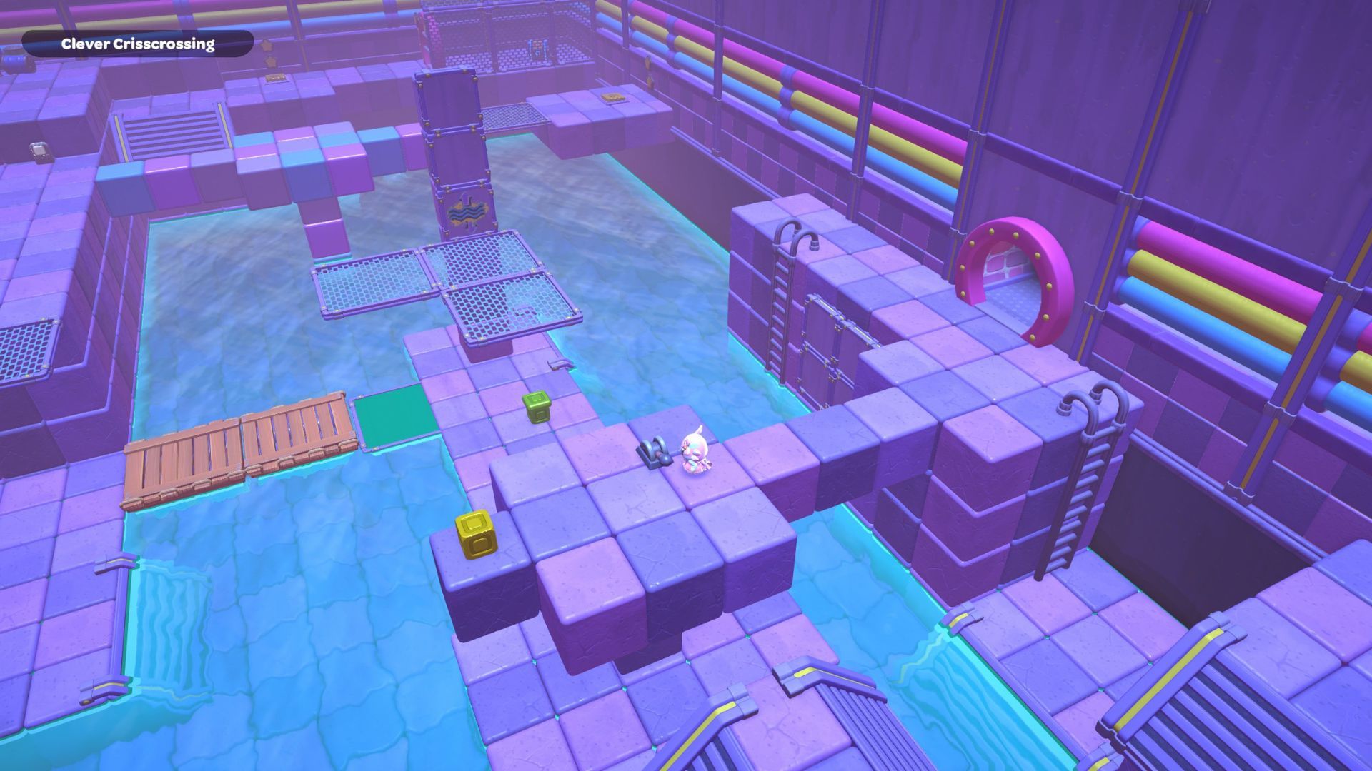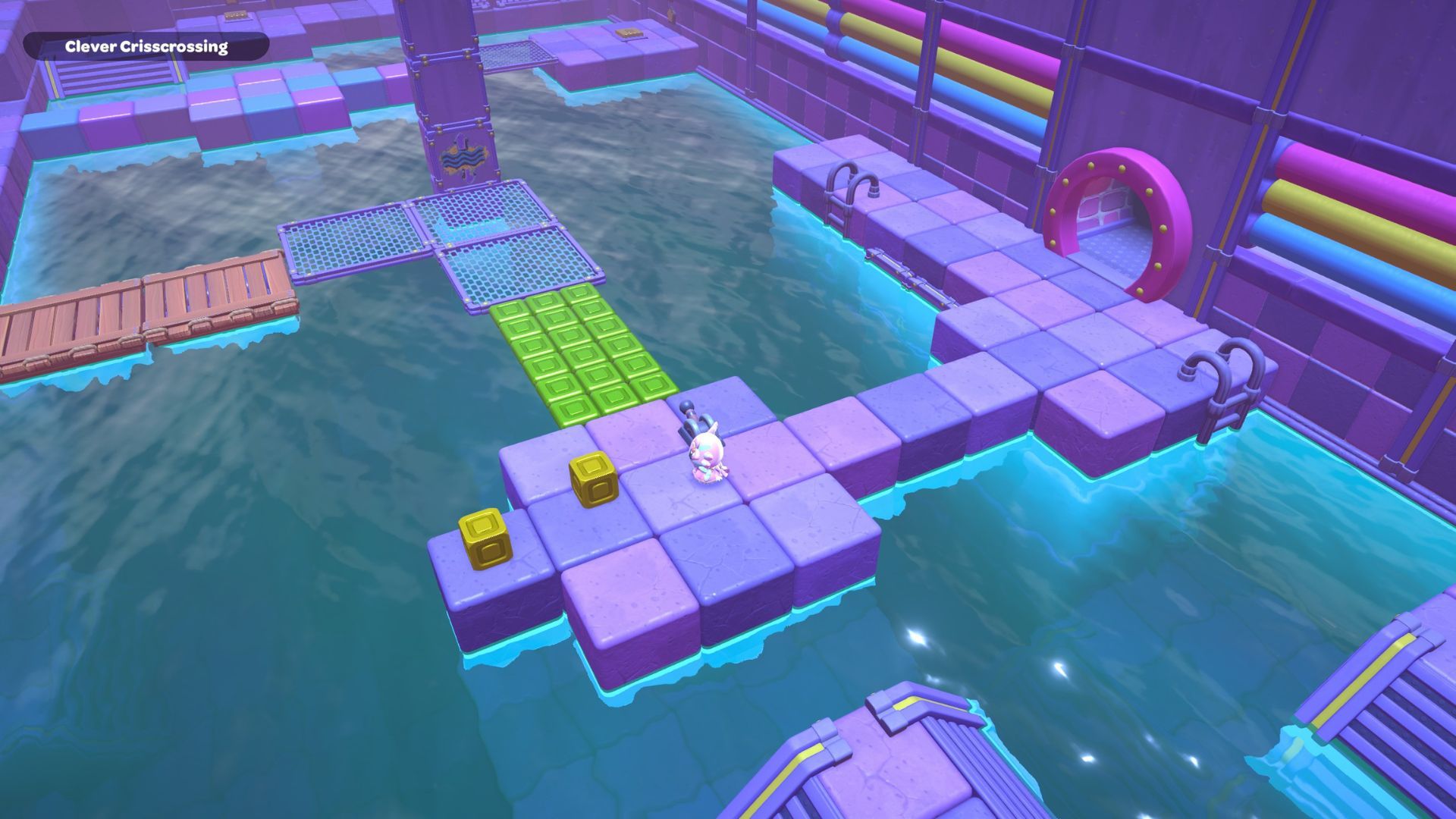 The Clever Crisscrossing puzzle is located in the middle of the City Town Sewers. To solve it, players need to move two golden cubes from the south side of the room to the top of two gold switches on the north side.