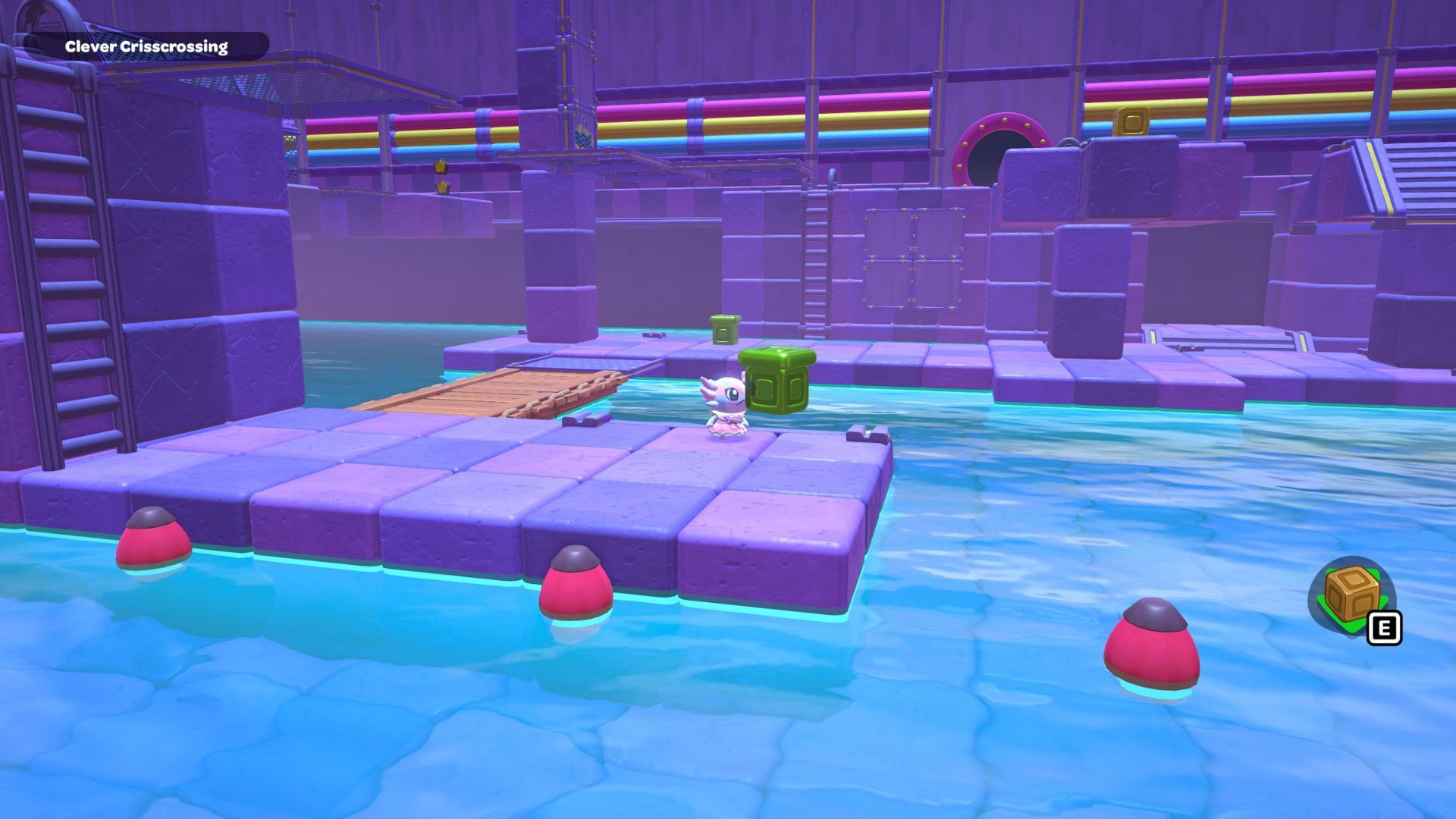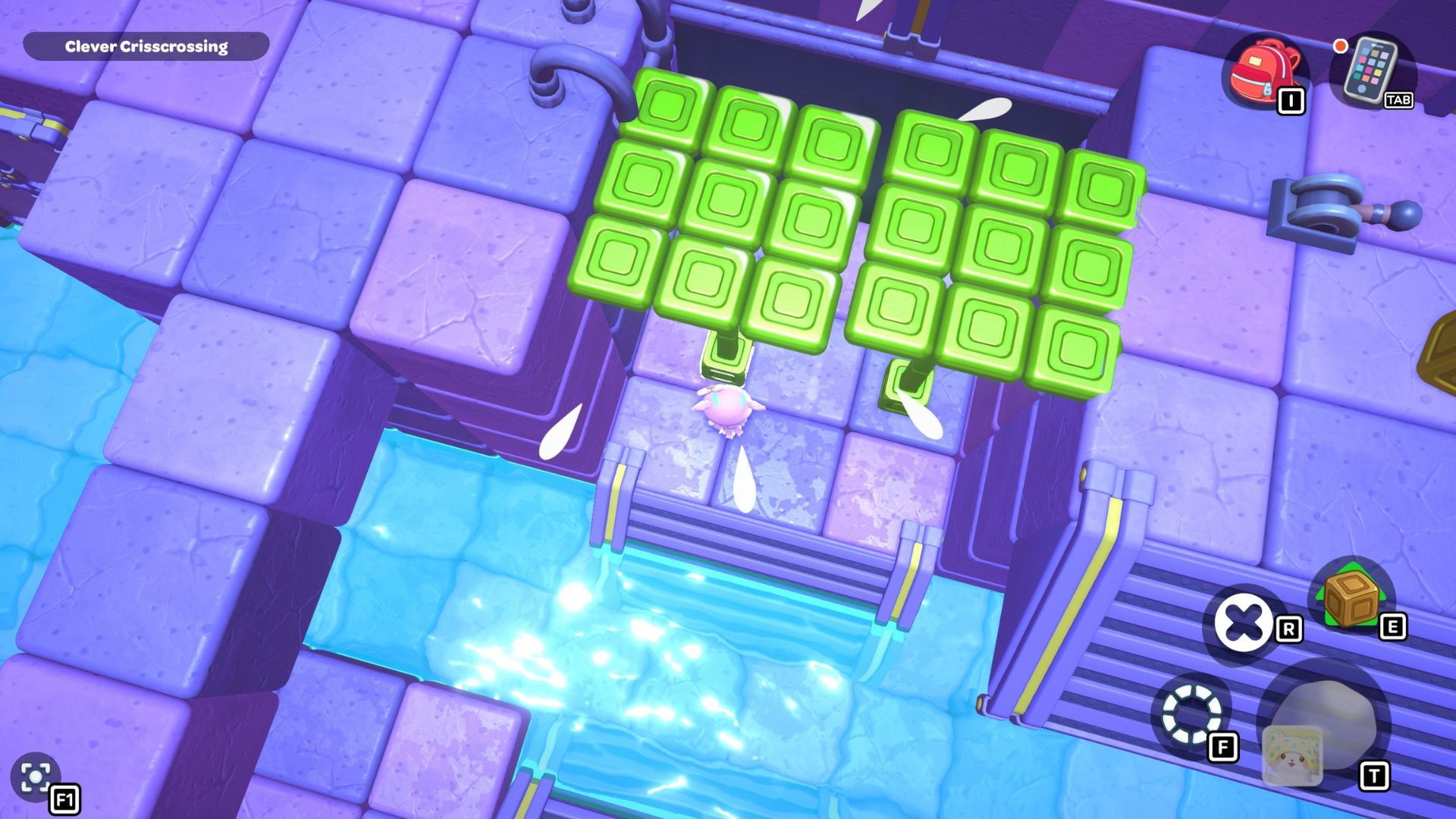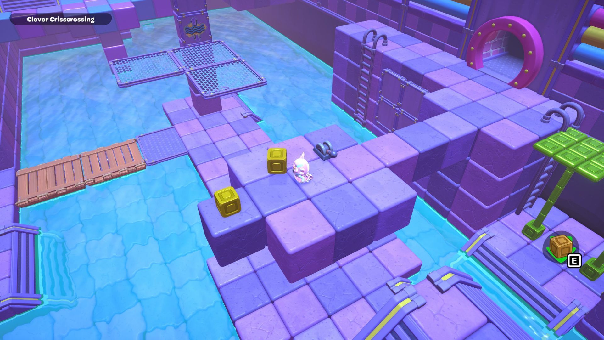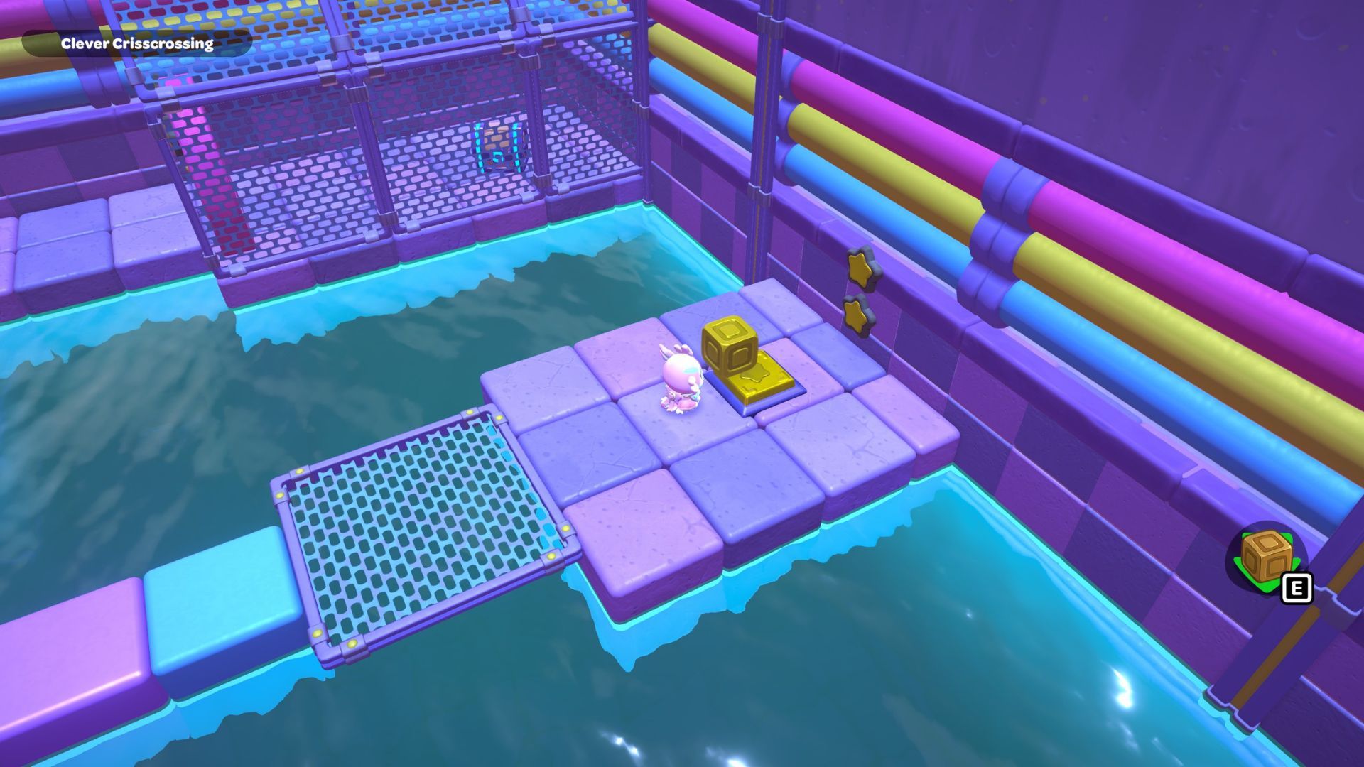 The Clever Crisscrossing puzzle is located in the middle of the City Town Sewers. To solve it, players need to move two golden cubes from the south side of the room to the top of two gold switches on the north side.