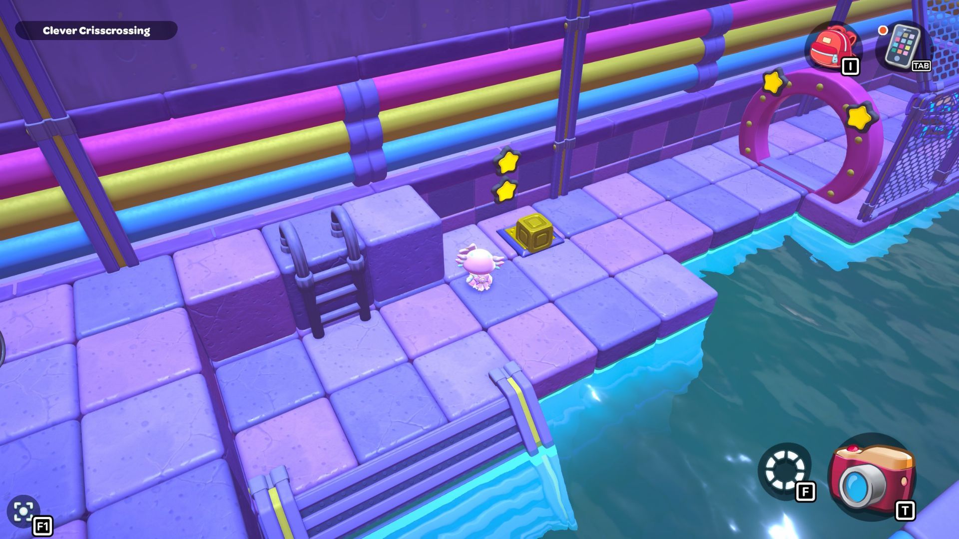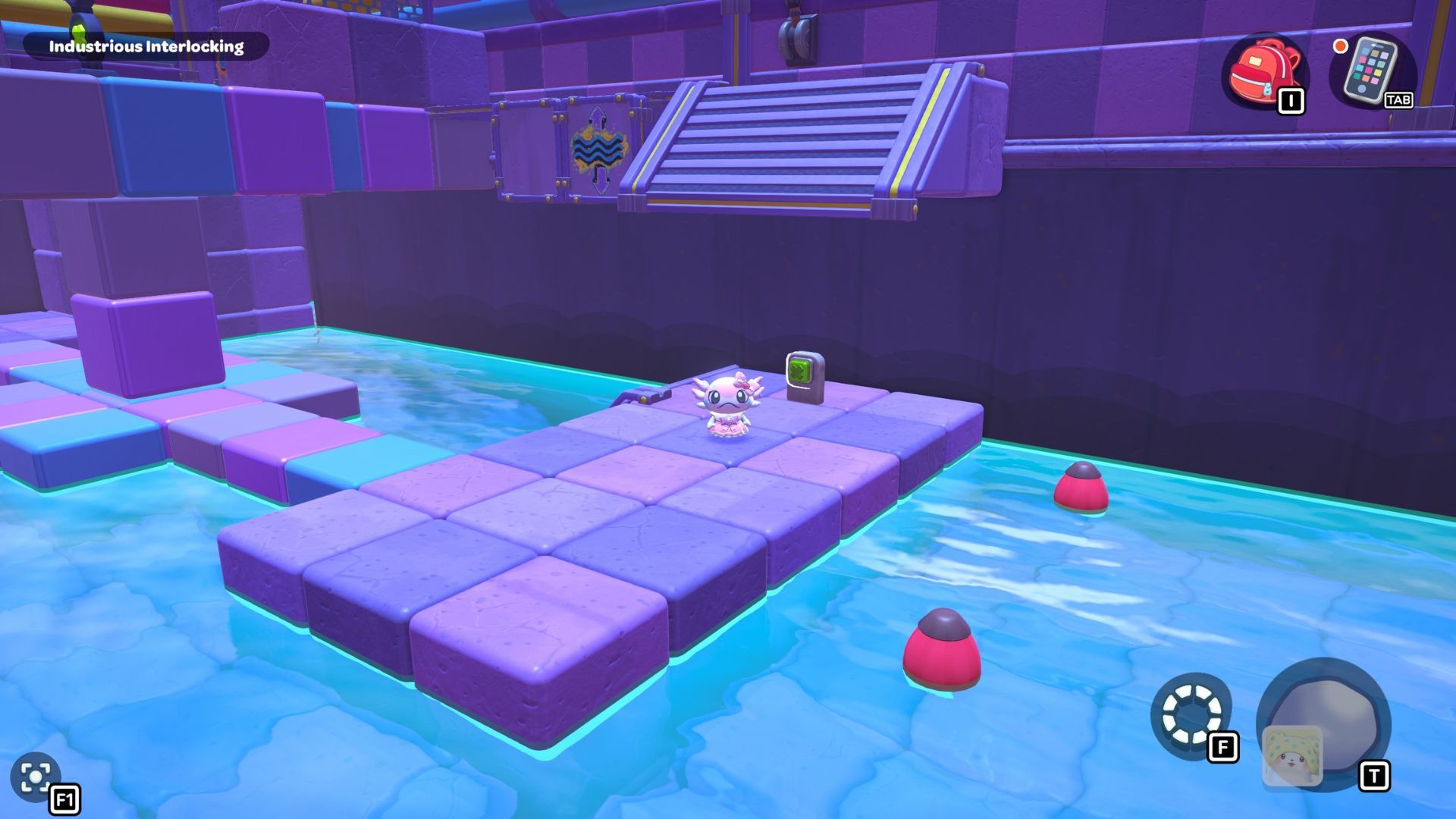 Okay, so I stepped on those two triangle switches, then dropped down and hit the X switch. After that, I swam back to the first platform and jumped across the rocks to where the red cube was. I grabbed it and carried it all the way back to where I started. That let me glide up to the ledge with the X gate. Don’t forget to hit the blue switch up there!