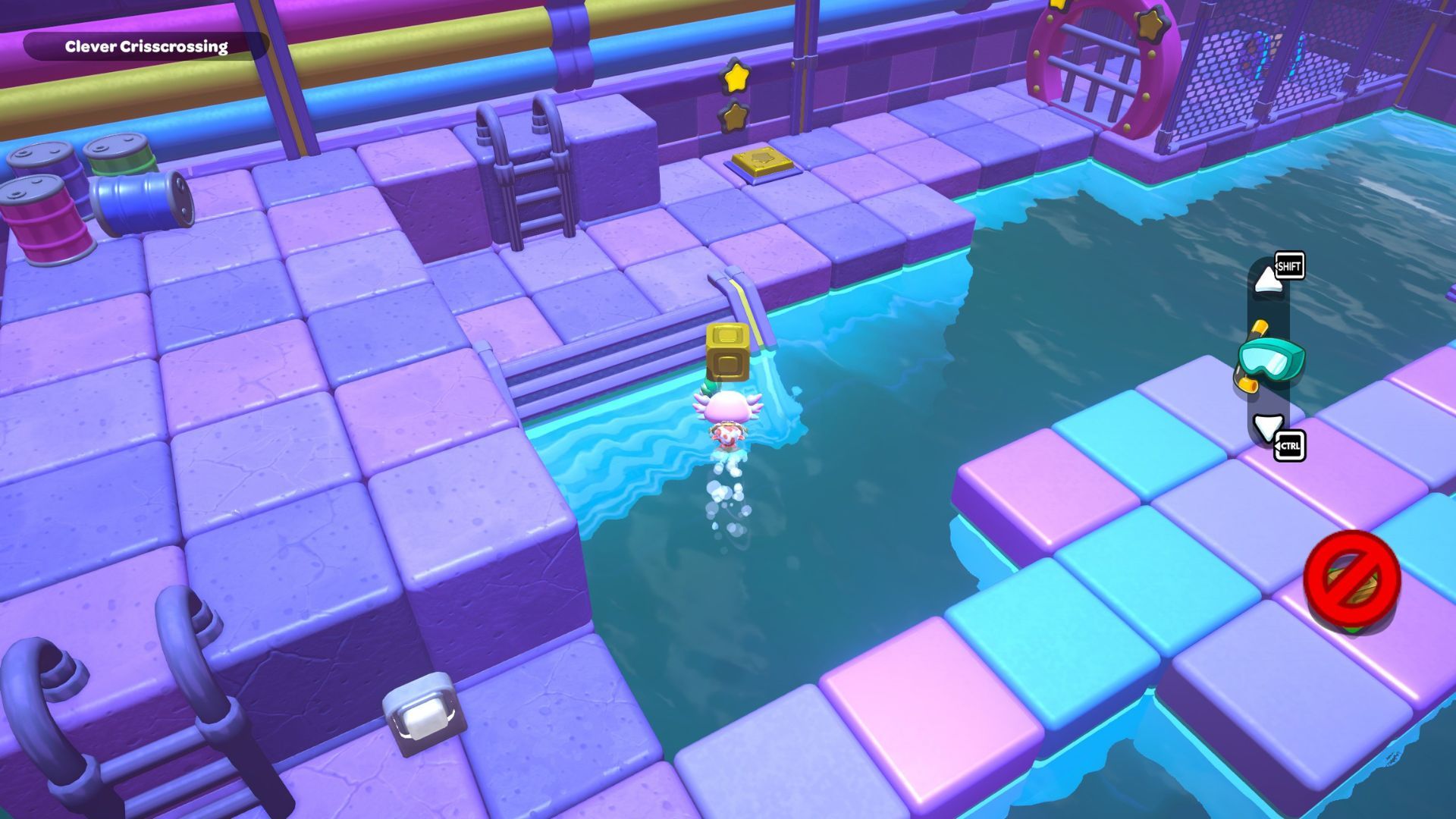 Okay, so I headed back to the middle of the room and jumped into the water on the left. Down there, I found a bunch of X switches, just like the ones I saw up top. The trick is the same as with the O switches – I need to look for the switches that have been replaced with gold boxes and press those!