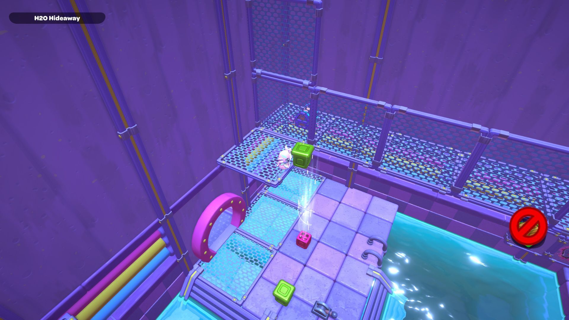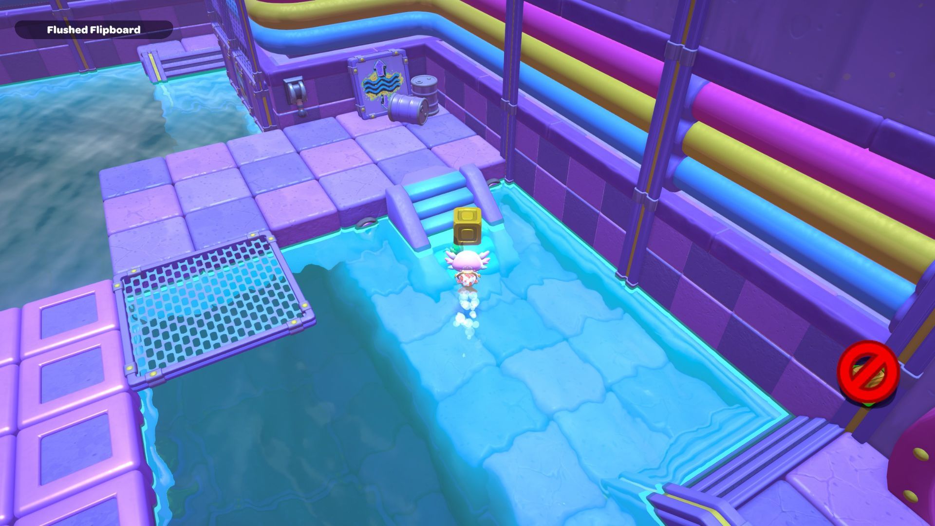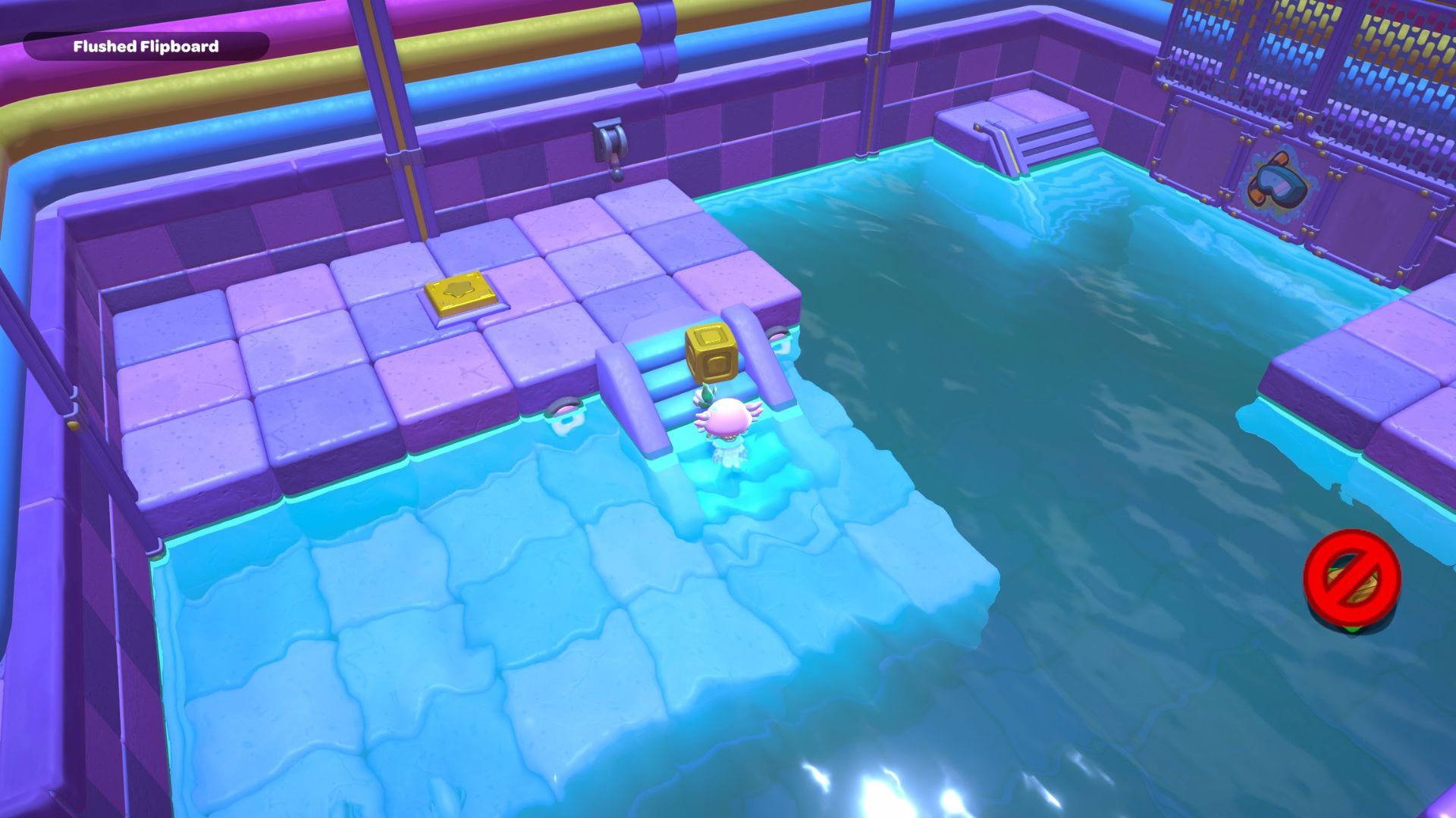First, swim to the right side of the room and look for a group of O switches that are identical to the ones you see above water. You’ll notice some switches have gold boxes, and others are blocked by gold boxes that can’t be moved. Pay attention to these immovable boxes – they tell you which switches you need to press down on the surface.