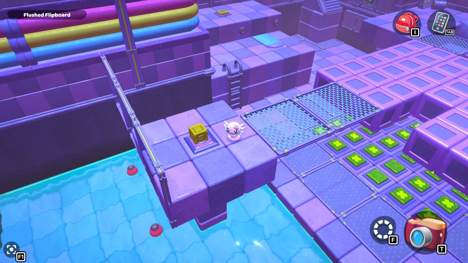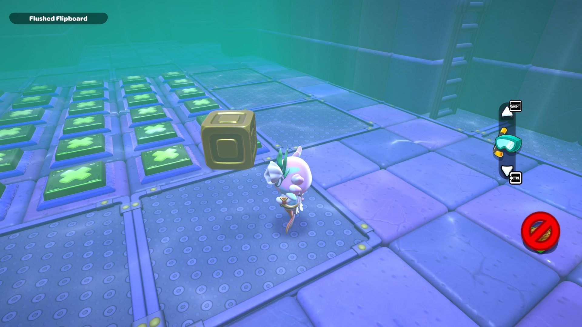 Take the red cube and swim over to the stairs near the door. Carry it across the blocks on the right side, and then put it directly in front of the tall platform that has a gold block on it. Turn on the red cube – the air it creates will let you float up to the gold block.