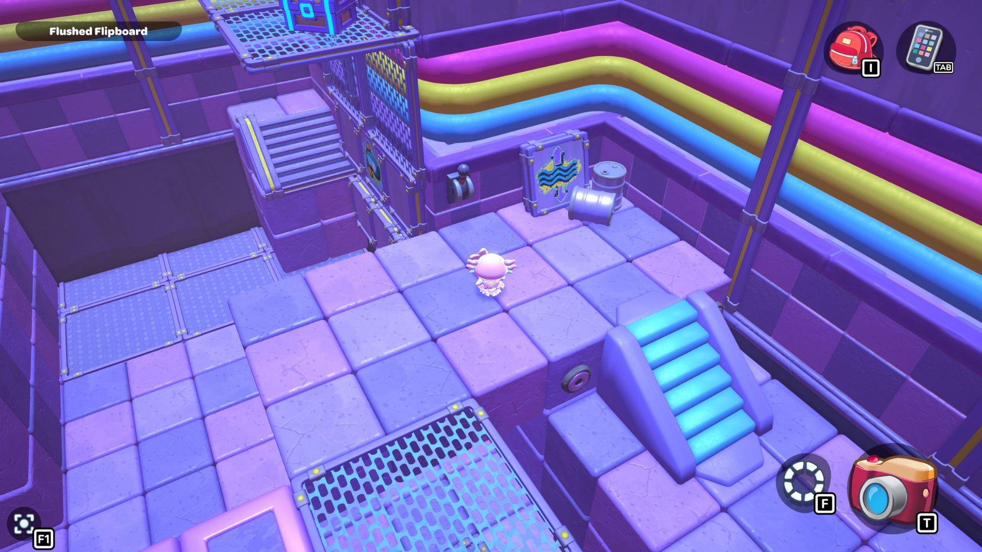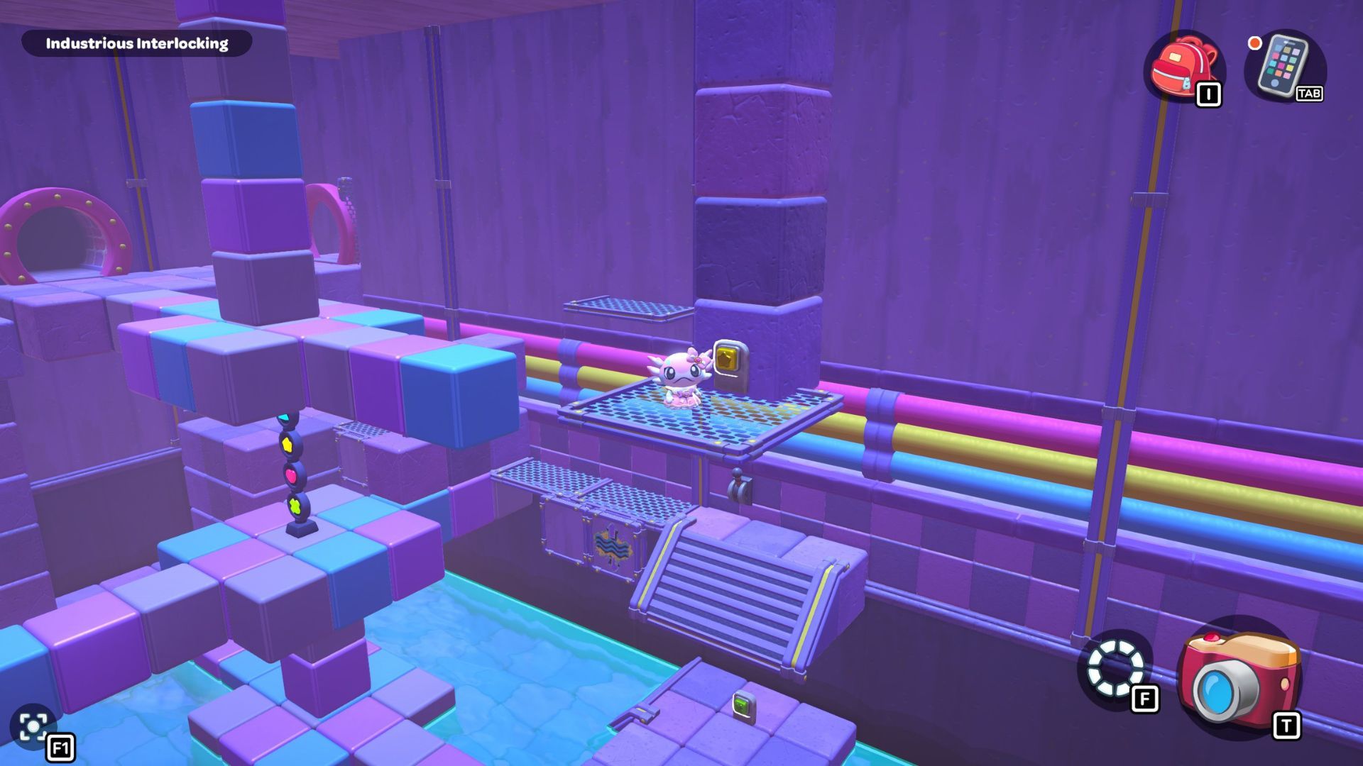 To move forward, repeat the same process to get from this platform to the one below the next set of stairs. Once you reach the stairs, place the block down and turn it on. This will create a current you can ride to reach the staircase.