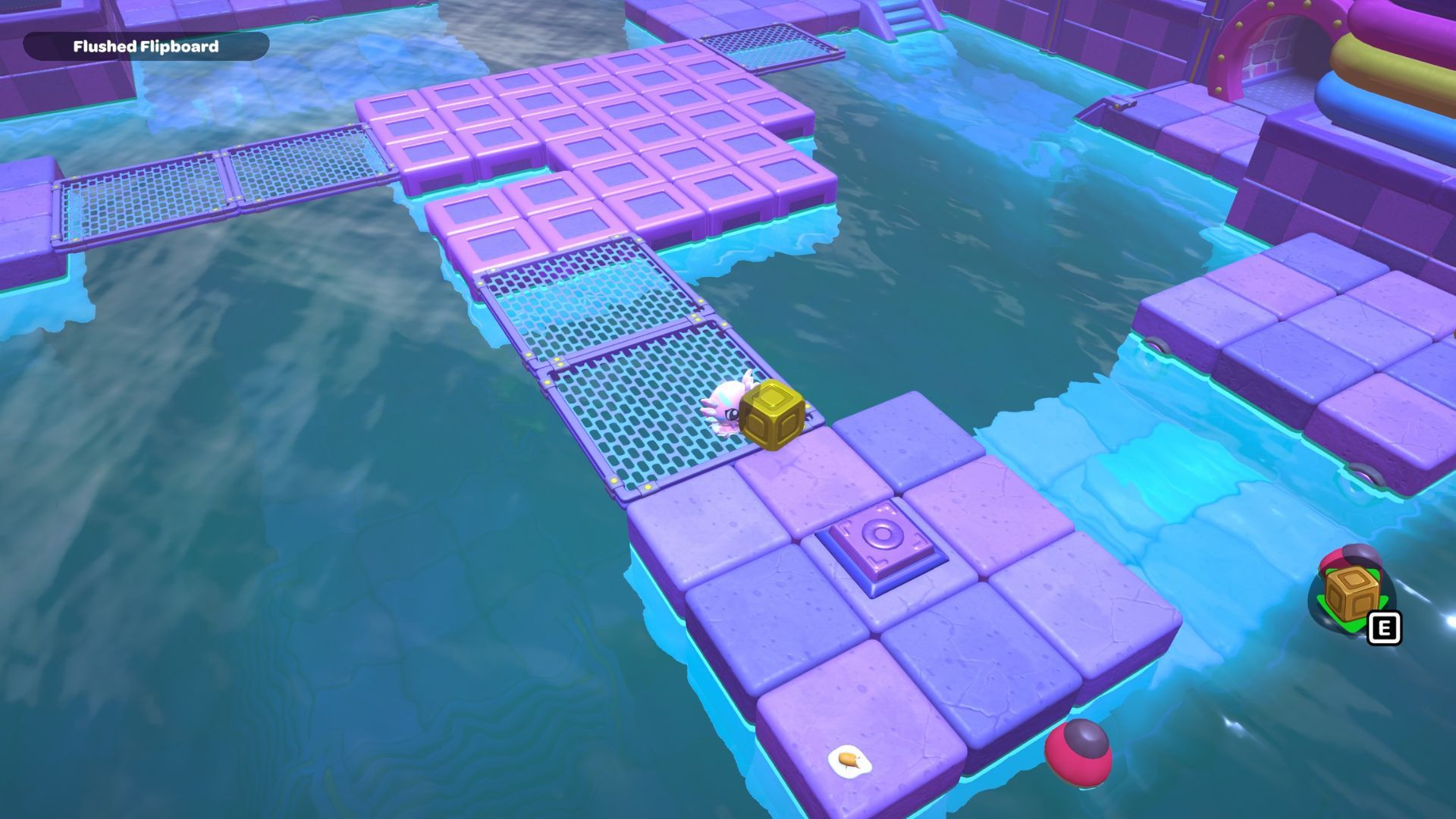 Okay, so I just snagged the final gold block. Now I’m heading over to put it on that purple switch on the right. Alright, done! Time to go back to the lever and crank the water level up again.