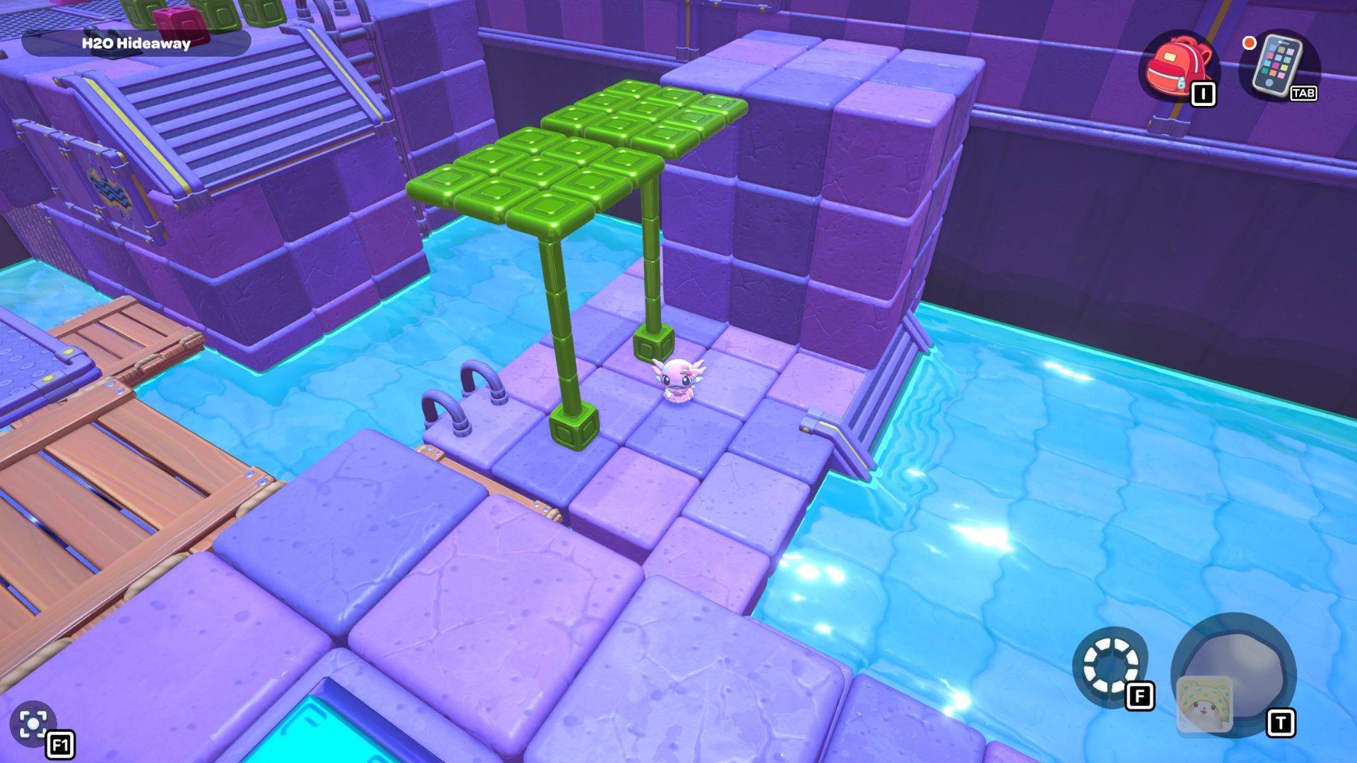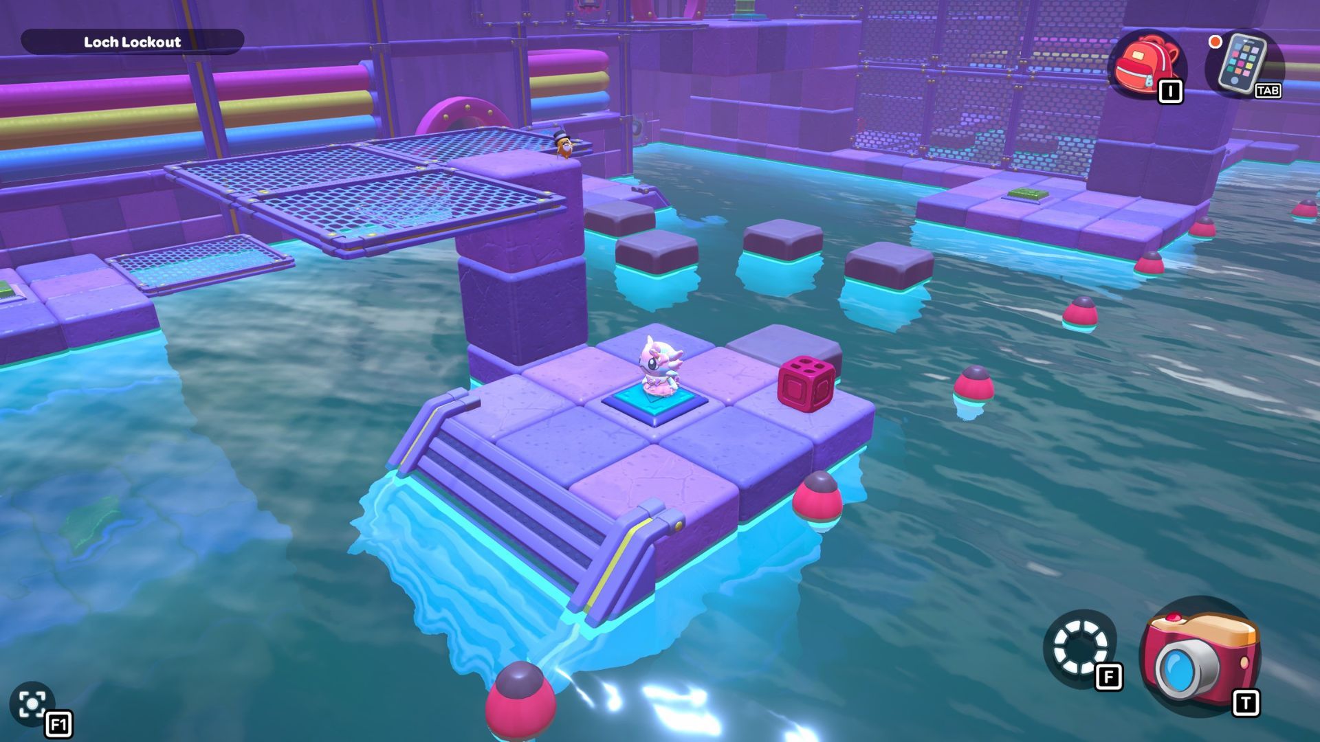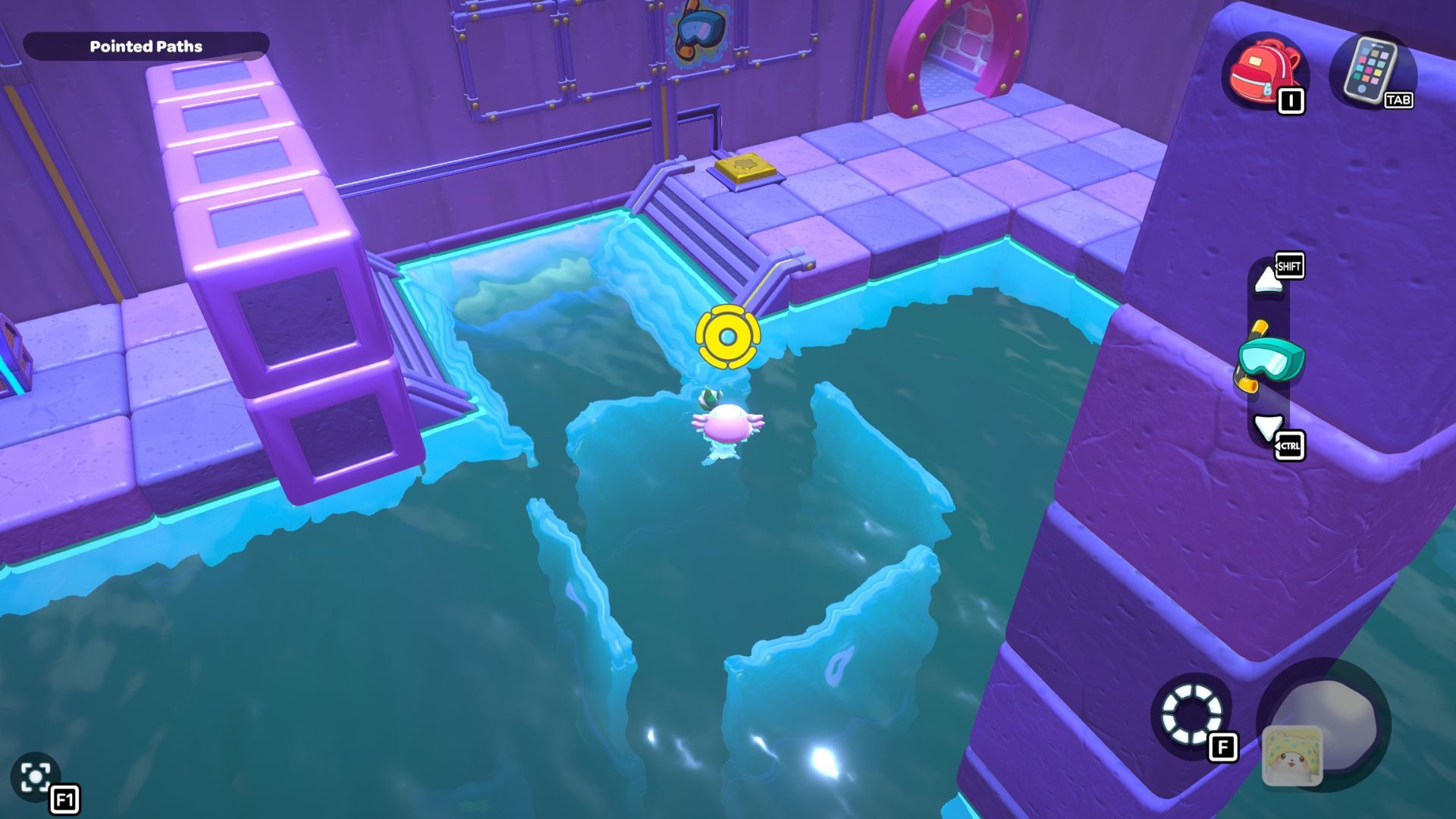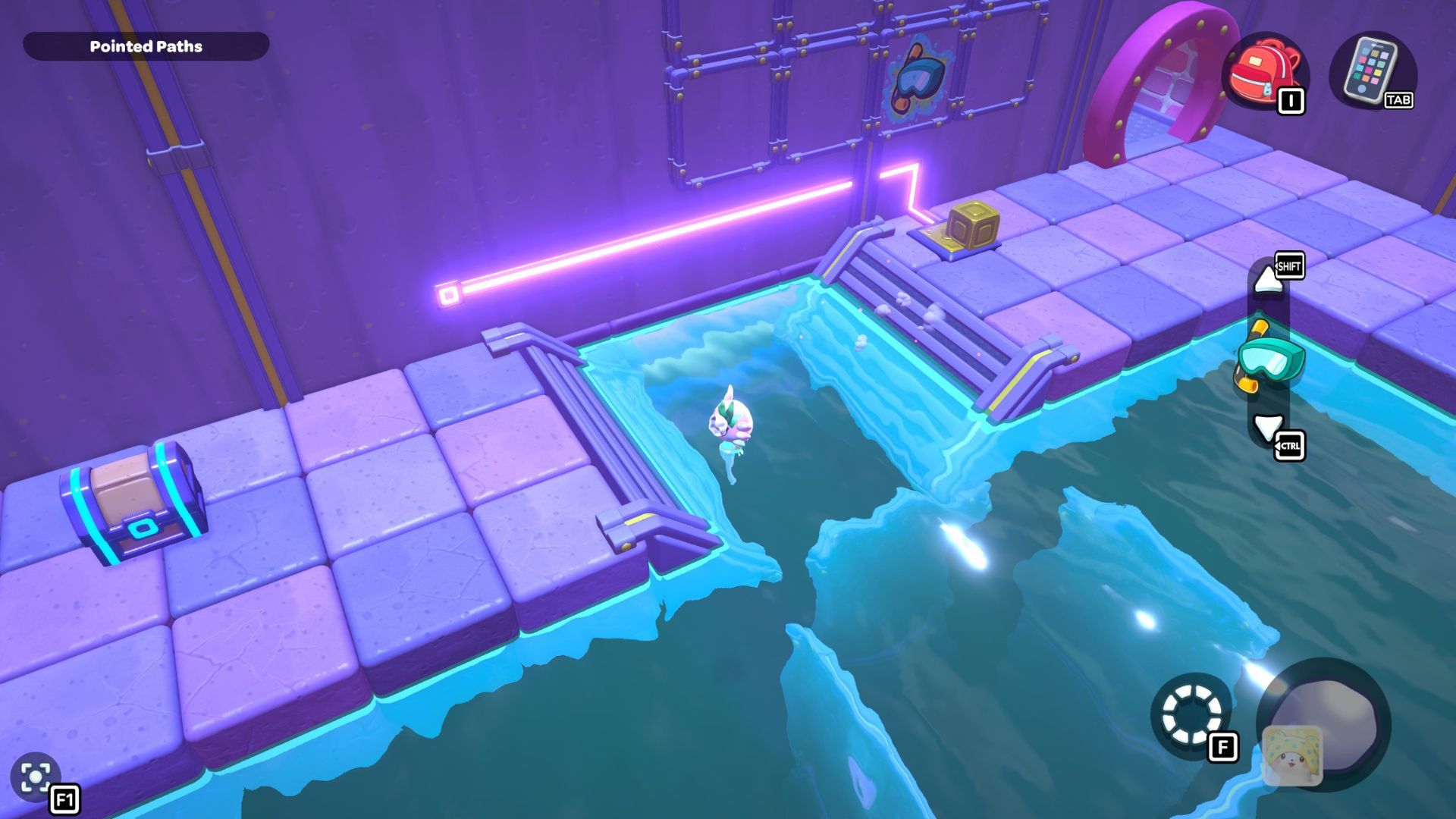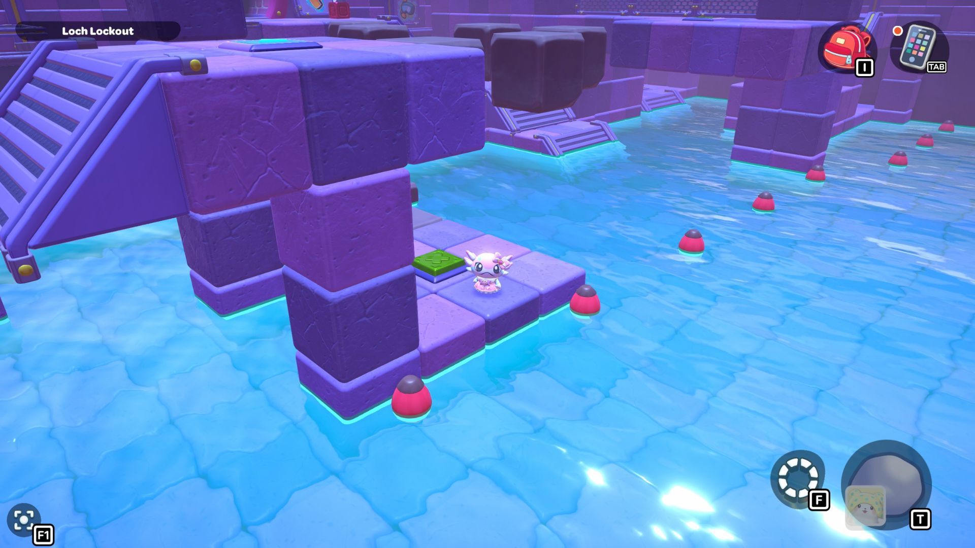 Swim in front of the stairs to grab a red cube. Carry it to the right side of the platform and use it. Then, swim up to the higher level to find a secret chest with 20 Sticks inside.