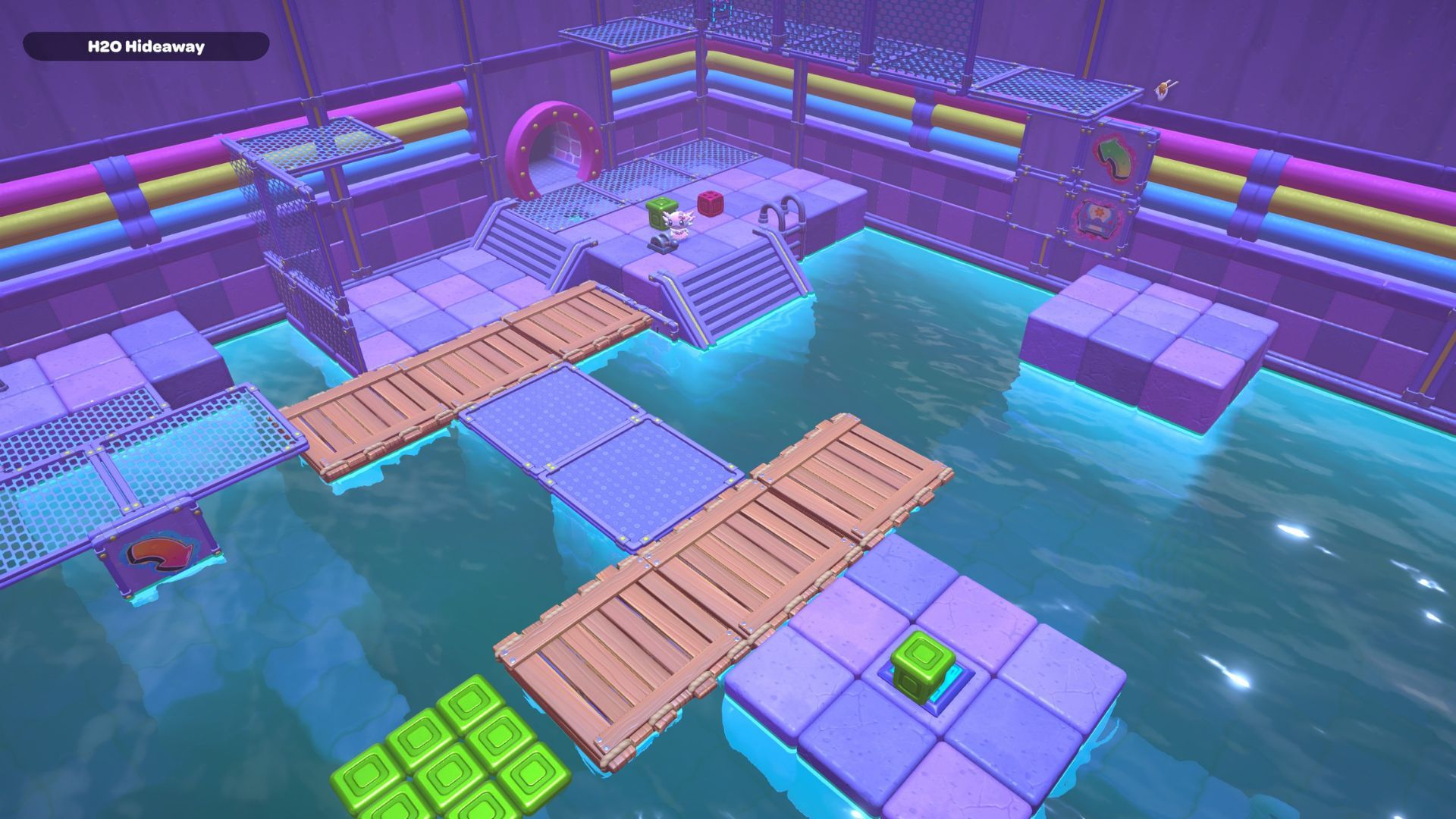 Grab the cube and carry it up the stairs on the right. Set it down, then swim back to the hole and enter from the right side. Once inside, pick up the green cube and bring it to the same platform where you placed the first cube.