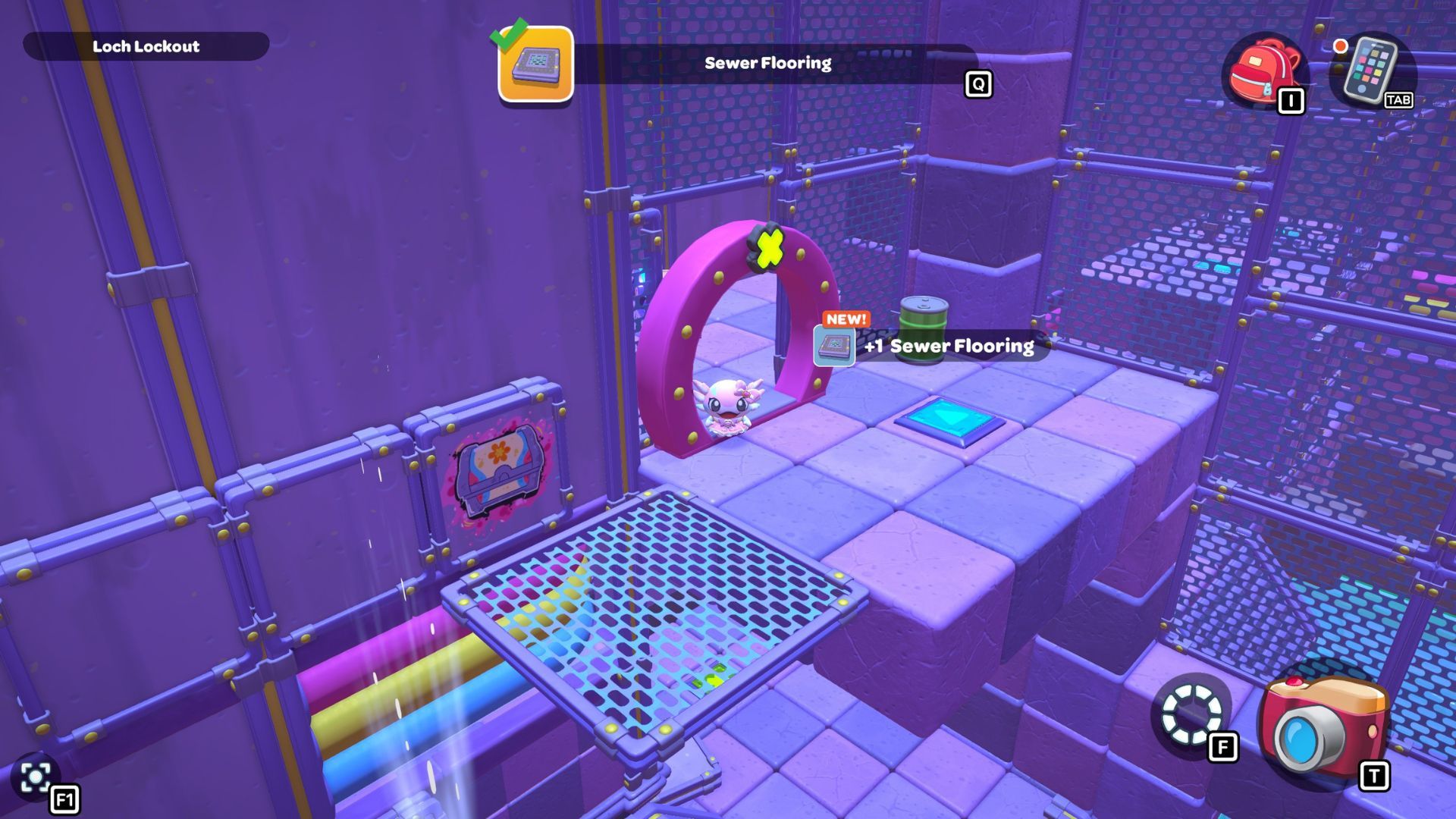 Once you activate the last switch, the X gate above the starting platform will open. Float up to this new platform and open the chest behind the gate to find the Sewer Flooring item.