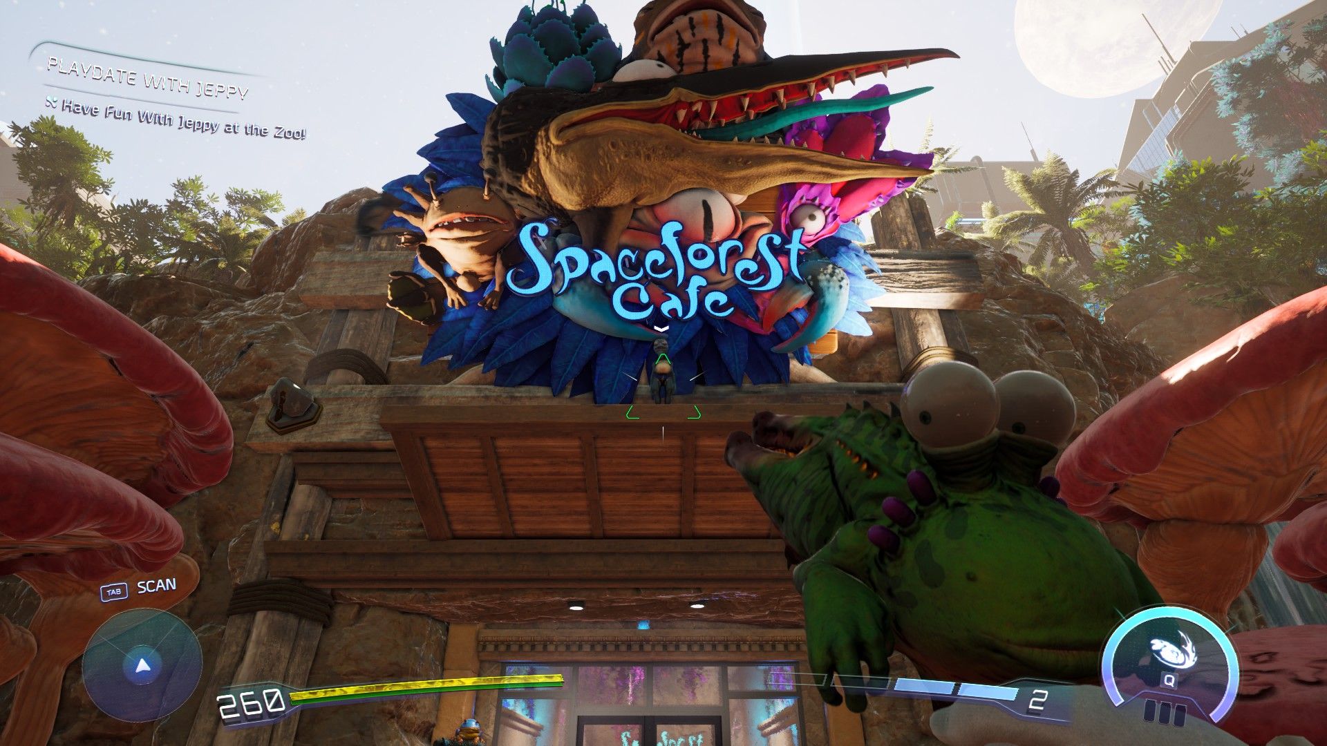 The third spot is a little tricky to locate, but it’s still nearby. It’s the Spaceforest Café, located across from the Gift Shop, just outside the square and up a level – you might remember it as where your mom took you for that awkward family dinner. You’ll see Jeppy right in front of the café’s sign, and you’ll need to use Gus’ vacuum power to bring him down.