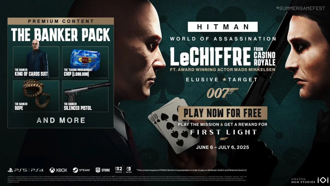 The strongest demonstration of this can be seen in the recent collaboration between games, 007 First Light and Hitman: World of Assassination, where a fresh Elusive Target mission has been incorporated. In this mission, Agent 47 is tasked with tracking down and eliminating Le Chiffre from the Casino Royale storyline. Mads Mikkelsen reprises his role as Le Chiffre, initially portrayed in the 2006 film adaptation of Casino Royale. From June 6 to July 6, players who engage with this Hitman mission can unlock unique rewards within 007 First Light.