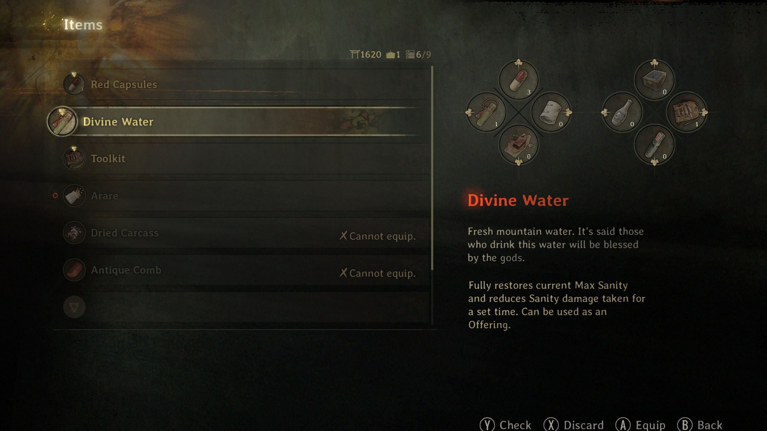 - Consume items like Divine Water or Ramune to restore max Sanity.