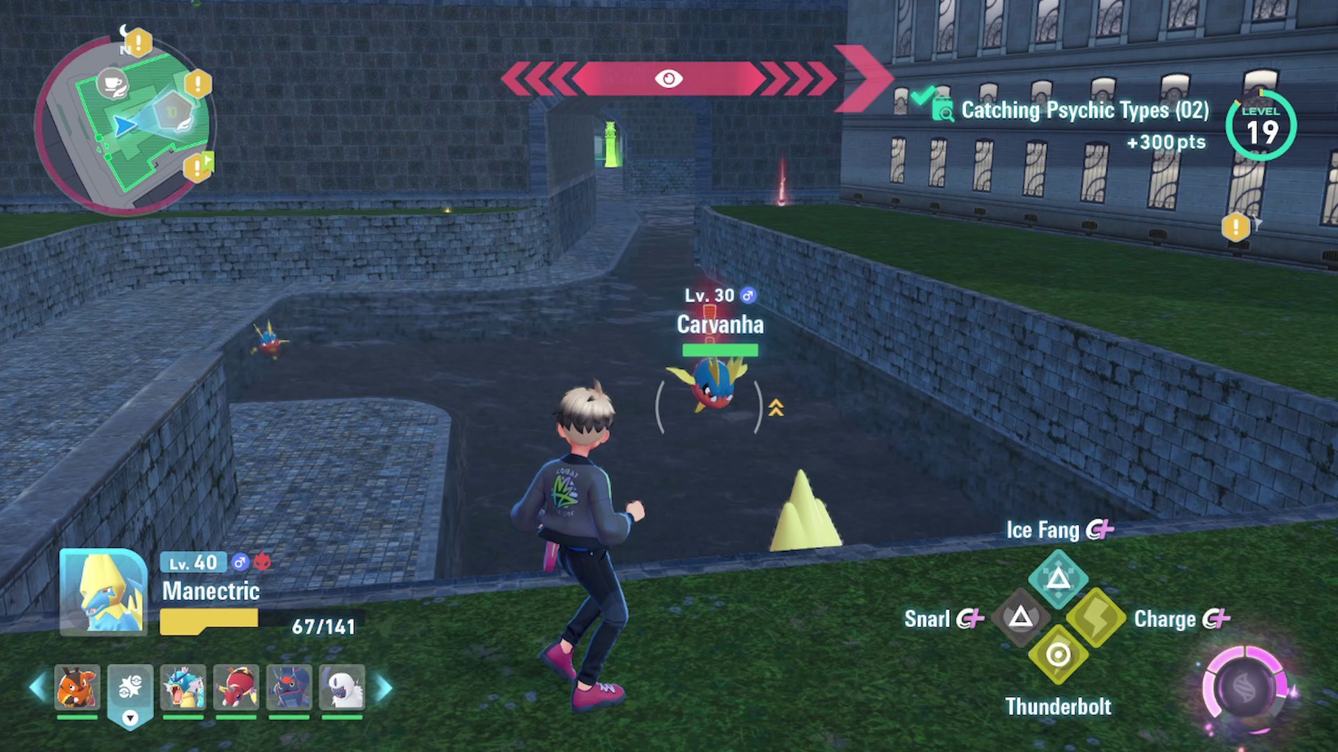 Beyond the grassy area, you’ll find a large pool filled with Carvanha Pokémon. Be careful – these Pokémon are very aggressive and will leap out of the water to attack! Using a strong, long-range Electric-type attack, like Thunderbolt, is a simple way to defeat them.