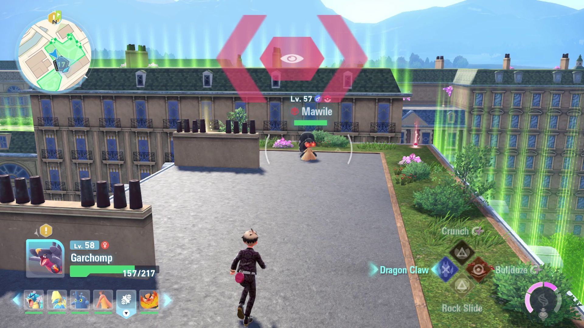 You can find a level 57 Alpha Mawile on the rooftops, close to the chimneys. It appears near where Klefki spawn, but it’s possible to sneak past it if you’re cautious.
