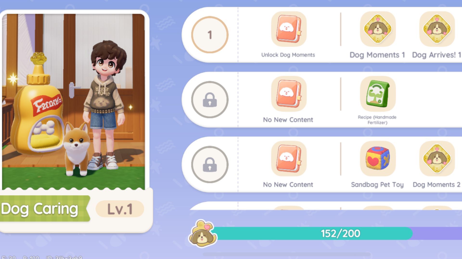 As you gain experience with the Dog Caring hobby, you’ll unlock special benefits. Here’s a breakdown of each level and what you’ll receive: