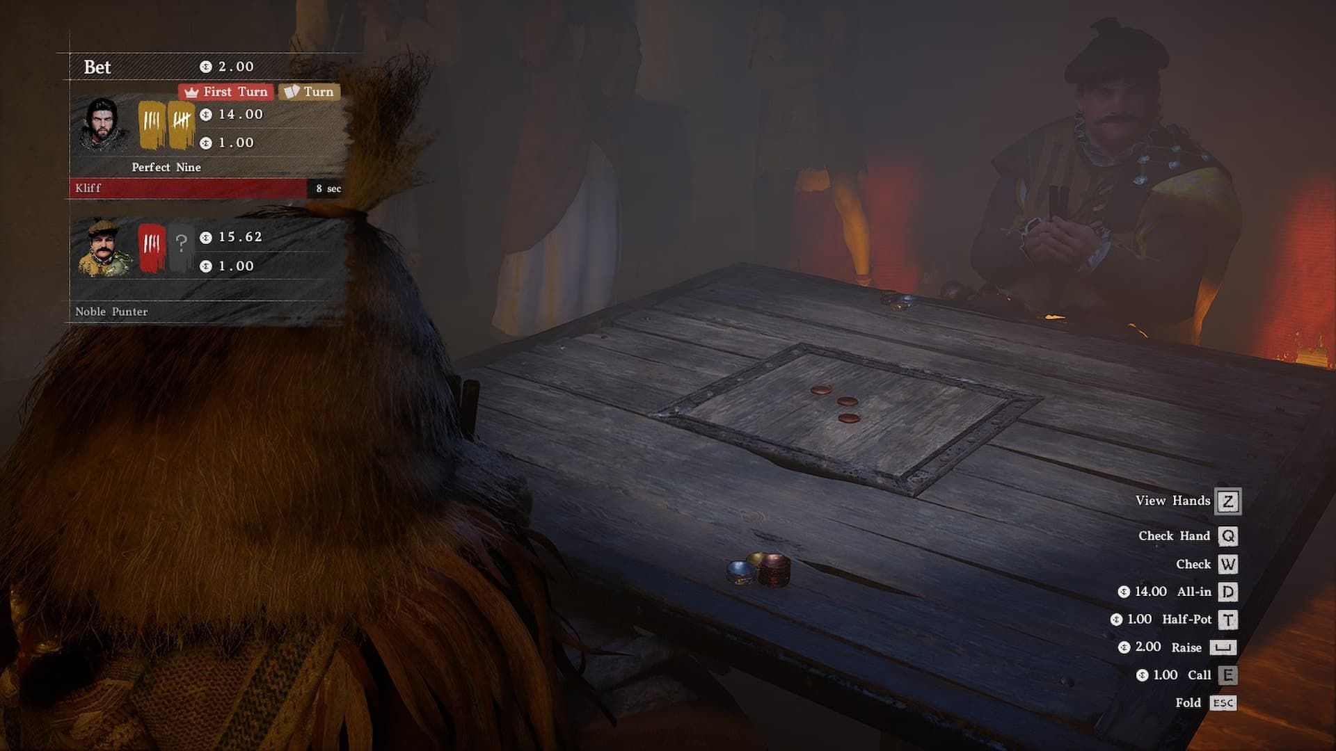 Okay, so first you need to head to the gambling den in Hernand castle town β it’s upstairs in the tavern. You can’t miss it, there’s a tough-looking guy guarding the door. Go inside and just grab one of the empty stools at the gambling tables to get started. The game they play here is called Duo β it’s kinda like Poker, where you’re trying to get a better hand than everyone else.