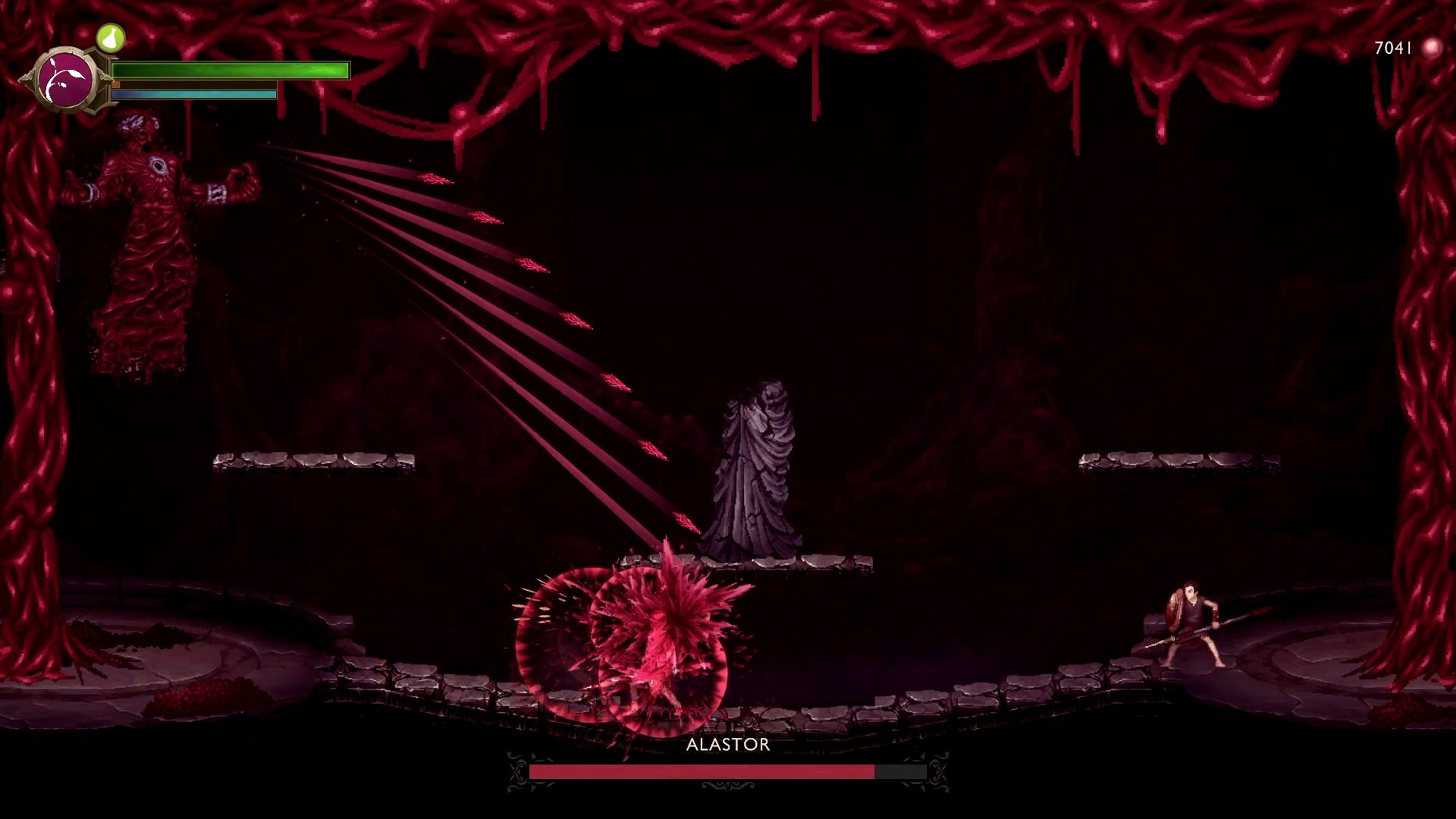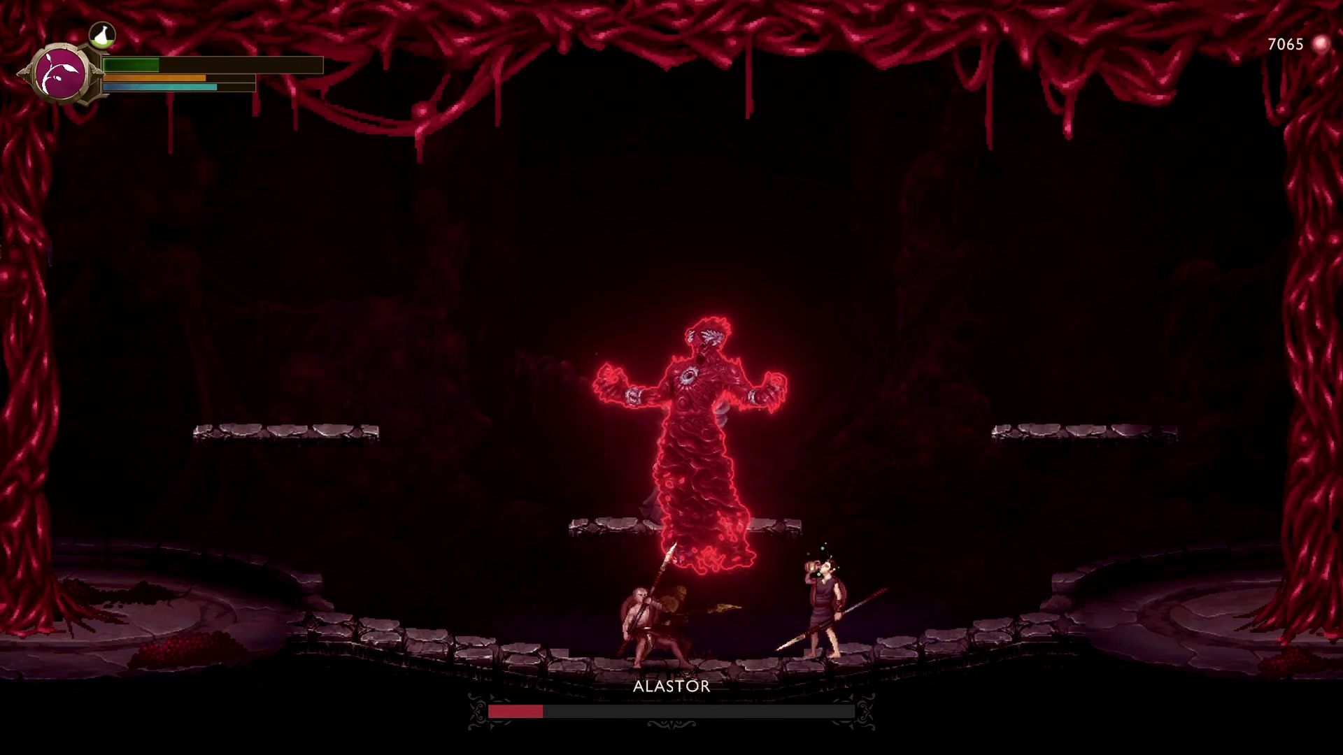 Phase 2 starts when Alastor’s health reaches about 60%. He’ll fly to the center of the screen and shoot a lot of red projectiles. To avoid damage, quickly and repeatedly press the block button while standing directly under him – Kratos will parry most of them. After the projectiles stop, focus on destroying the red orbs.