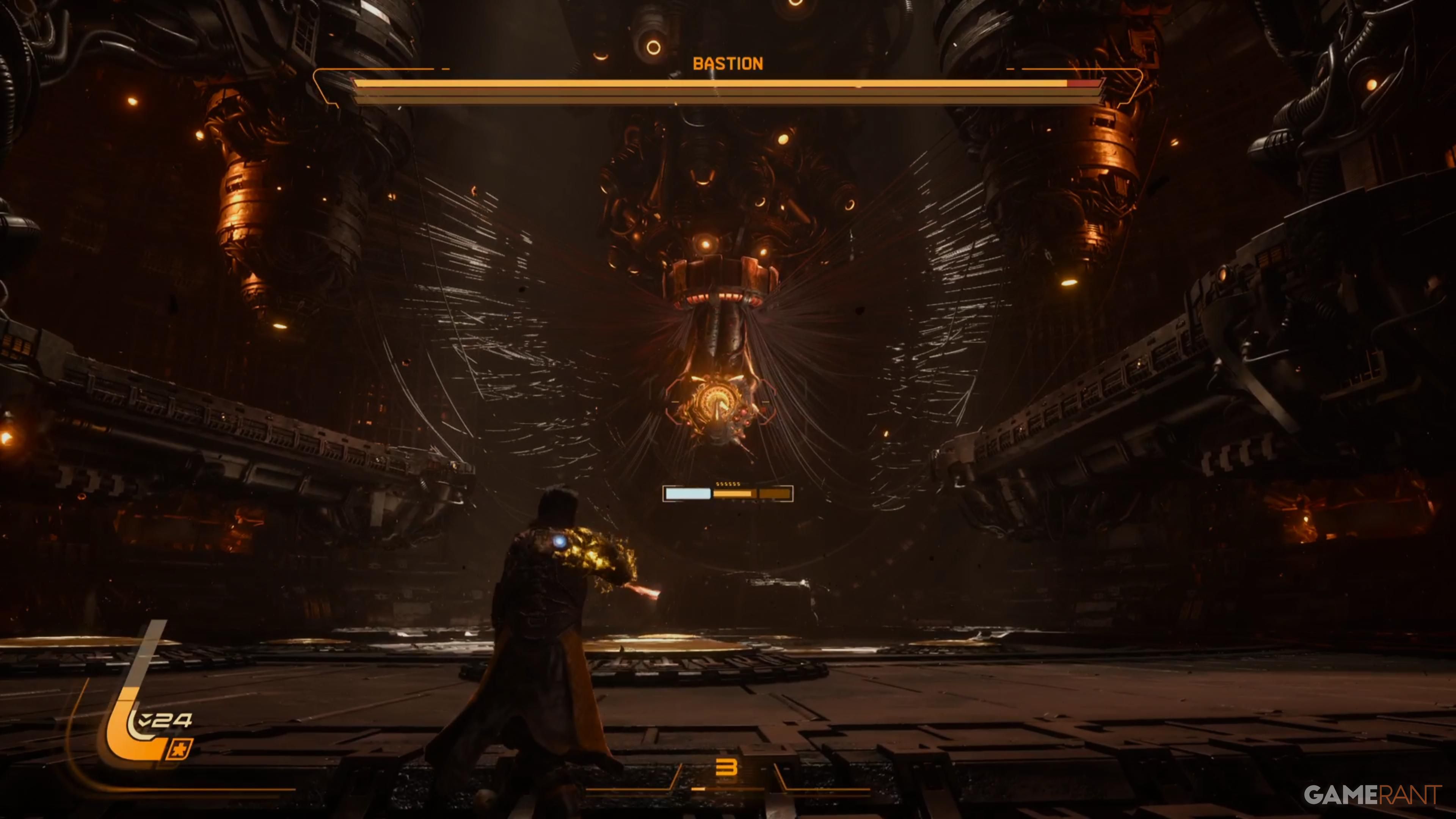 When you enter the boss arena, you’ll see several Jump Pads that will be useful during the fight. The boss is a machine with a visible head, making it easy to target while you dodge. If the boss shoots blue projectiles, block with your shield. If they’re yellow, use your dash to get out of the way. When the boss, Bastion, creates expanding yellow rings, use the Jump Pads to quickly gain height and avoid them.
