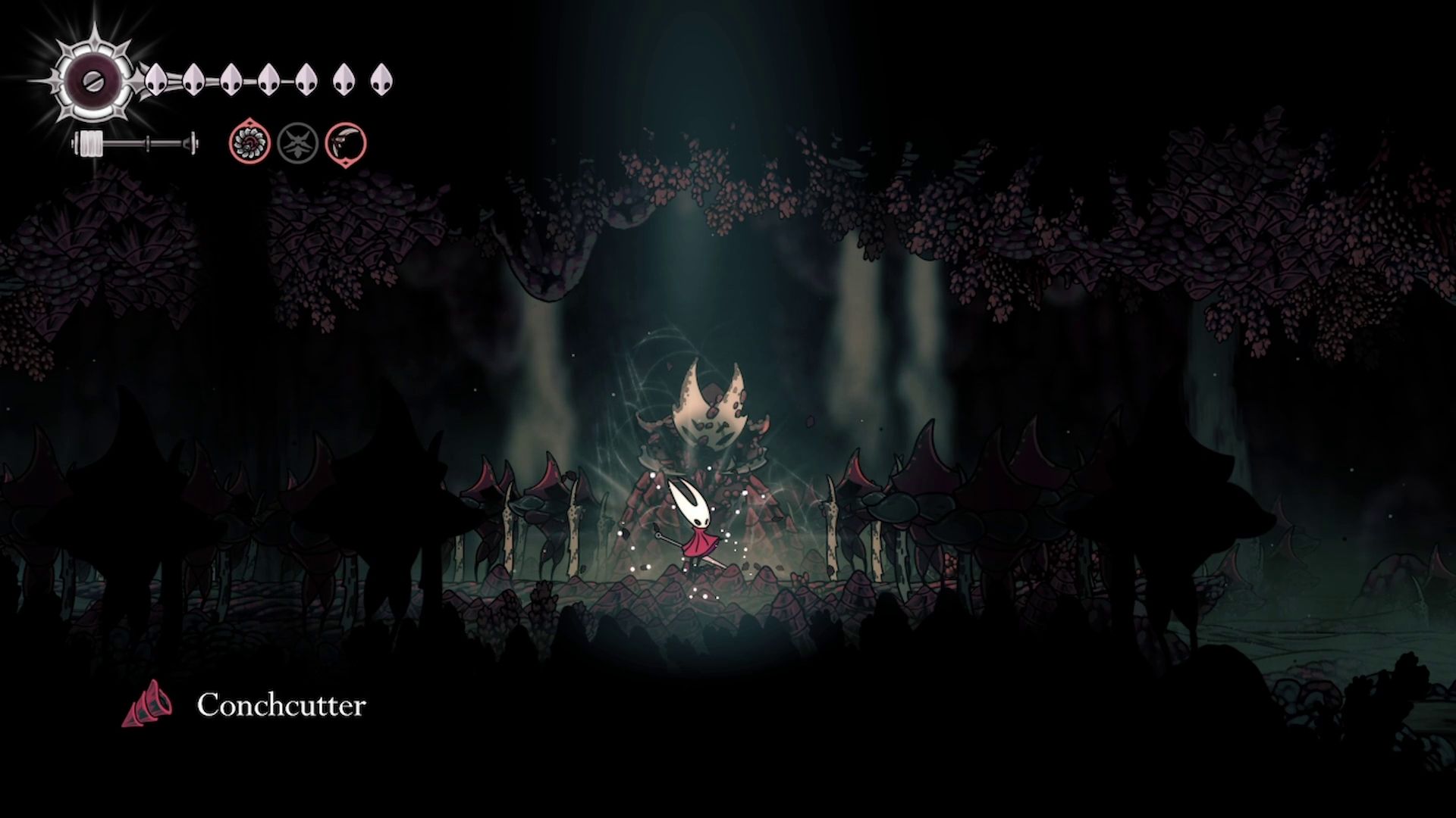 Once you defeat the Raging Conchfly, a new path opens up to the right. This leads to a large room containing a hut. Inside the hut, you’ll discover a Red Tool that functions similarly to the boss’s Cone Spit attack. If you continue to the right, you’ll also find a small, hidden room where Hornet can rest on a bench.