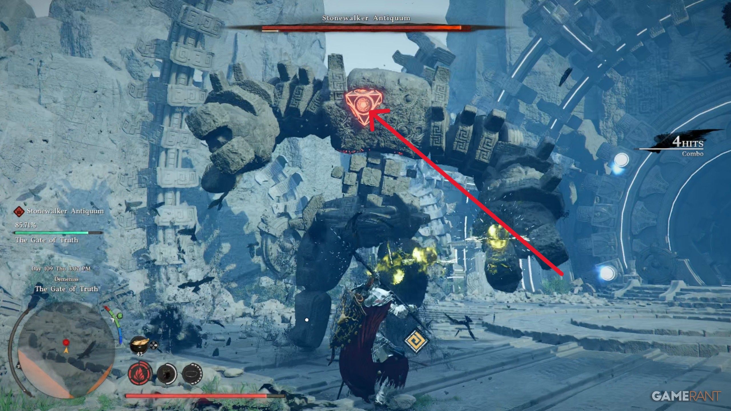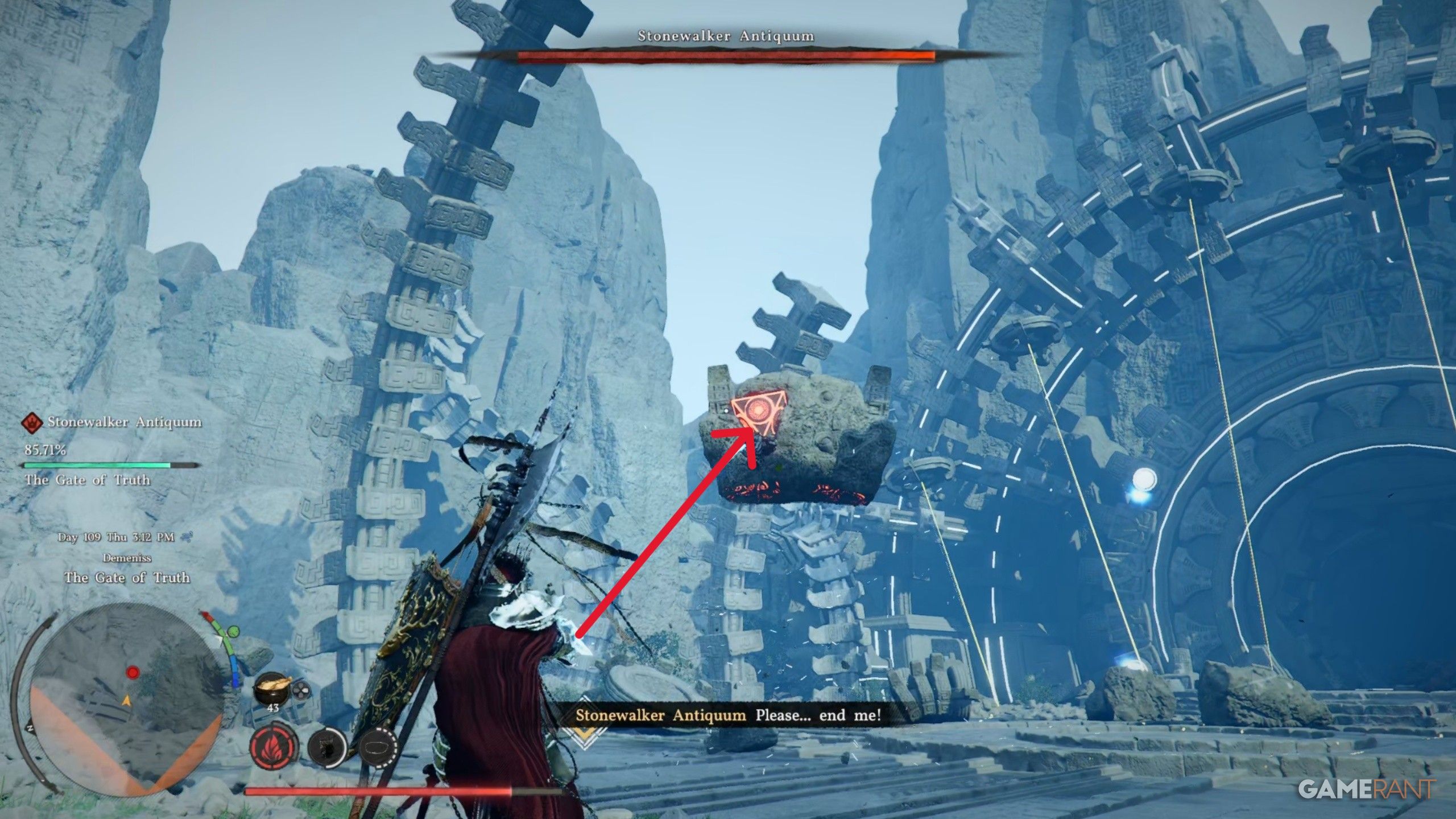 - Stonewalker Antiquum’s second phase has his head fly up, making him harder to hit; however, this won’t last for long.