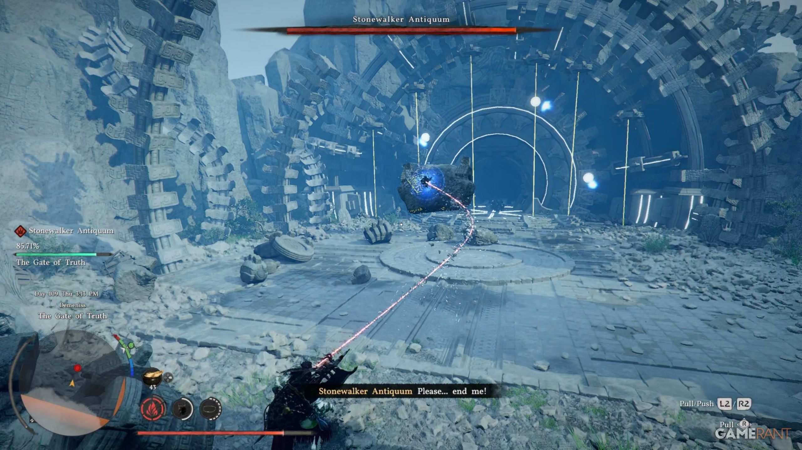 - Stonewalker Antiquum will attempt to shoot laser beams at you, so make sure you’re rolling out of the way of these attacks.
