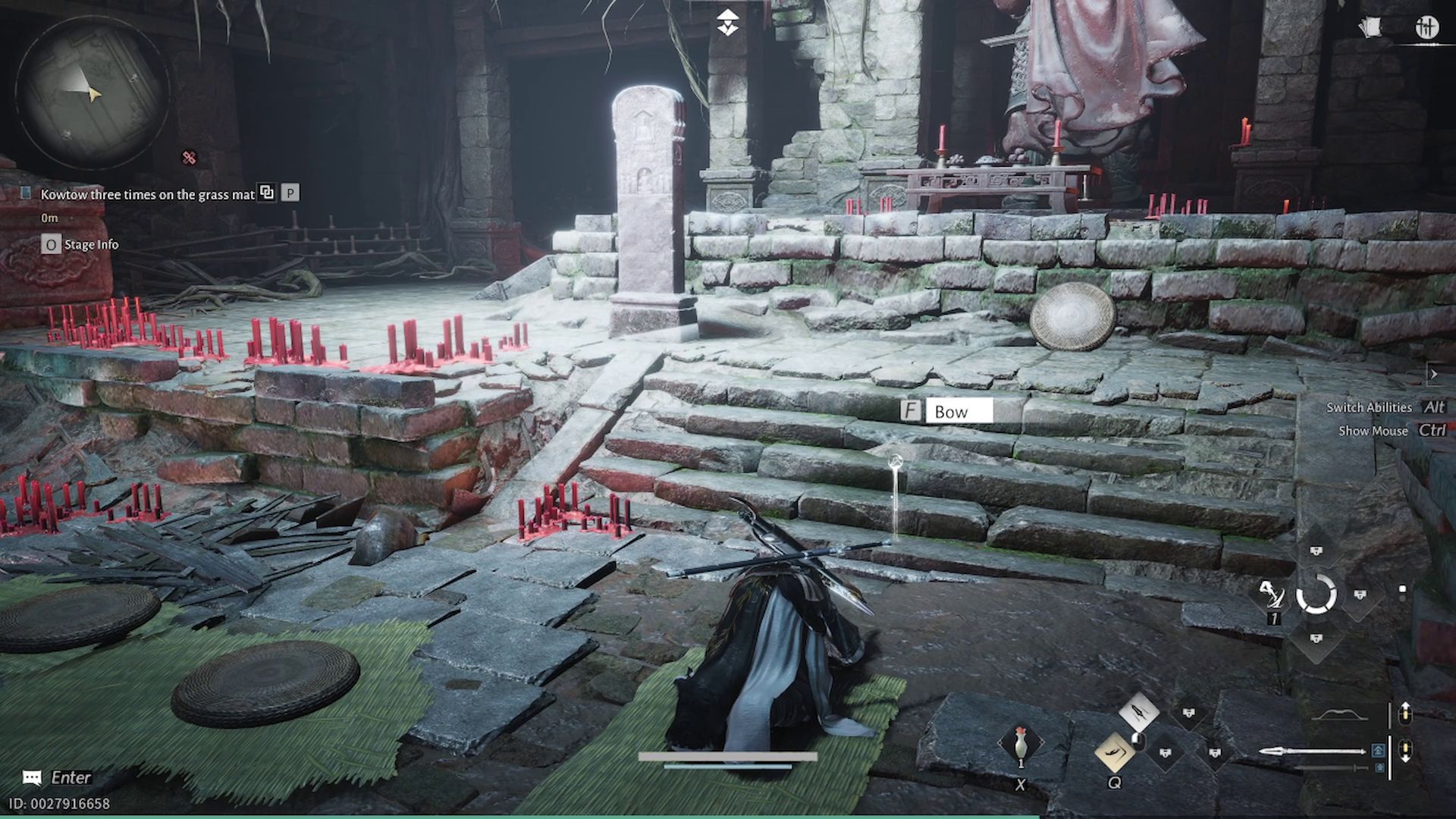 To bow, walk up to the grass mat until you see the “Bow” prompt appear on screen. Then, press the interact button (F on keyboard or R2 on a controller) to begin bowing. You’ll see a bar showing how long the action takes.