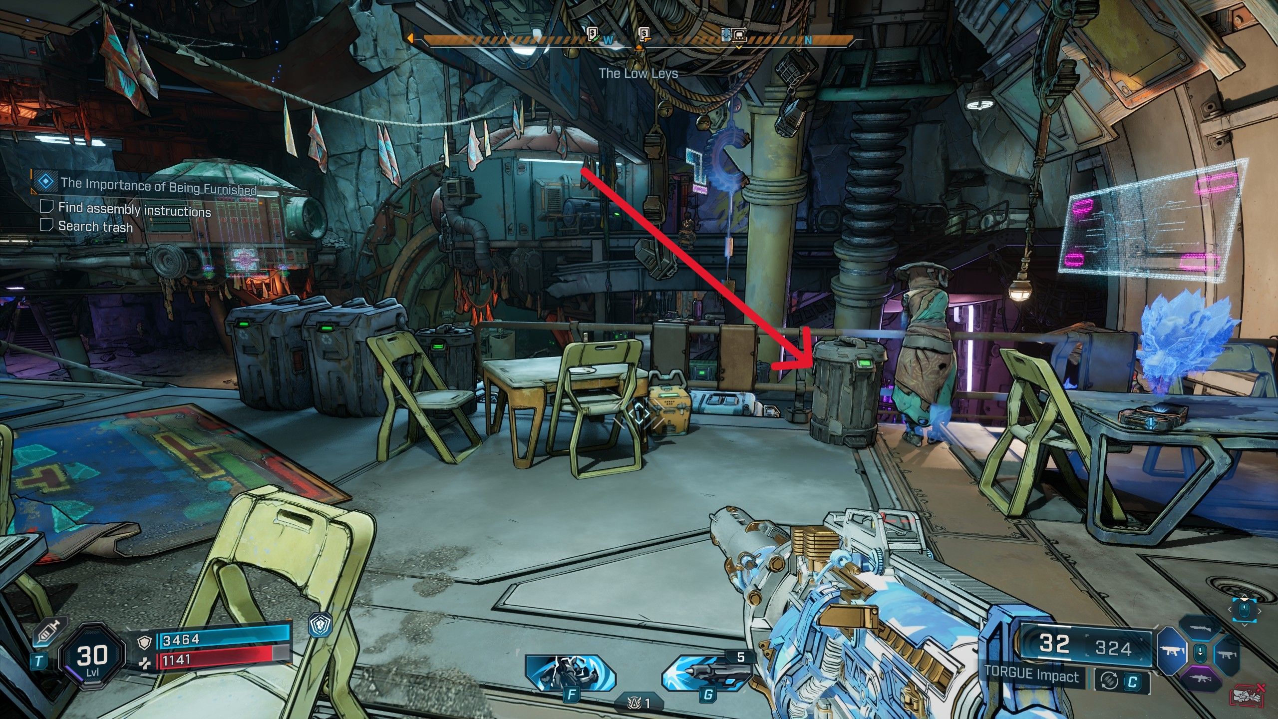 - Search trash – Head to the floor above the vending machines and search the trash can on the railing opposite the weapon vending machine.