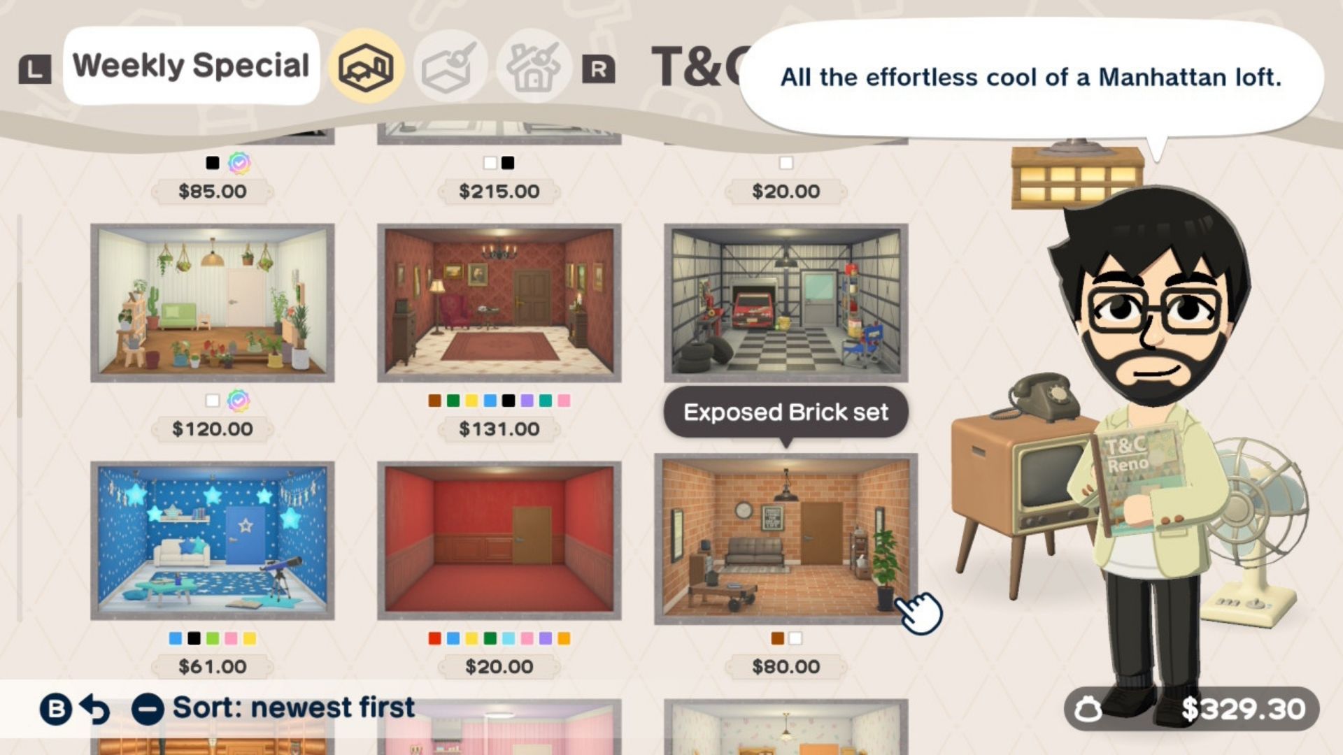 Next up is T&C Reno Home Supply, where you can decorate your Mii’s house with different interior design options. They have a good range of styles available right away, and a new special selection each week.